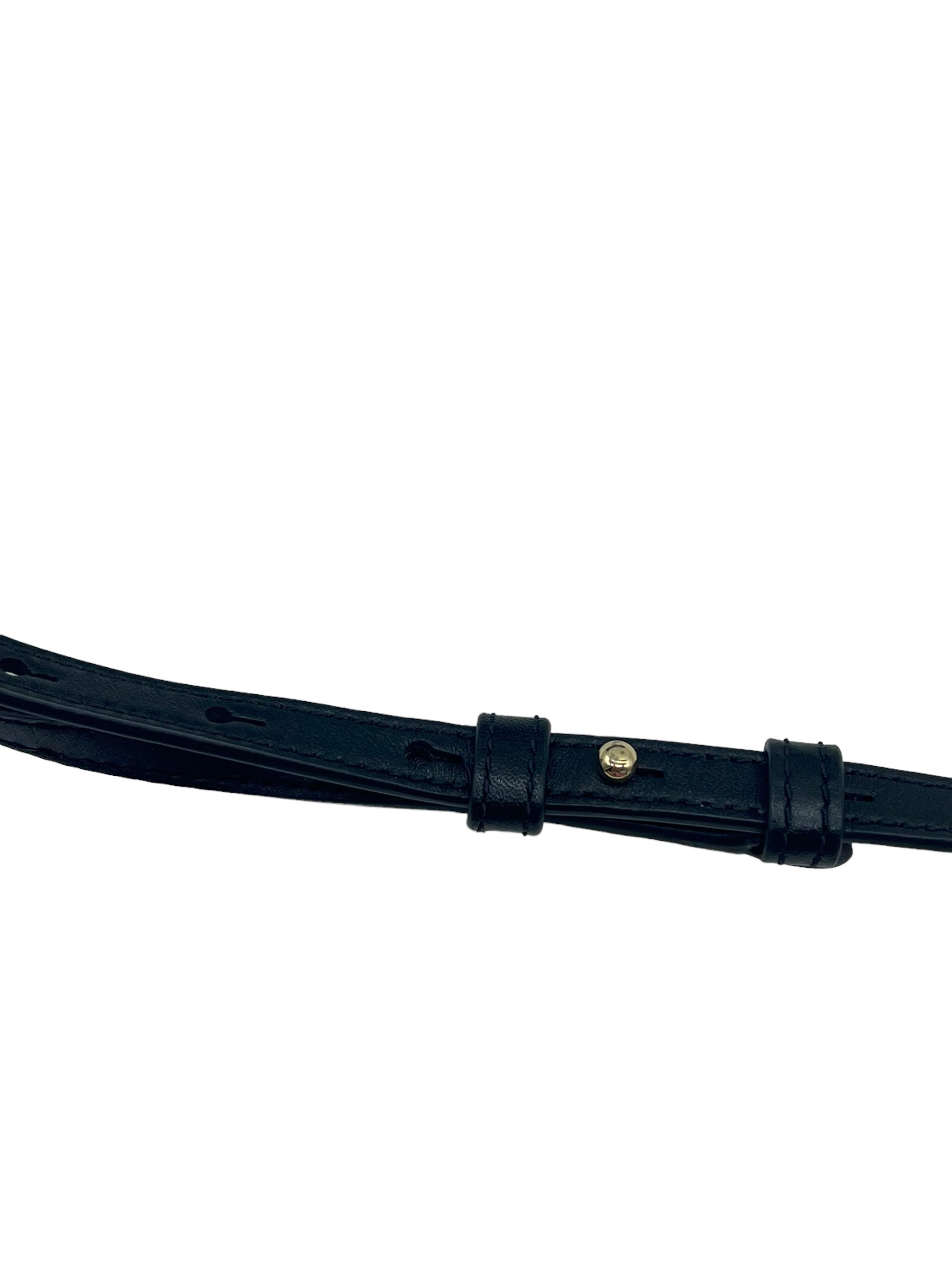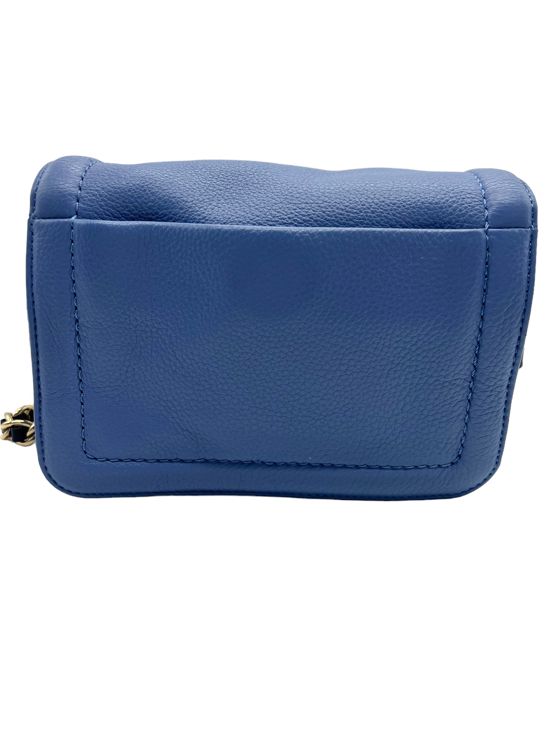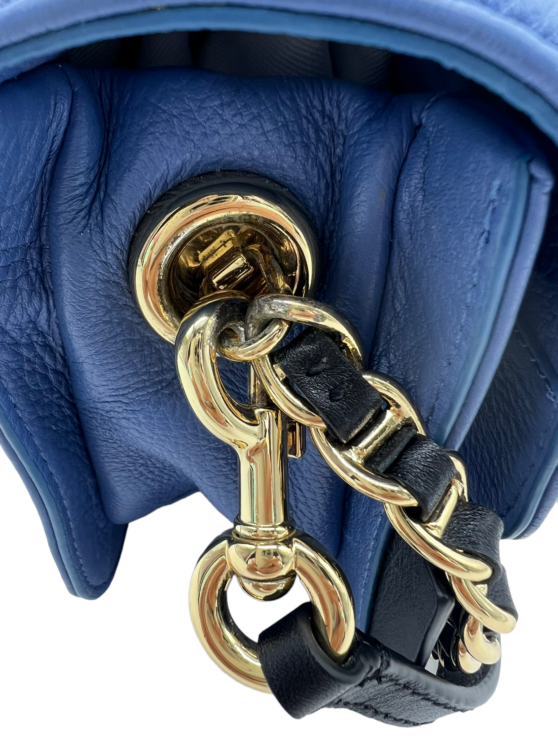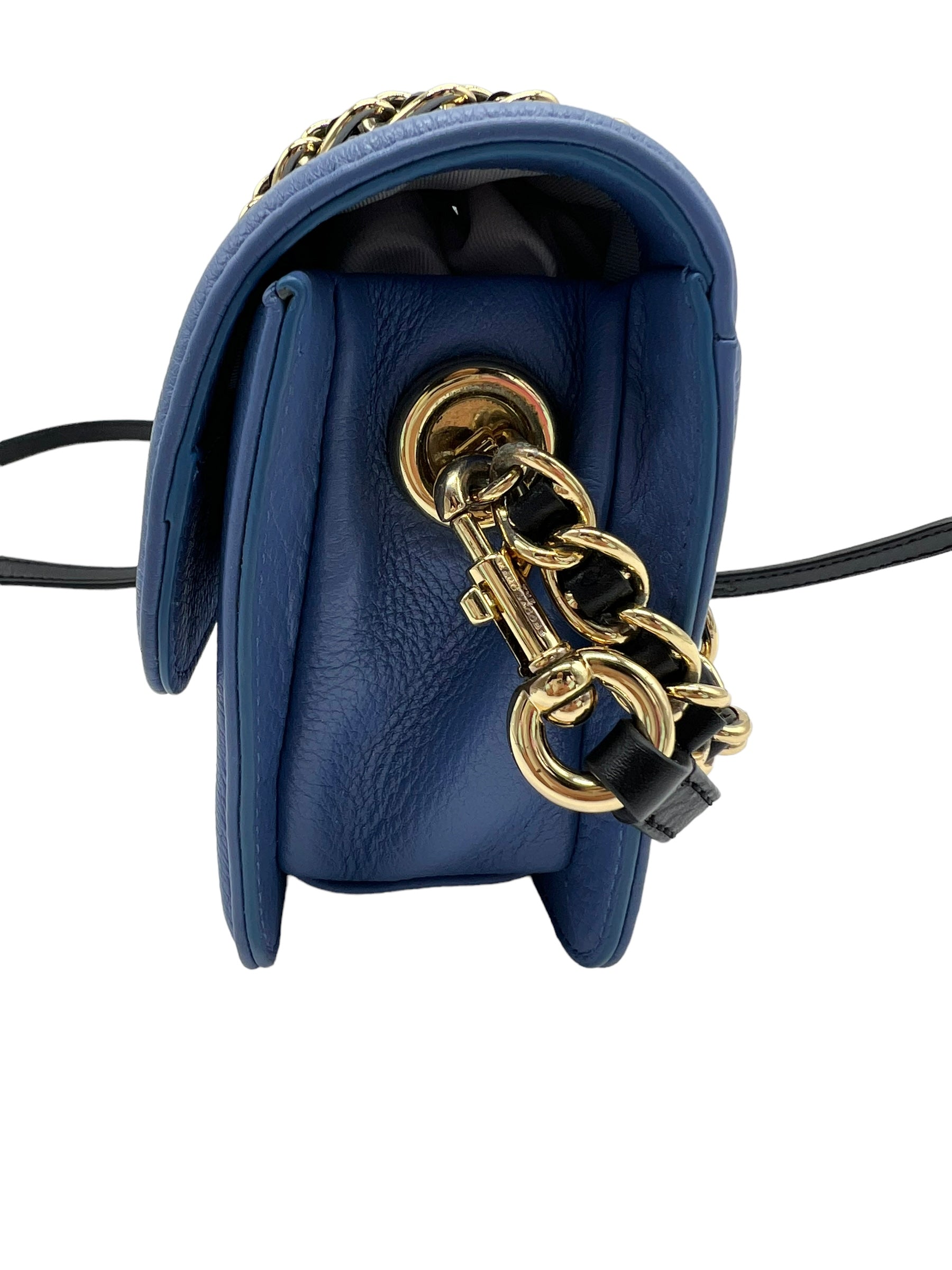 Blue leather magnetic flap The Mini Cushion chain shoulder bag/crossbody with gold hardware and black strap/trim. Comes with detachable adjustable long strap. Does not come with dust bag.