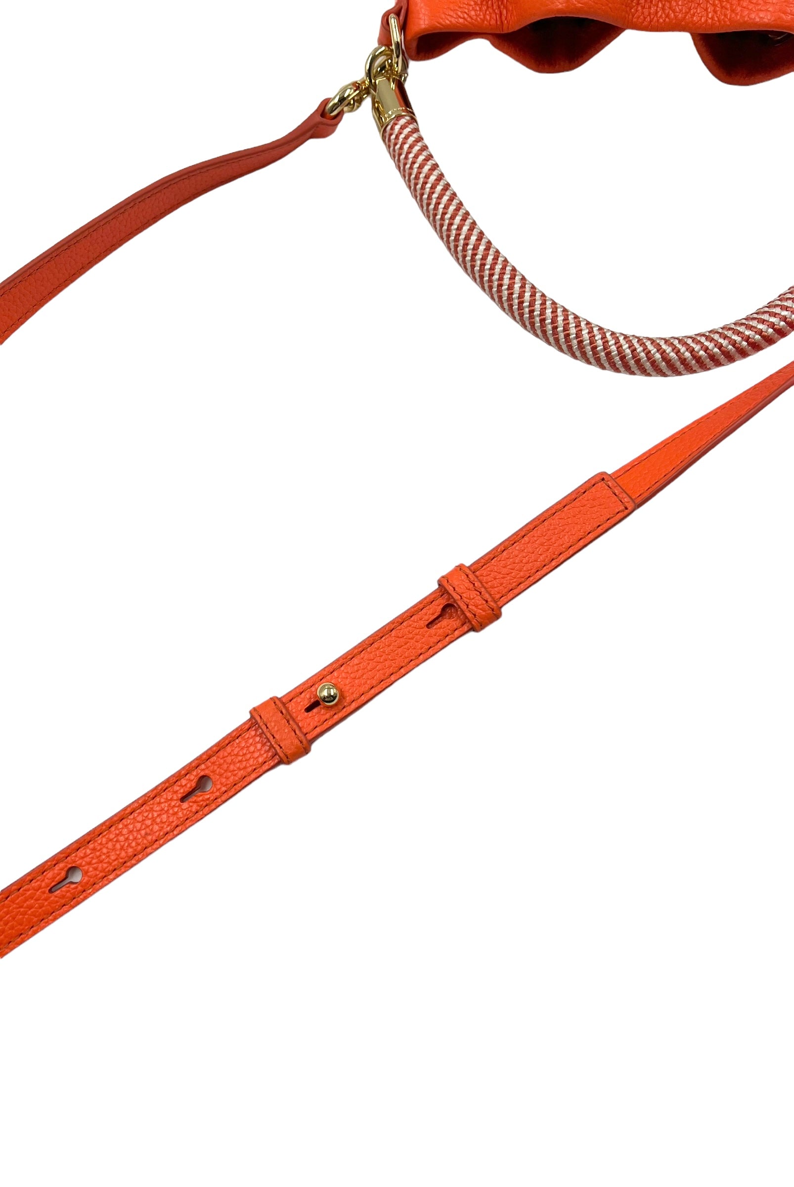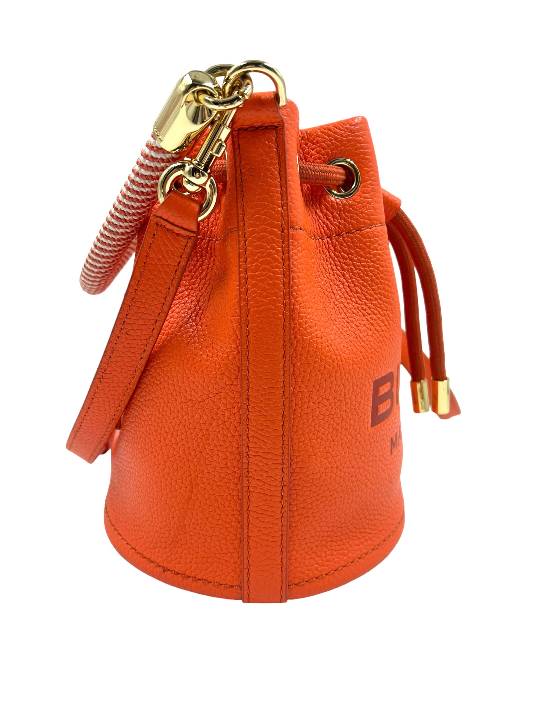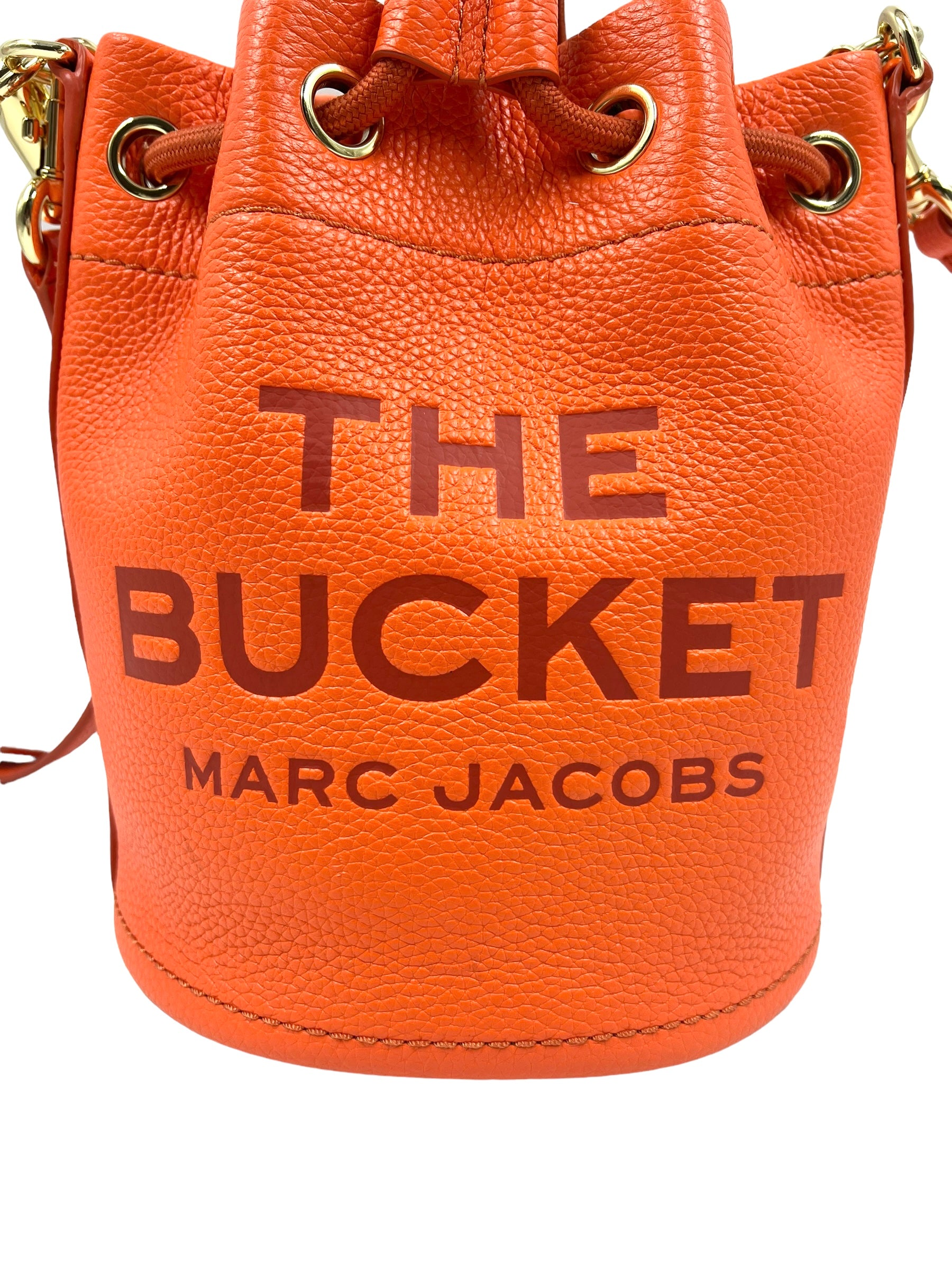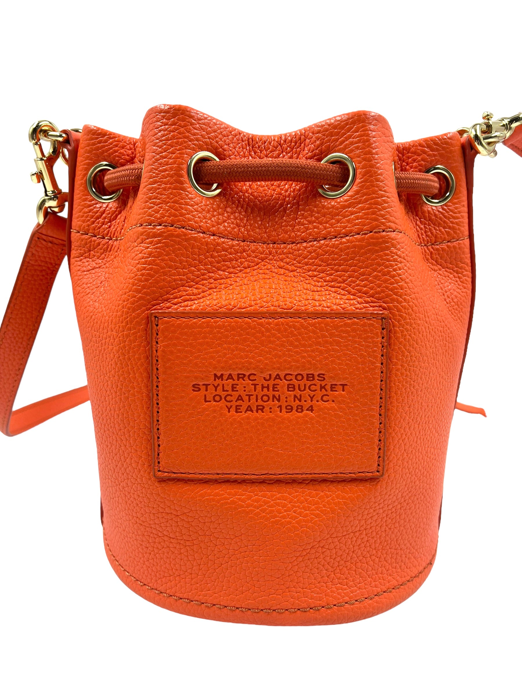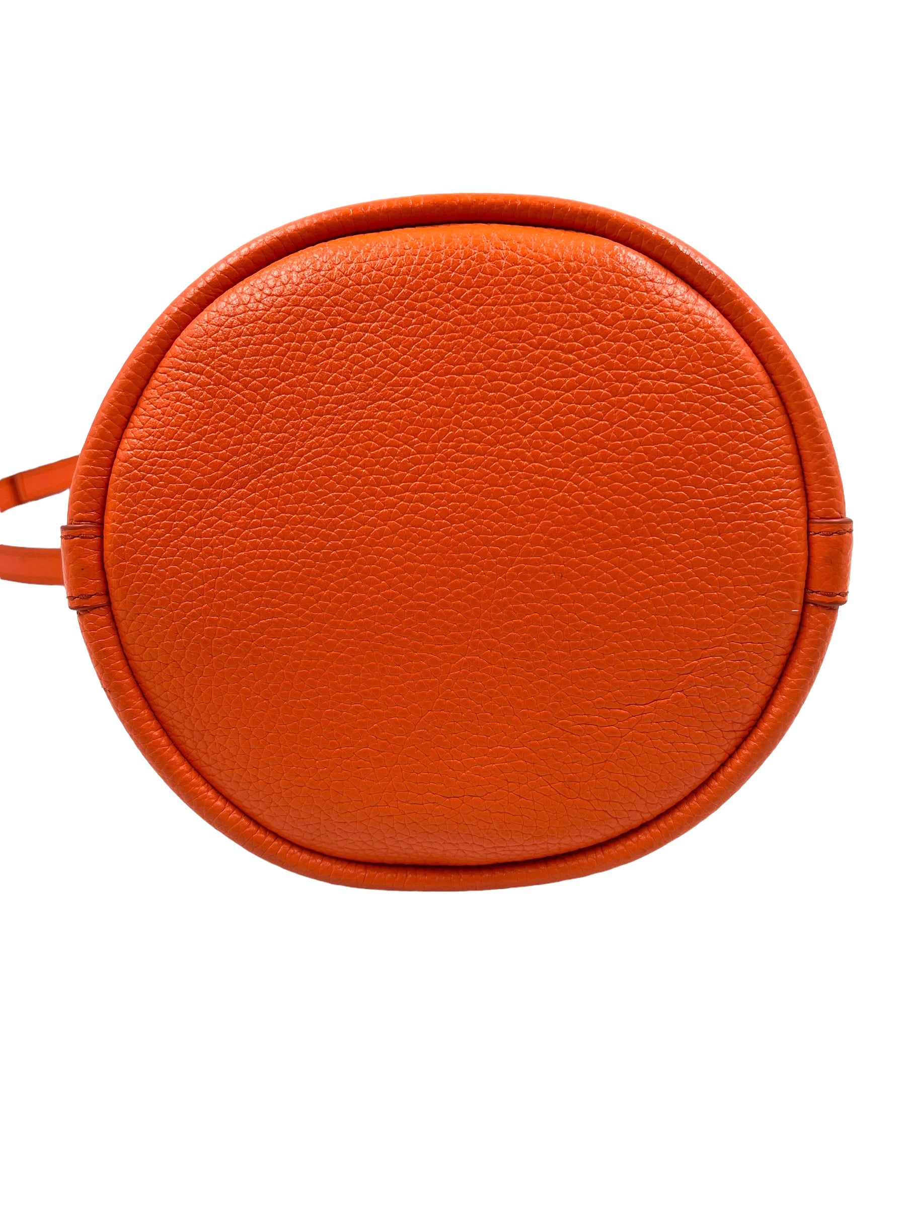 Electric orange grained leather 'The Bucket Bag' with gold hardware and embossed logo. Features woven handle, removable/adjustable long strap and drawstring closure. Comes with dust bag and original tags.