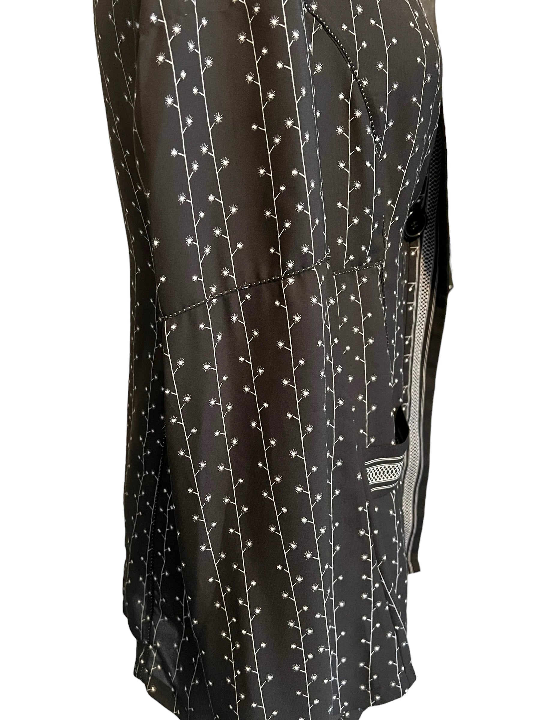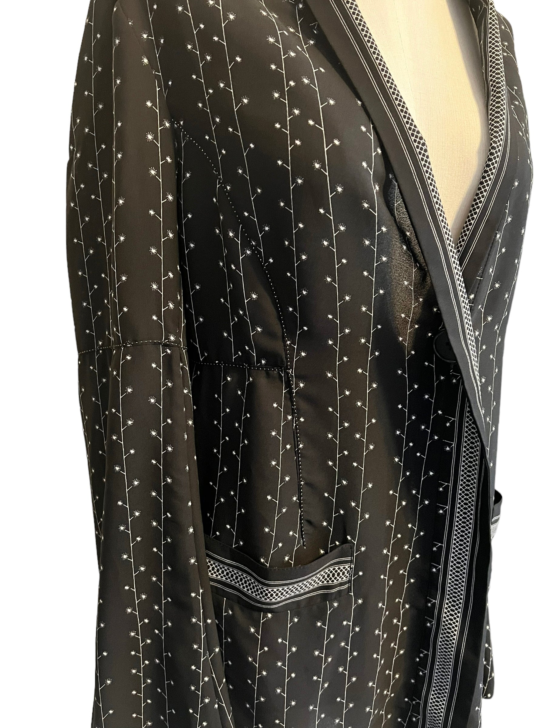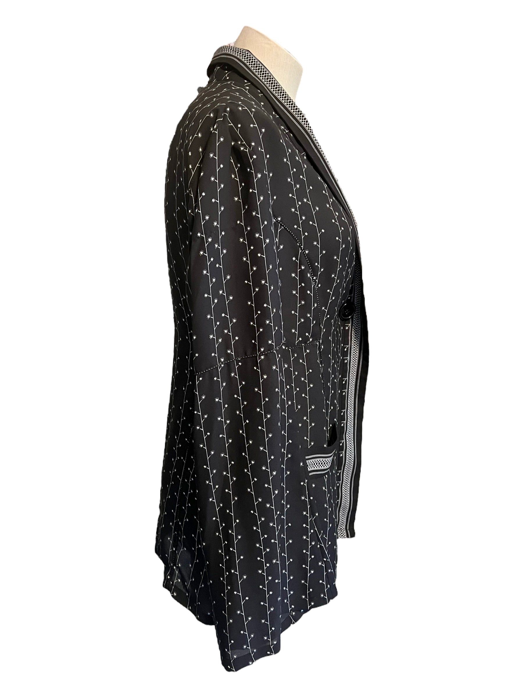 Black and white print sheer one button shirt jacket/blazer with front pockets and bell sleeves.