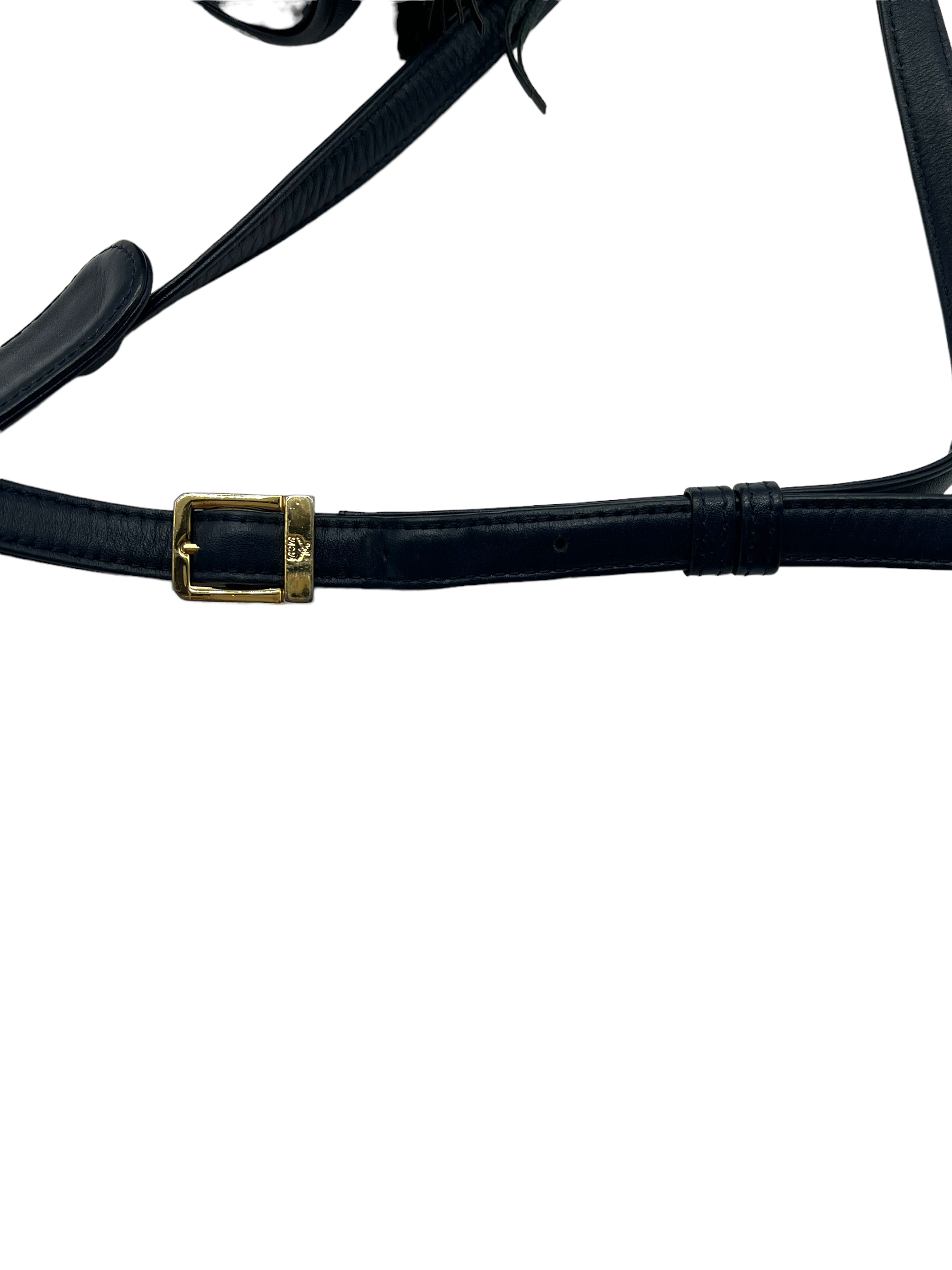 White and navy vintage Heritage Visetos coated canvas mini drawstring bucket crossbody with gold hardware and navy leather trim. Comes with unbranded dust bag