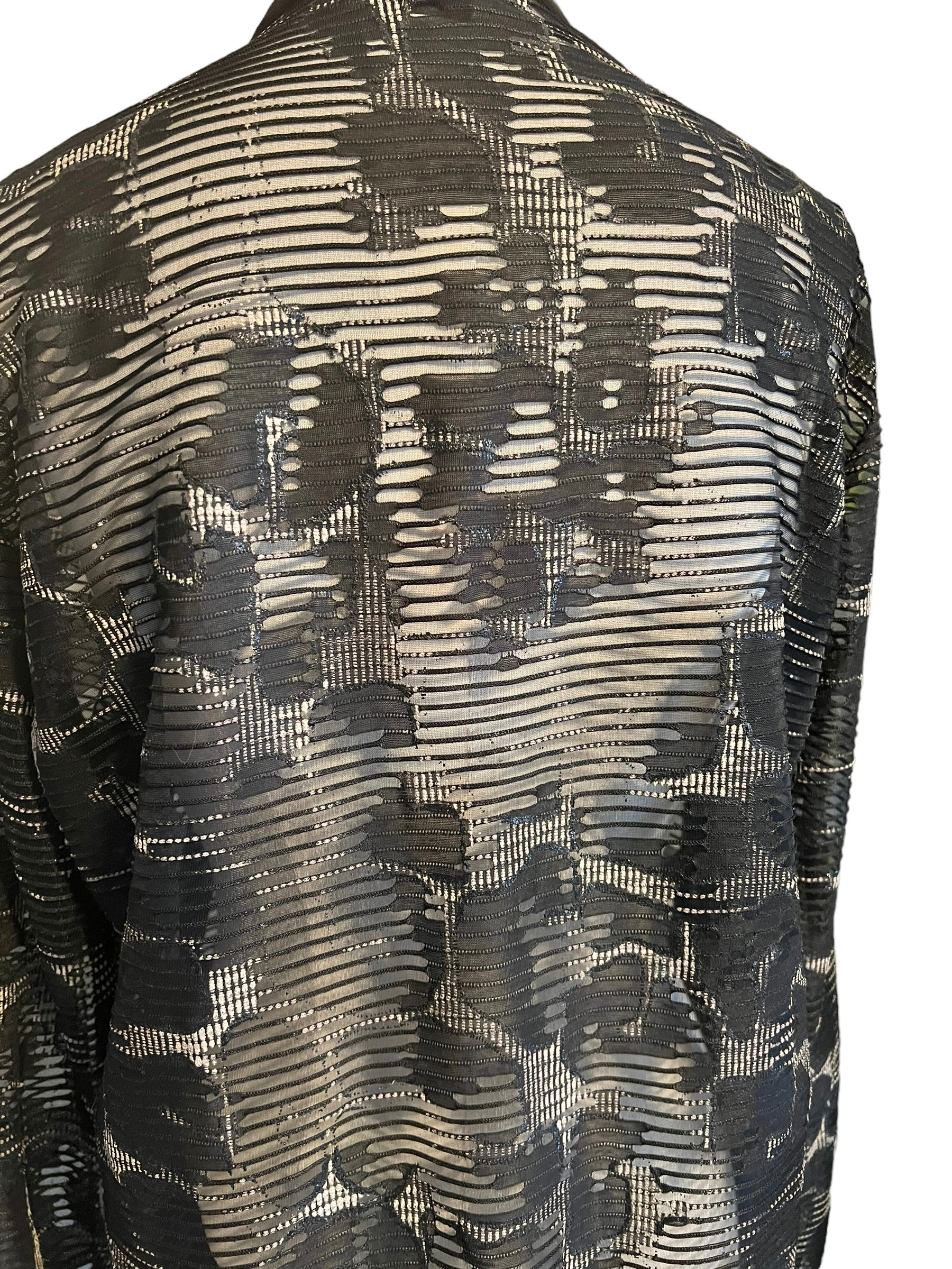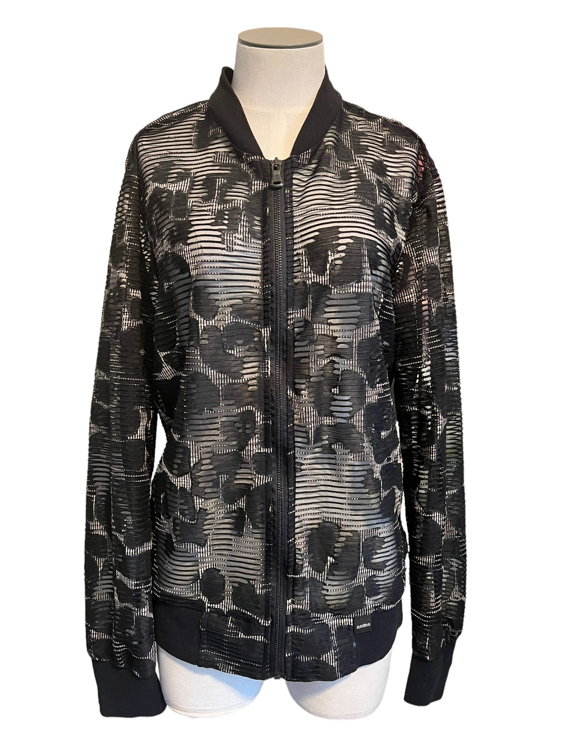 Black and beige sheer mesh zip up bomber jacket with metallic detail.