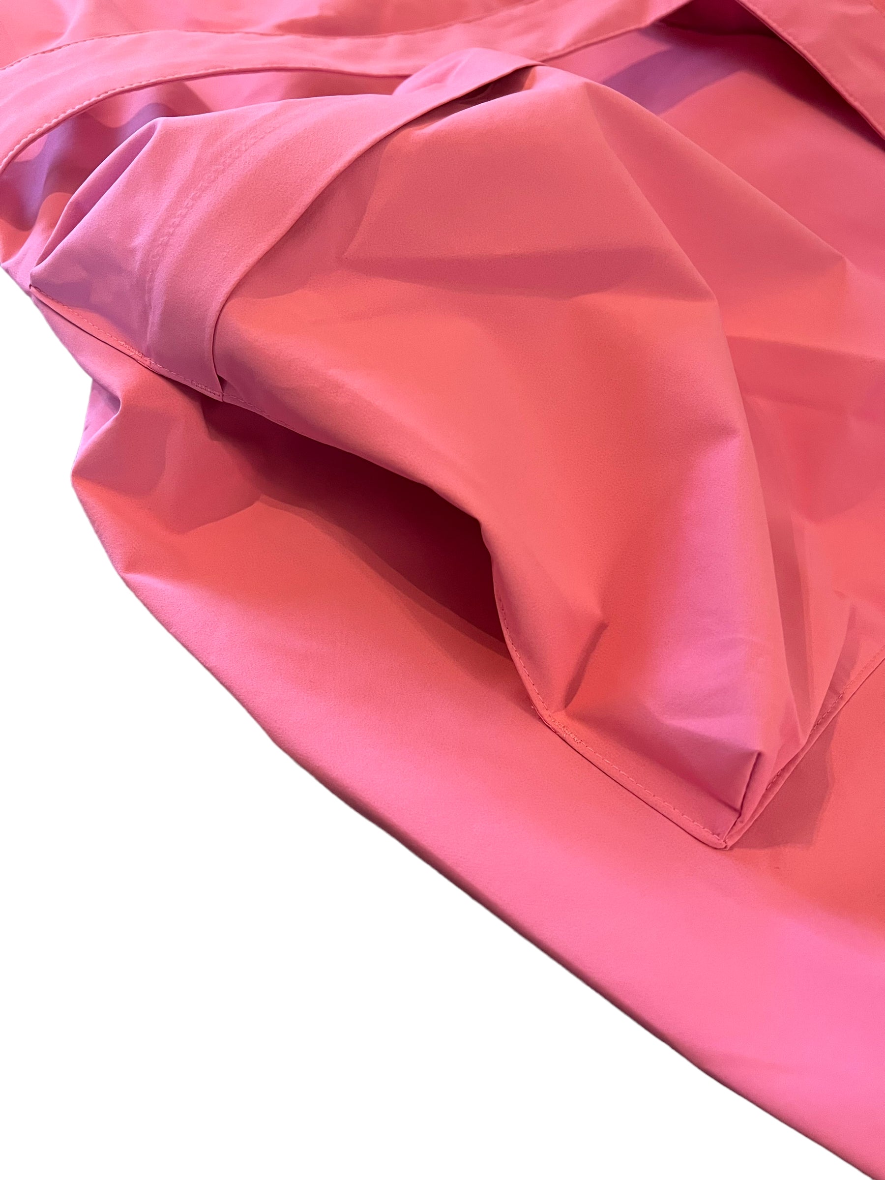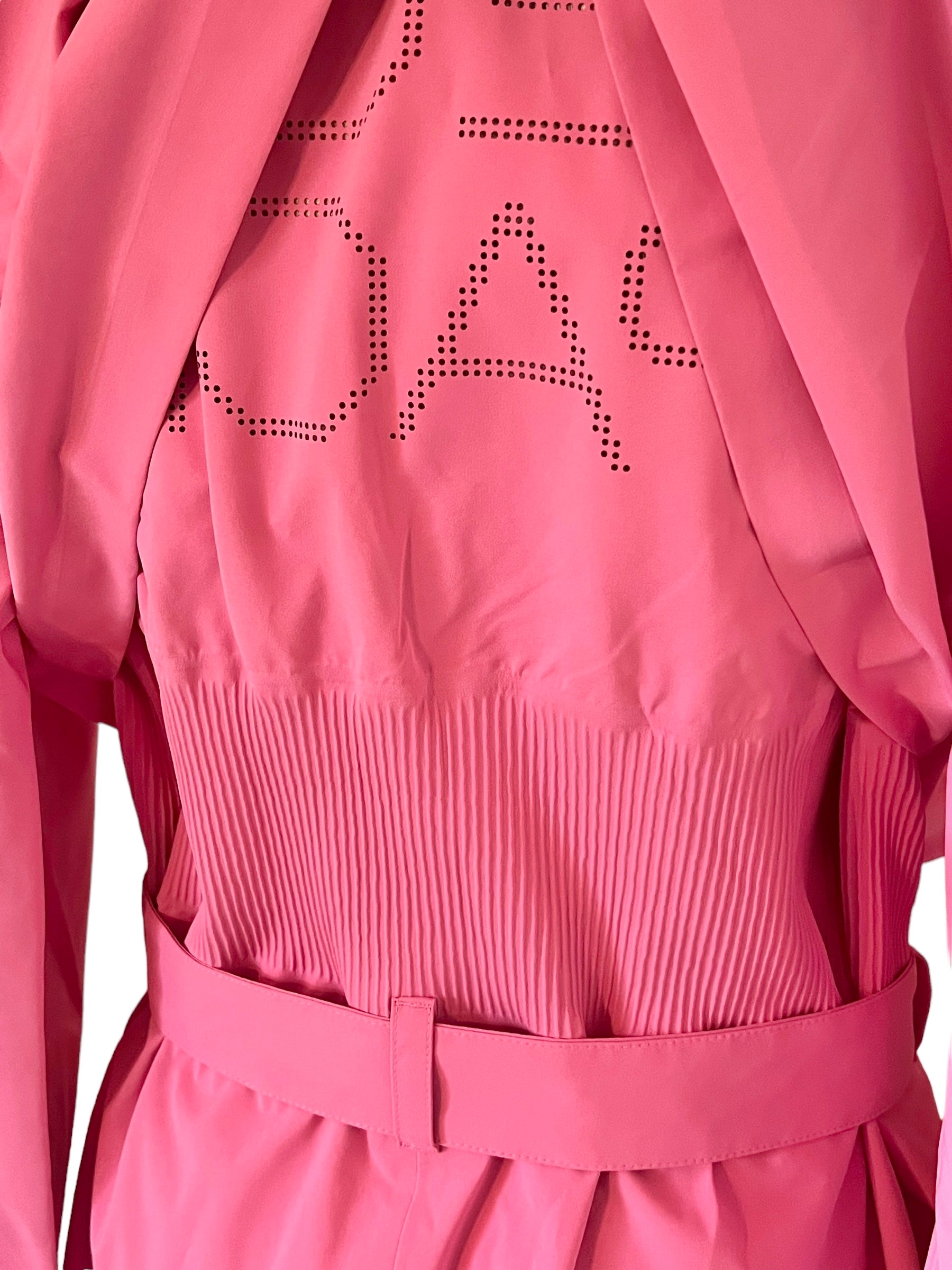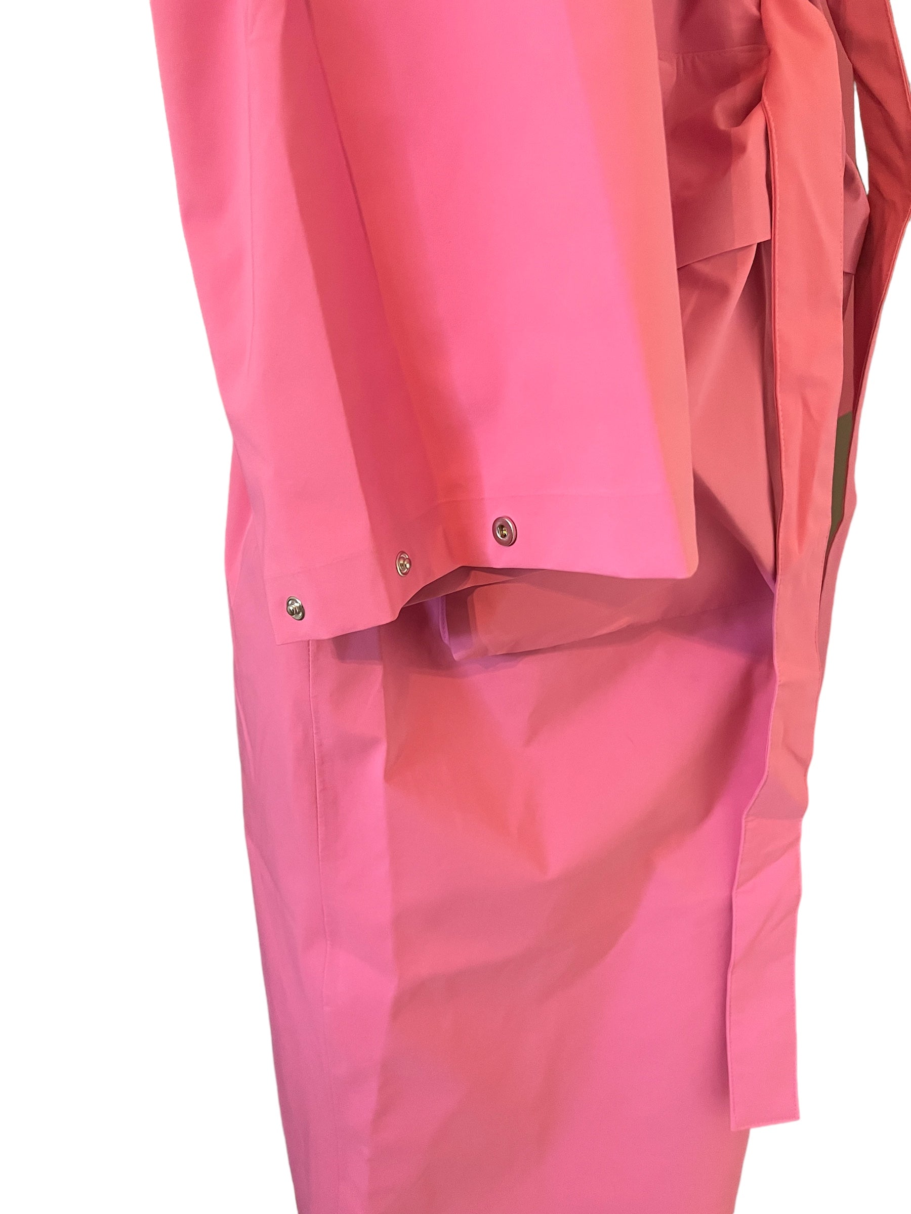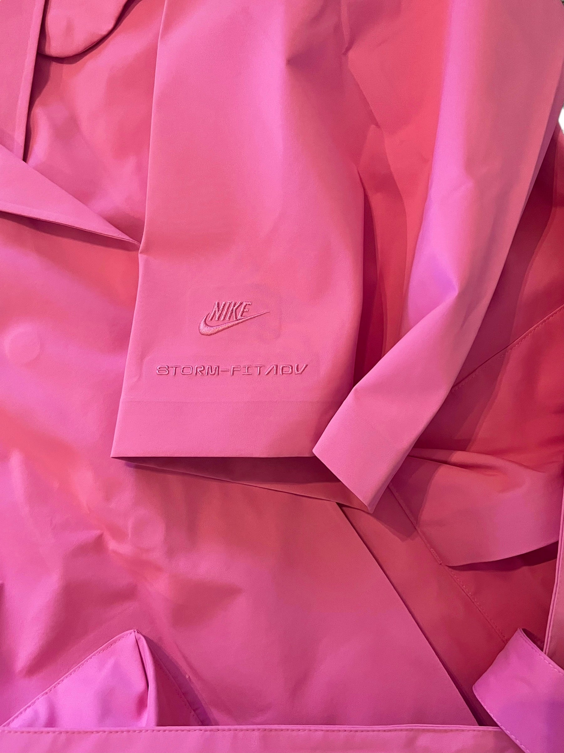 Pink lightweight Sportswear Storm-FIT ADV Tech Pack trench coat with silver hardware. Comes with waist tie. Features double snap buttons at chest, bellowed front zip pockets as well as traditional side pockets and multiple snap buttons that allow for customization.