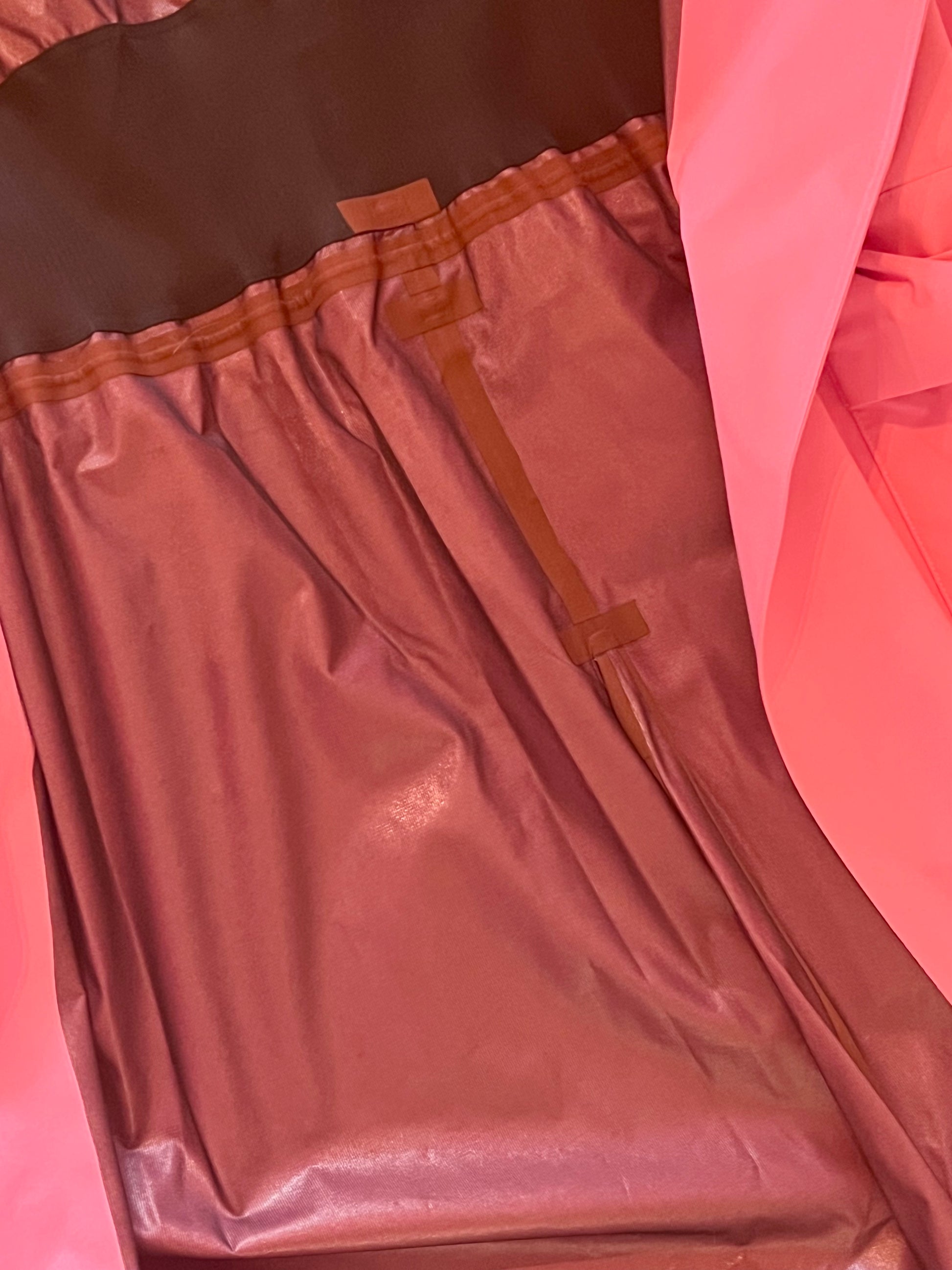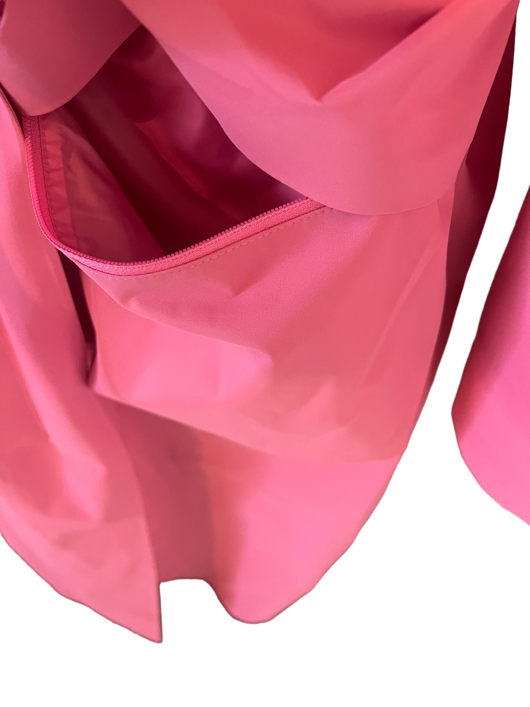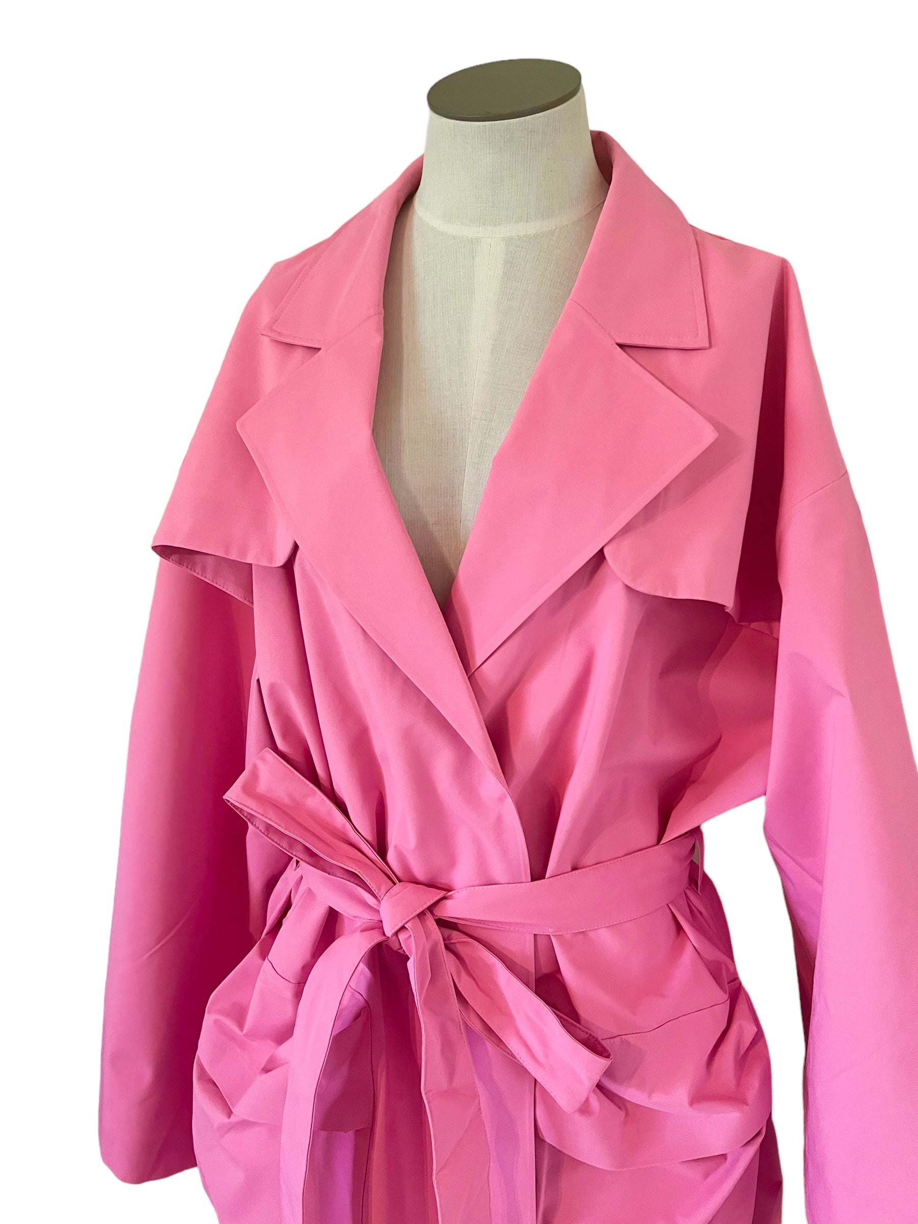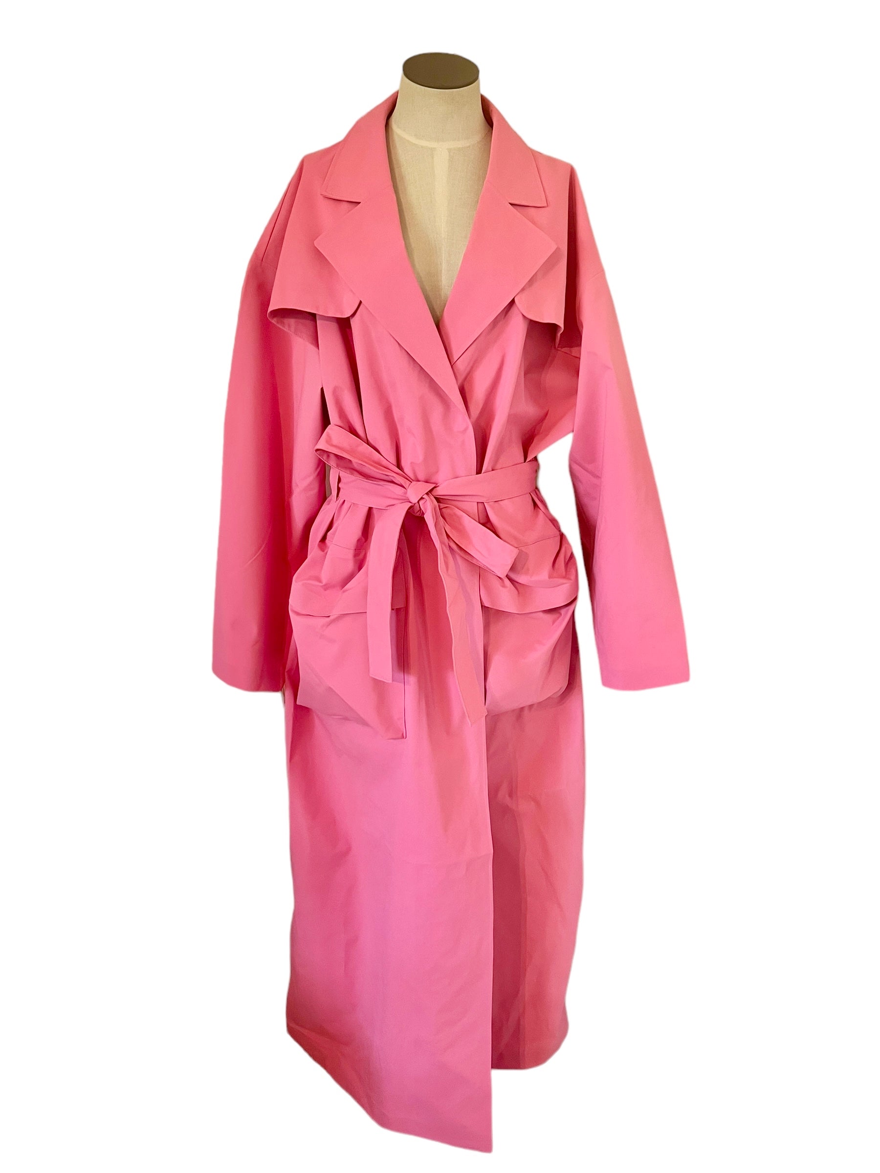 Pink lightweight Sportswear Storm-FIT ADV Tech Pack trench coat with silver hardware. Comes with waist tie. Features double snap buttons at chest, bellowed front zip pockets as well as traditional side pockets and multiple snap buttons that allow for customization.