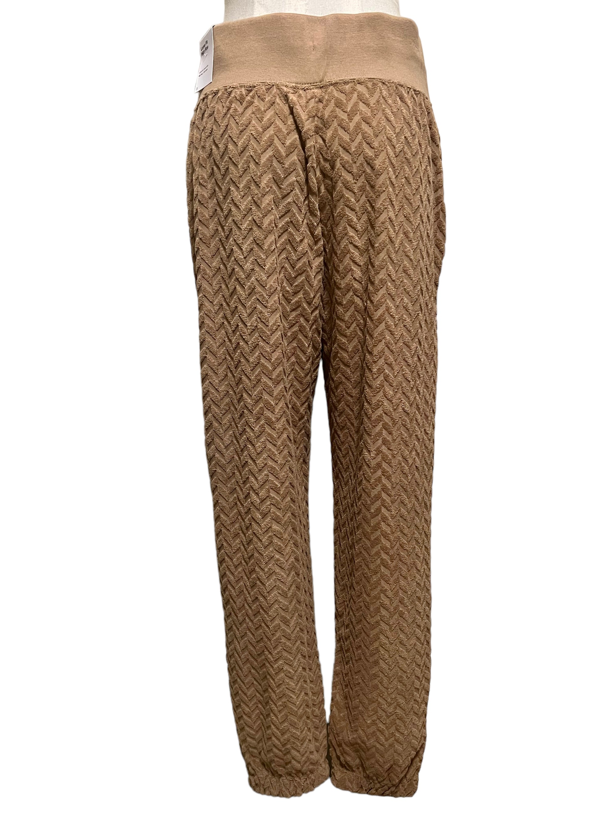 Dark driftwood/hemp high waisted loose fit Phoenix joggers with raised knit pattern. Features side pockets, elastic cuffs and drawstring waistband.