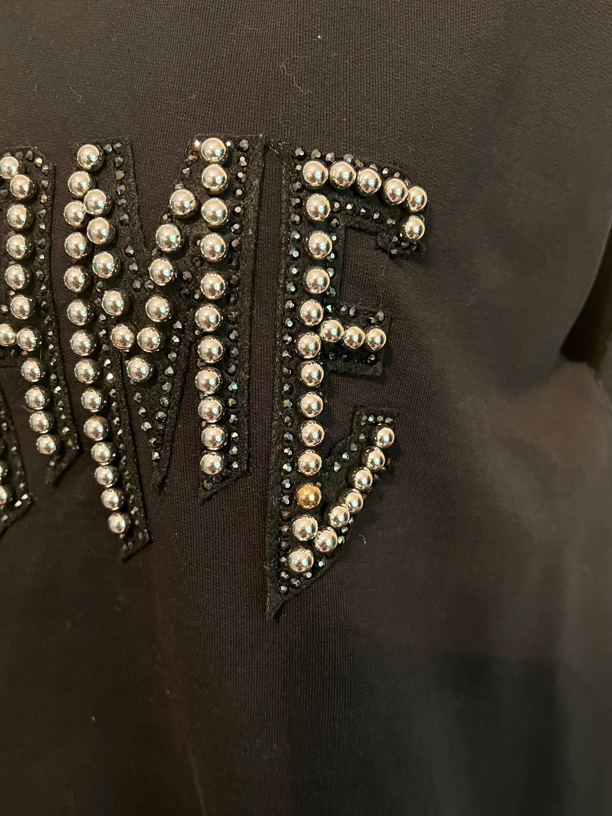 Black dress with silver/bronze ball/rhinestone embellished lettering and asymetrical hem.