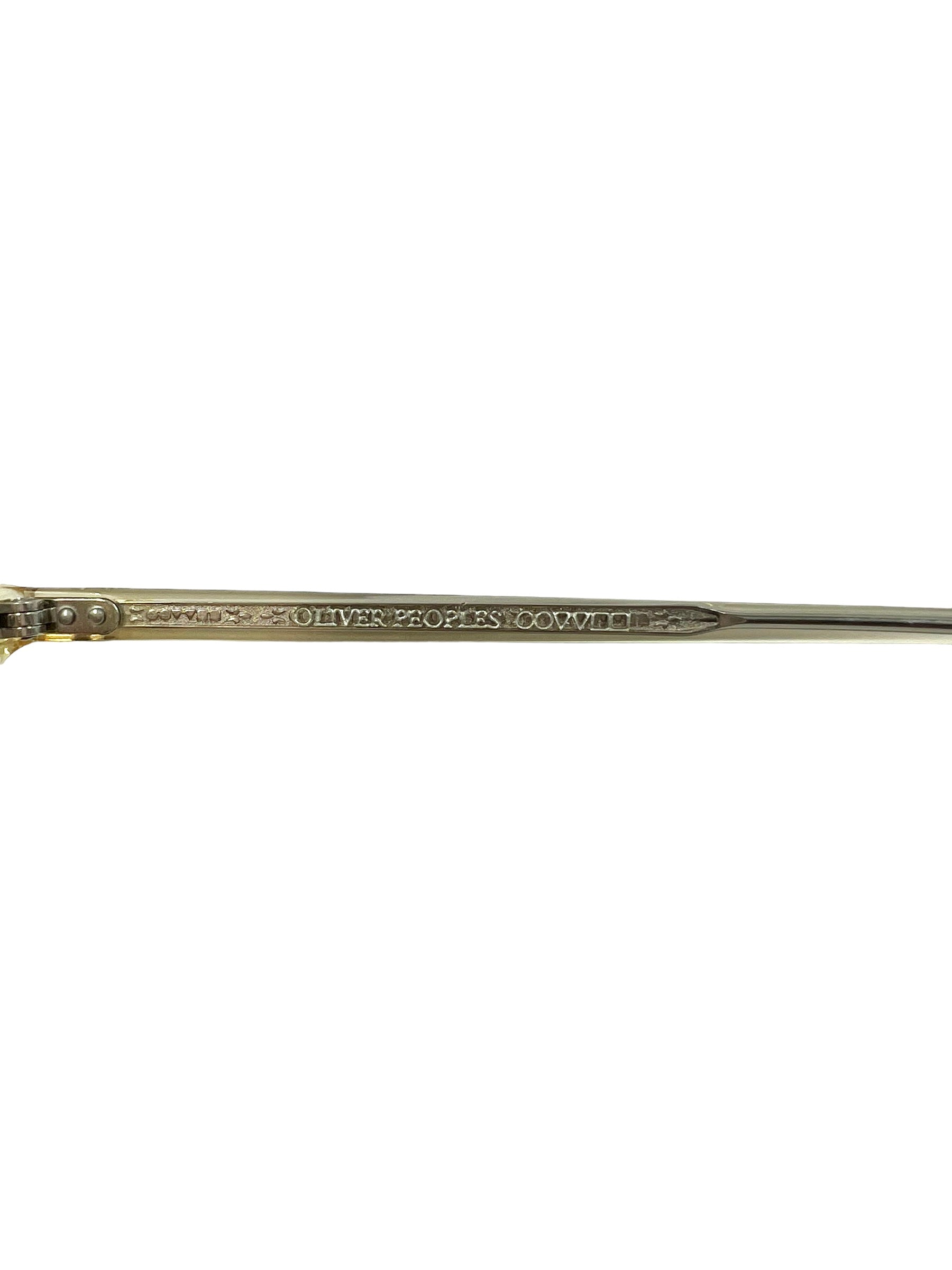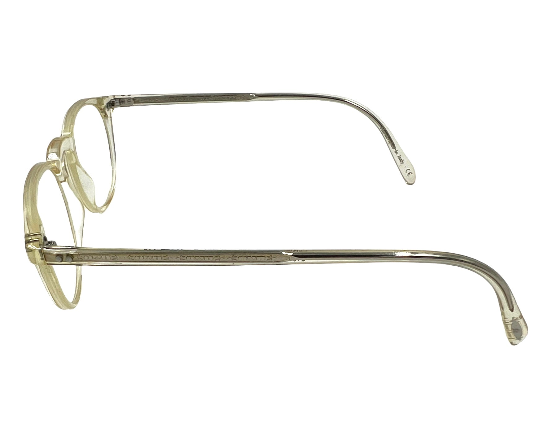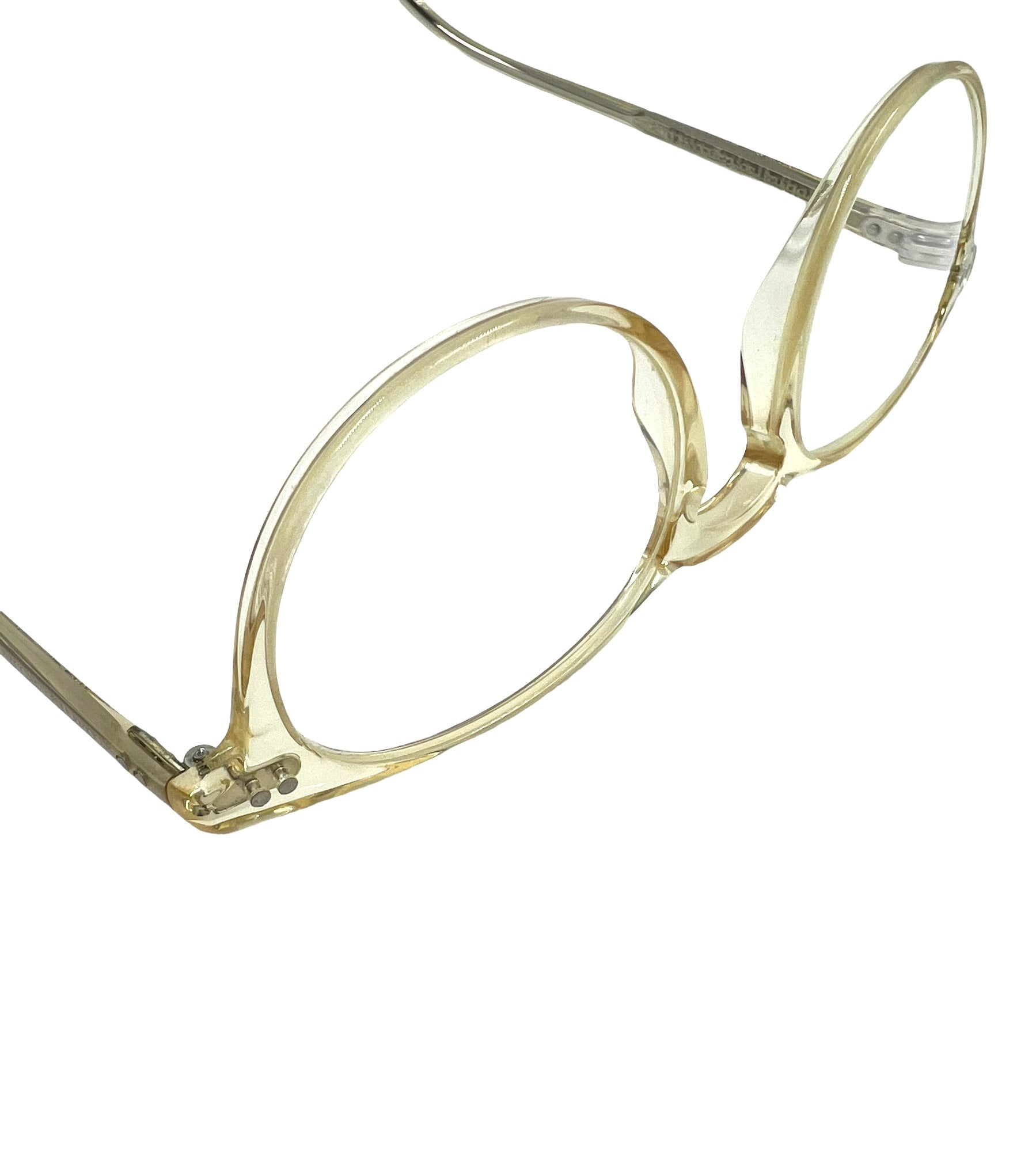 Beige opaque round Riley-R eyeglasses with custom logo filigree engraving on arms and hand-inlaid logo at the temple tips. Comes with case.