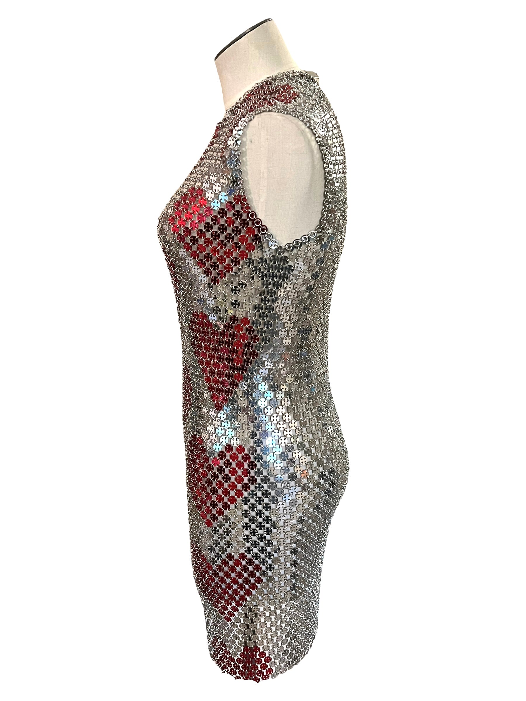 Silver and red chainmail heart dress with original hanger.
