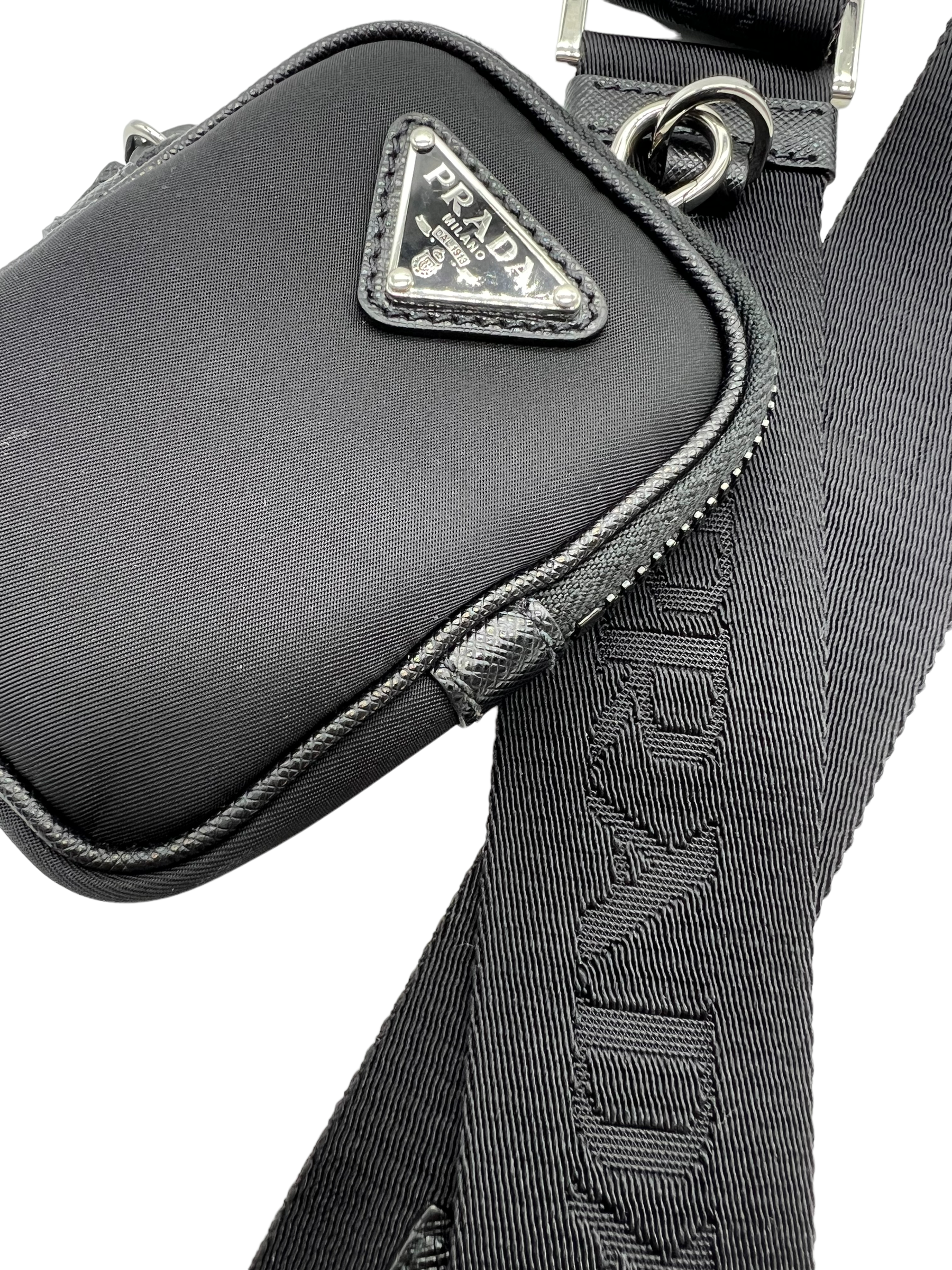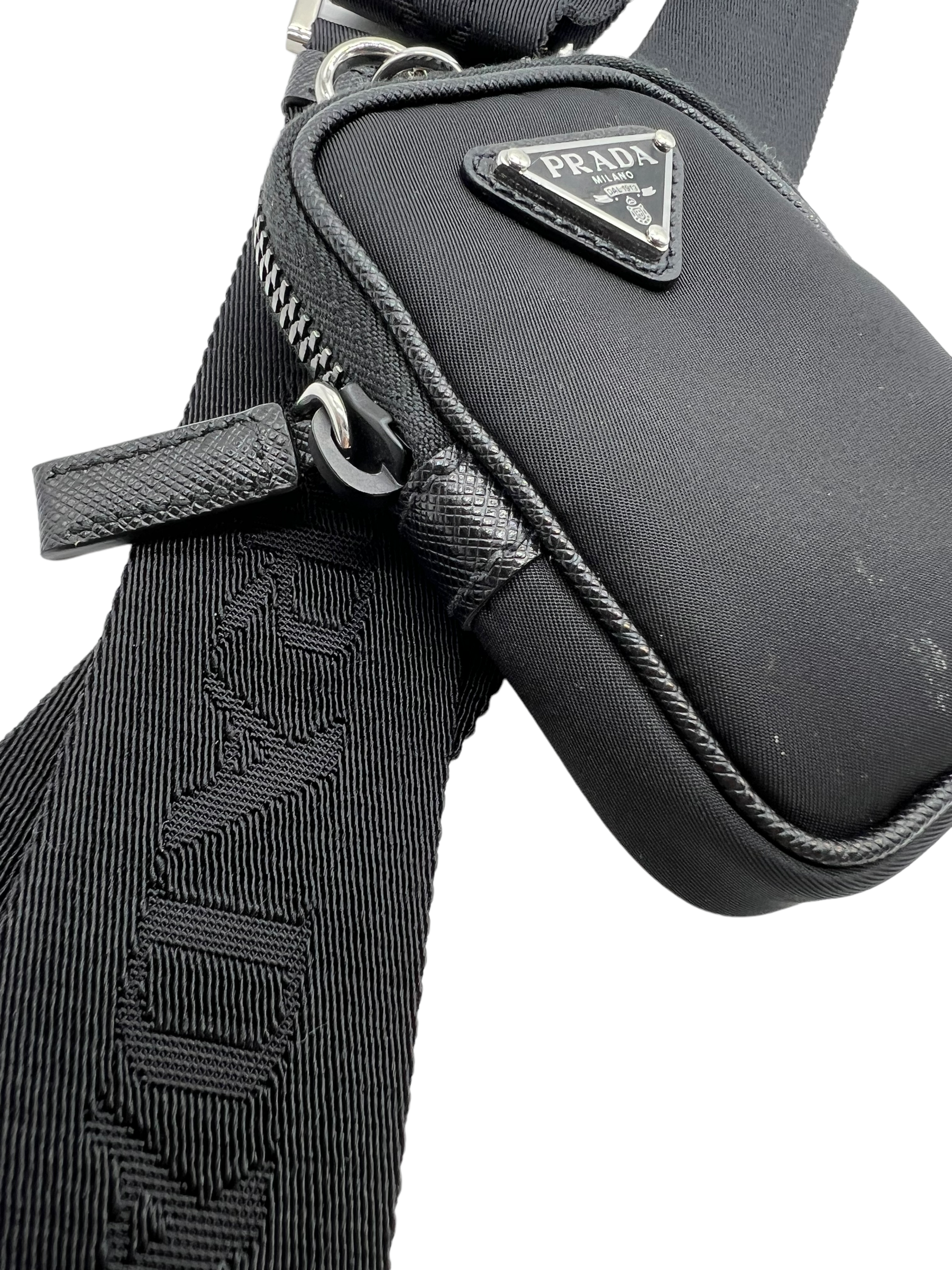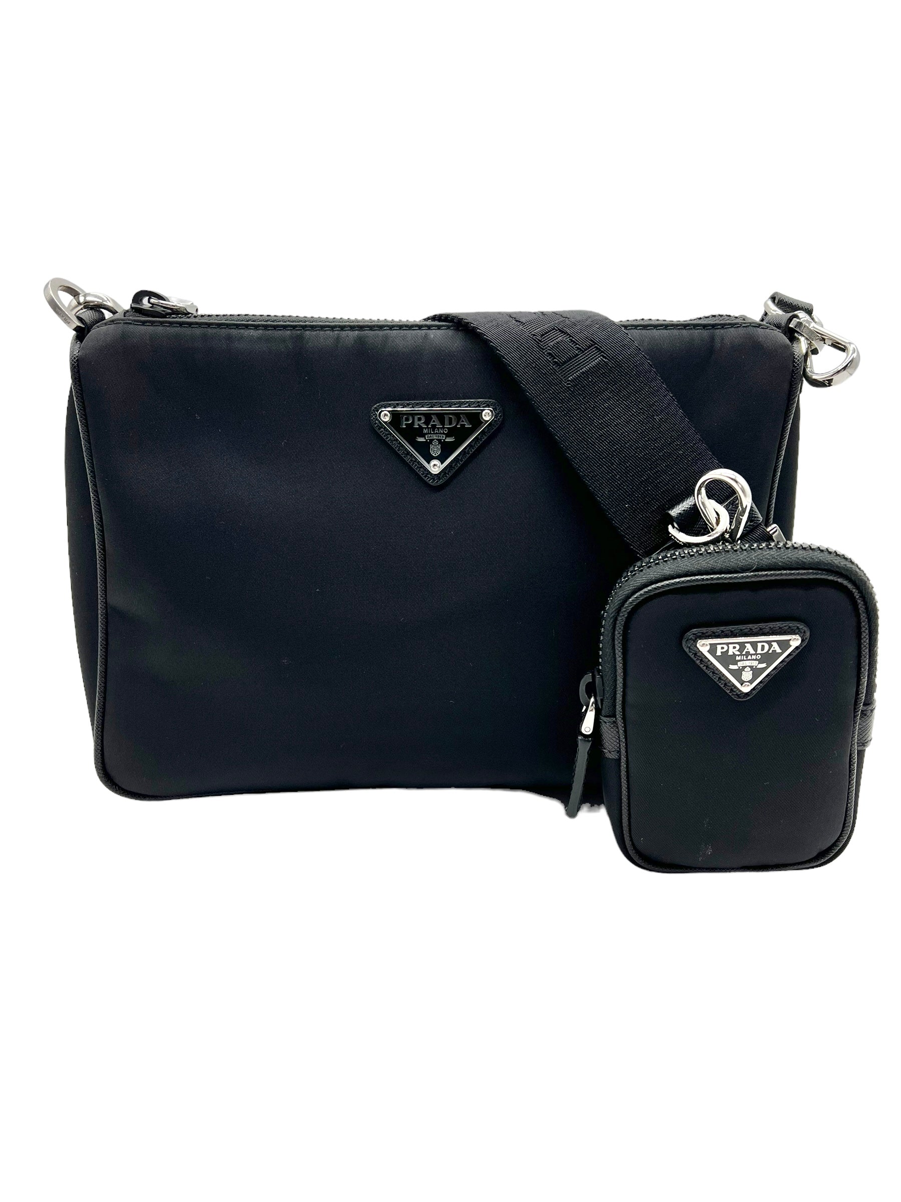 Black Re-Nylon shoulder bag/crossbody with saffiano leather trim and silver hardware. Comes with adjustable/removable long strap and mini pouch accessory. Does not come with dust bag or box.