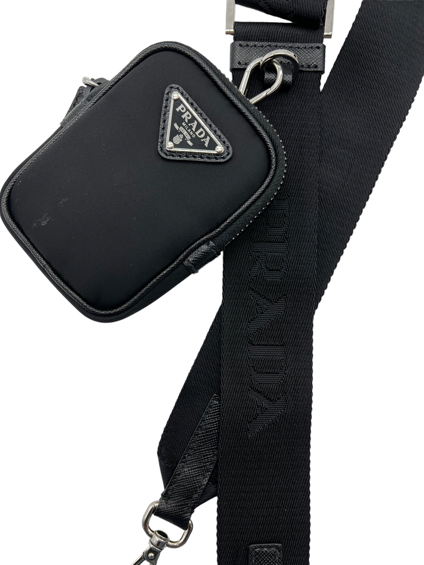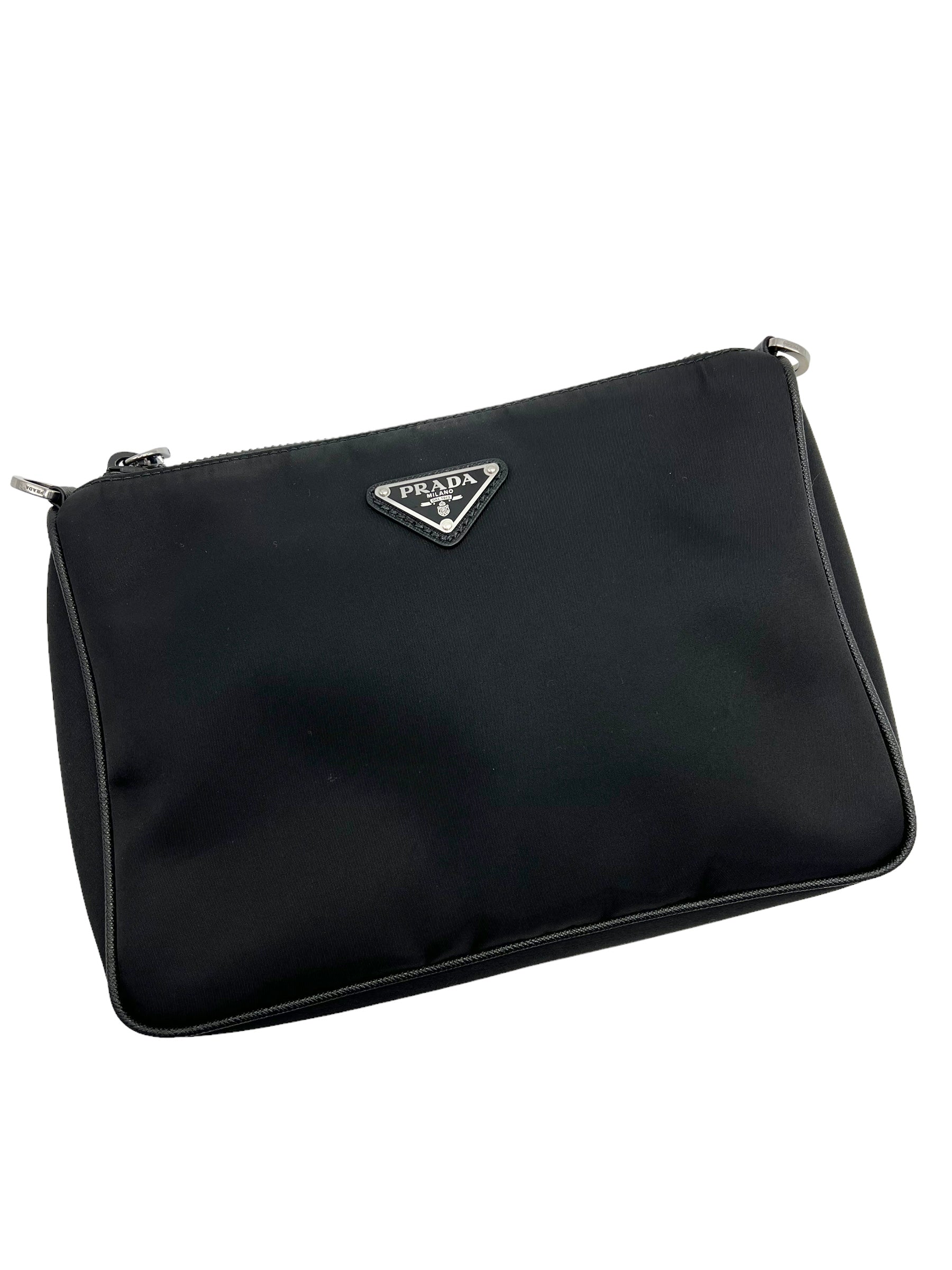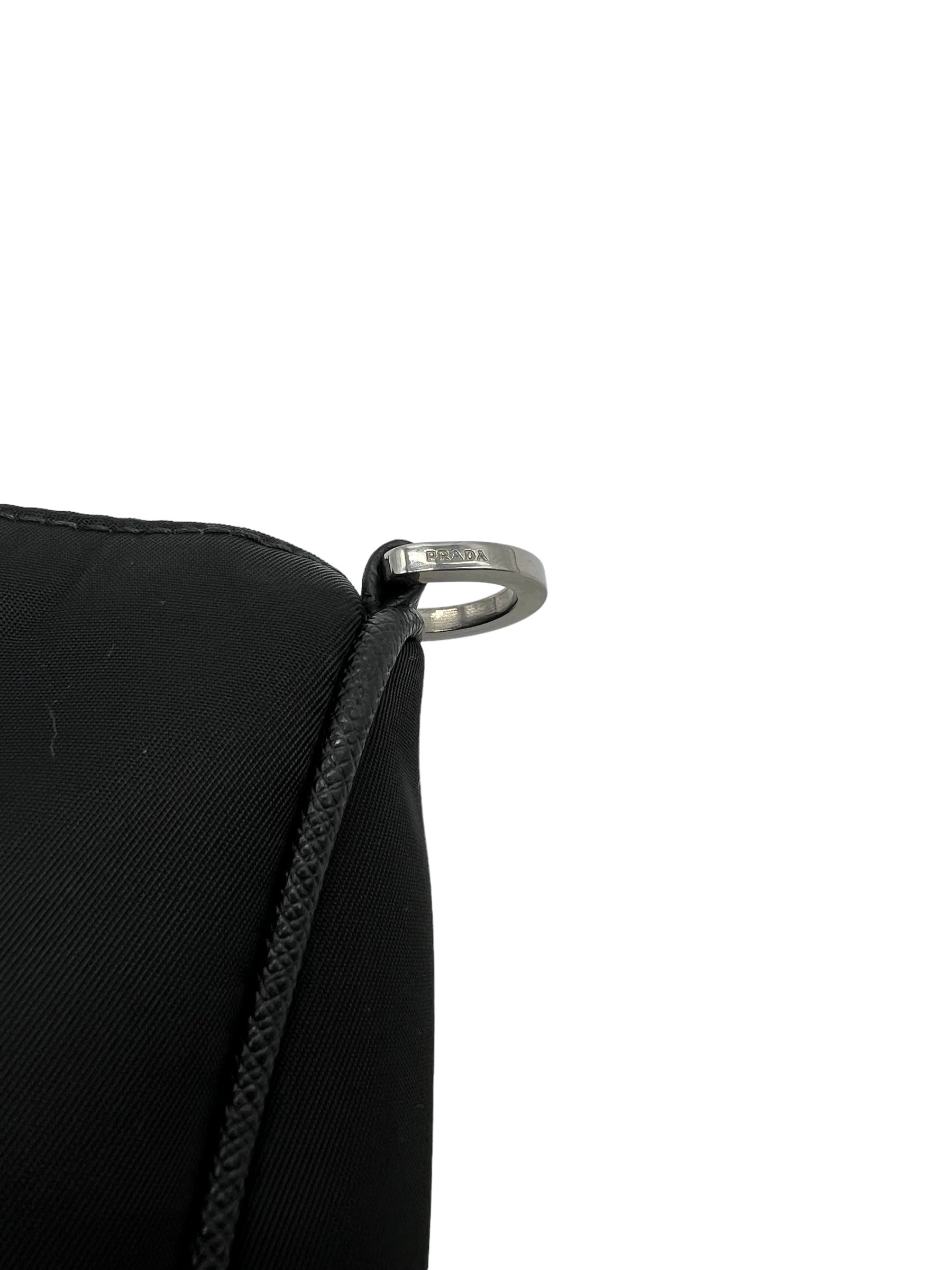 Black Re-Nylon shoulder bag/crossbody with saffiano leather trim and silver hardware. Comes with adjustable/removable long strap and mini pouch accessory. Does not come with dust bag or box.