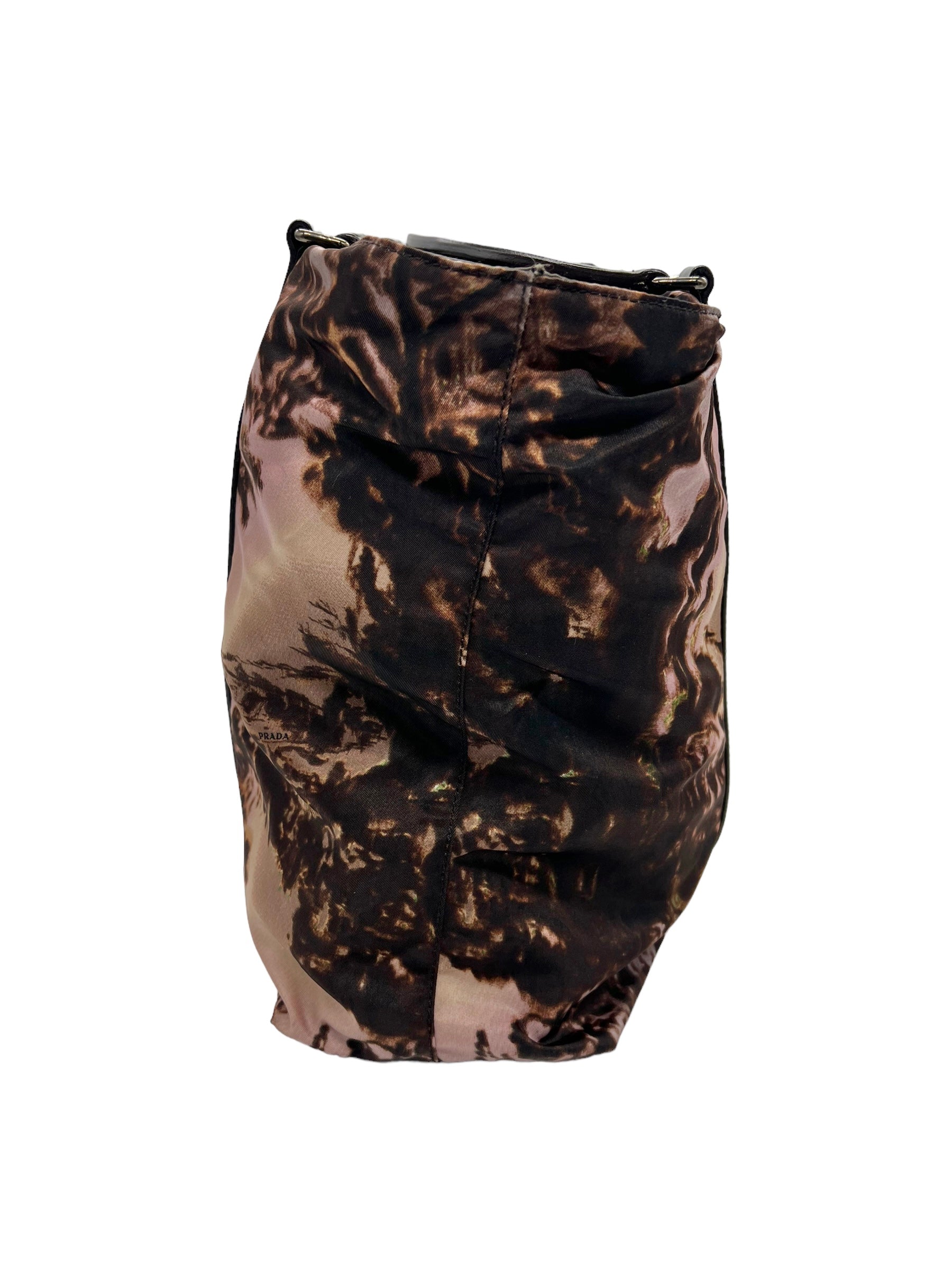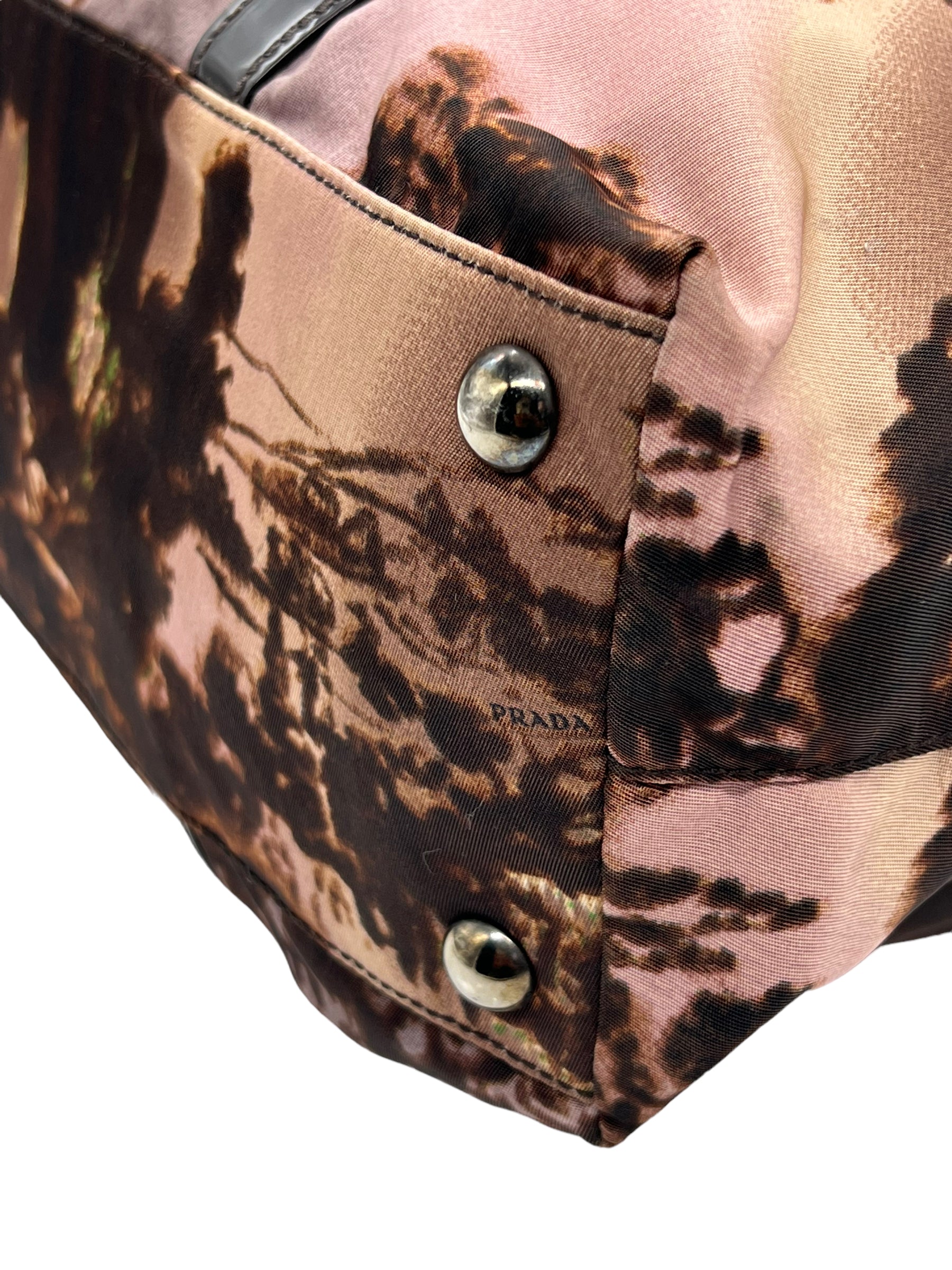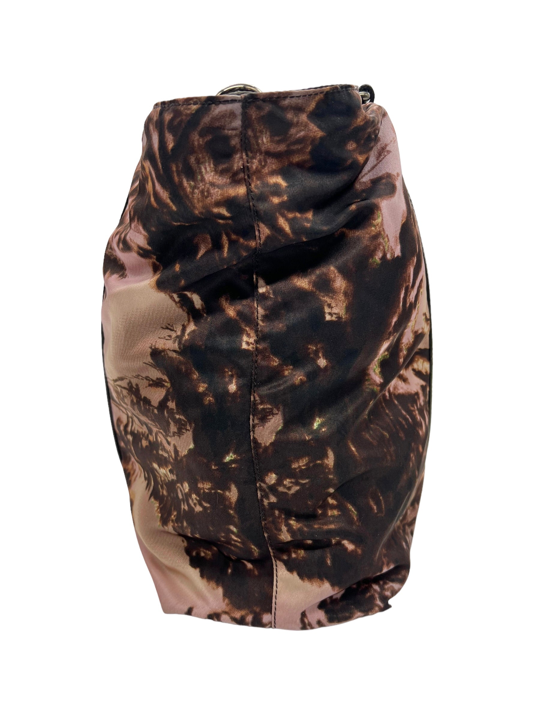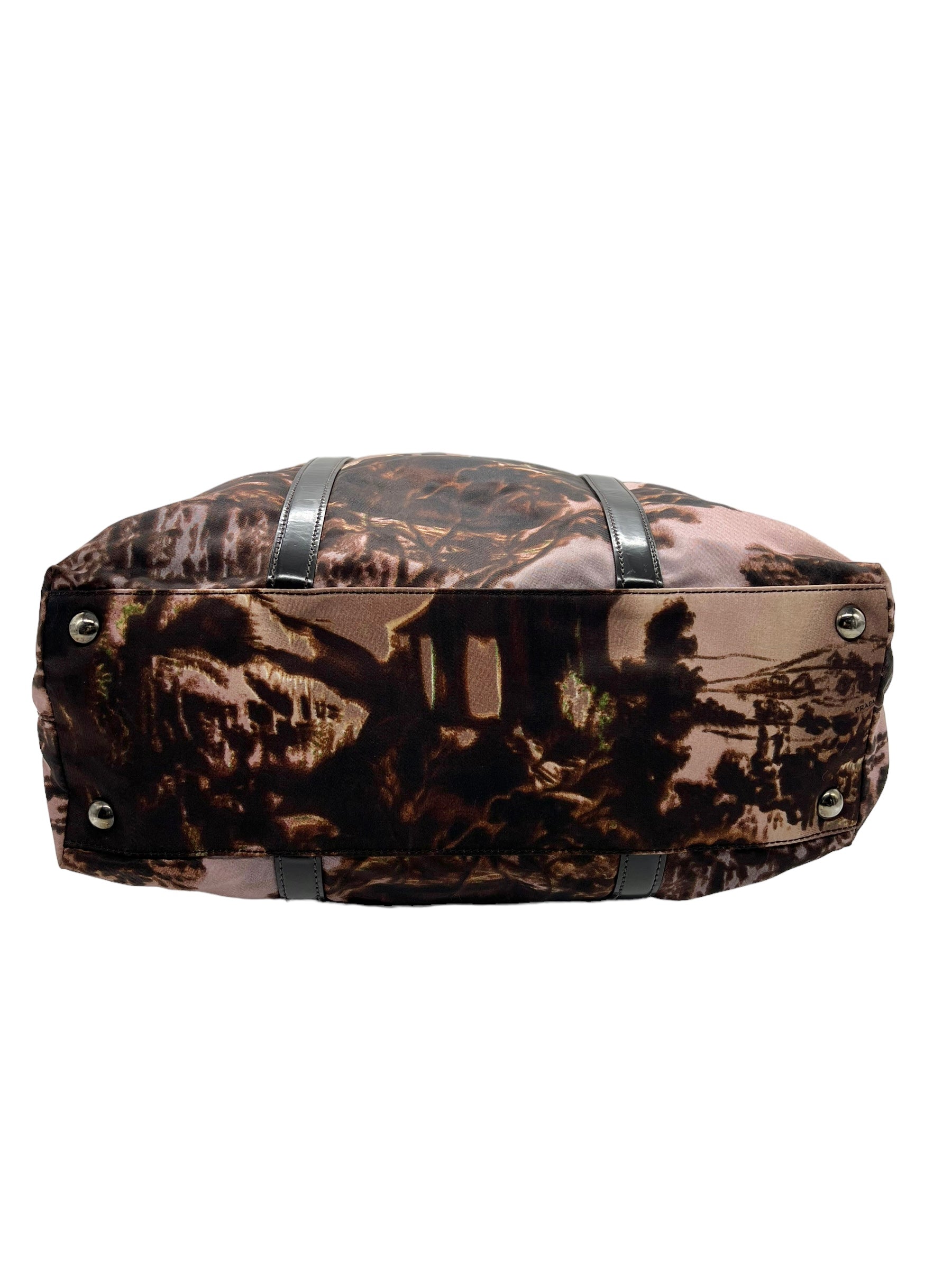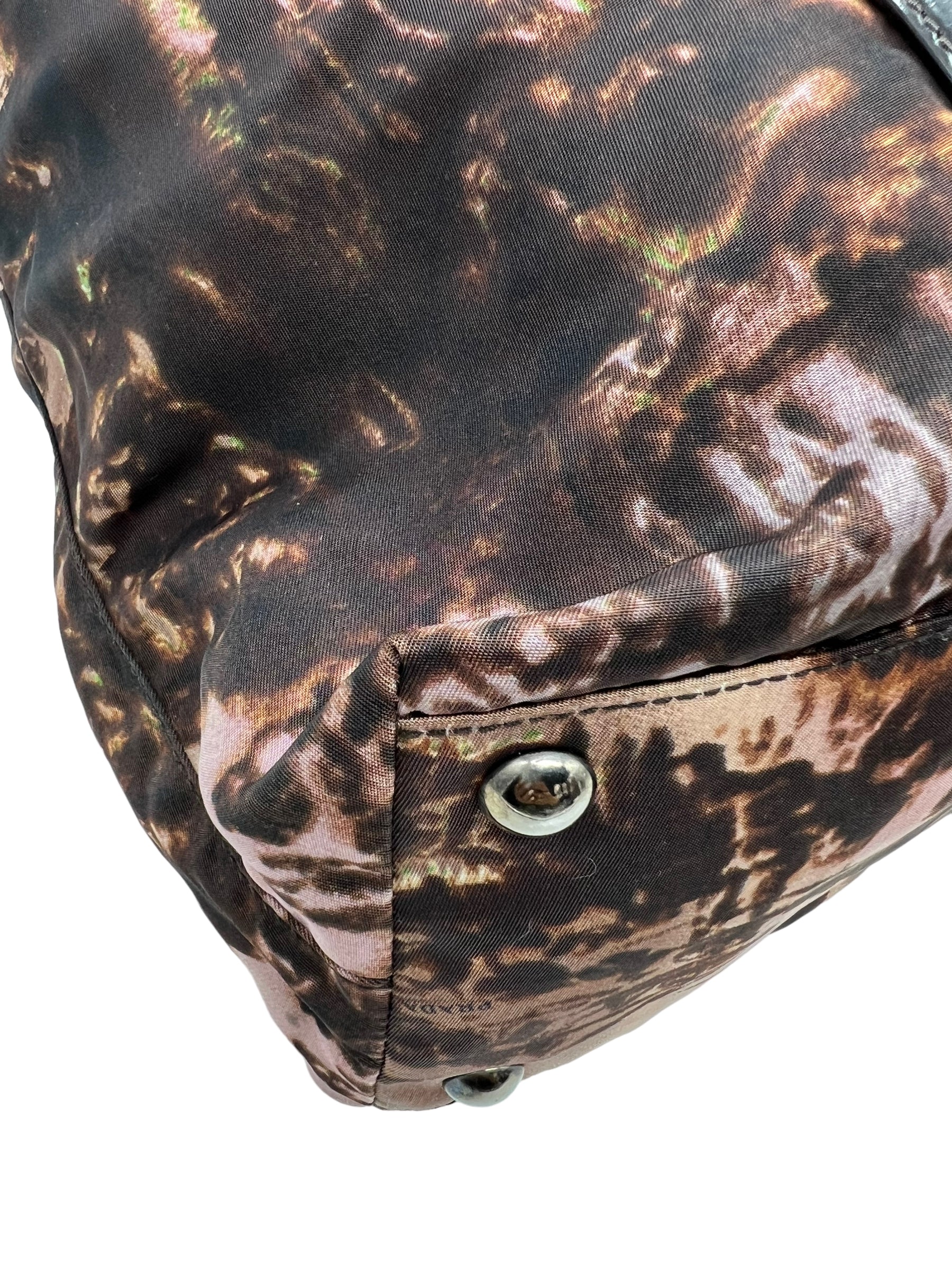 Mauve print nylon New York Street Templi bag with gunmetal hardware and brown coated leather handles/trim. Missing long strap. Does not come with dust bag or box.