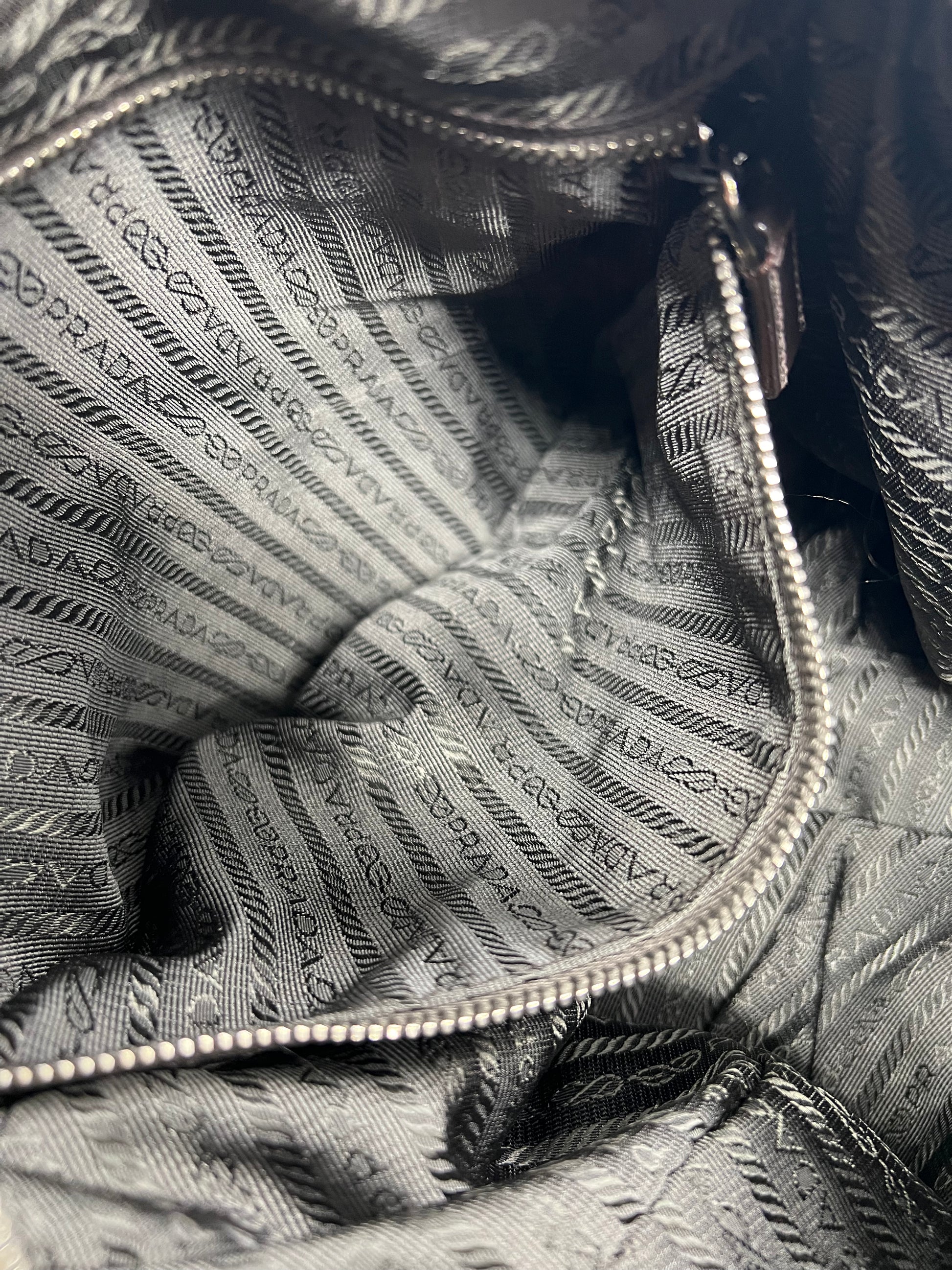 C-Good pre-owned condition with some minor wear on hardware and tear in fabric at strap d-ring. Coated leather handles/trim show some signs of wear.
