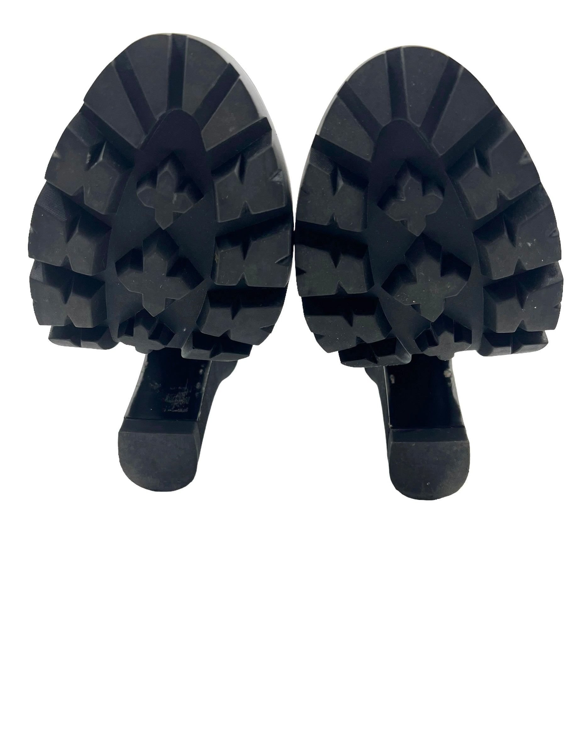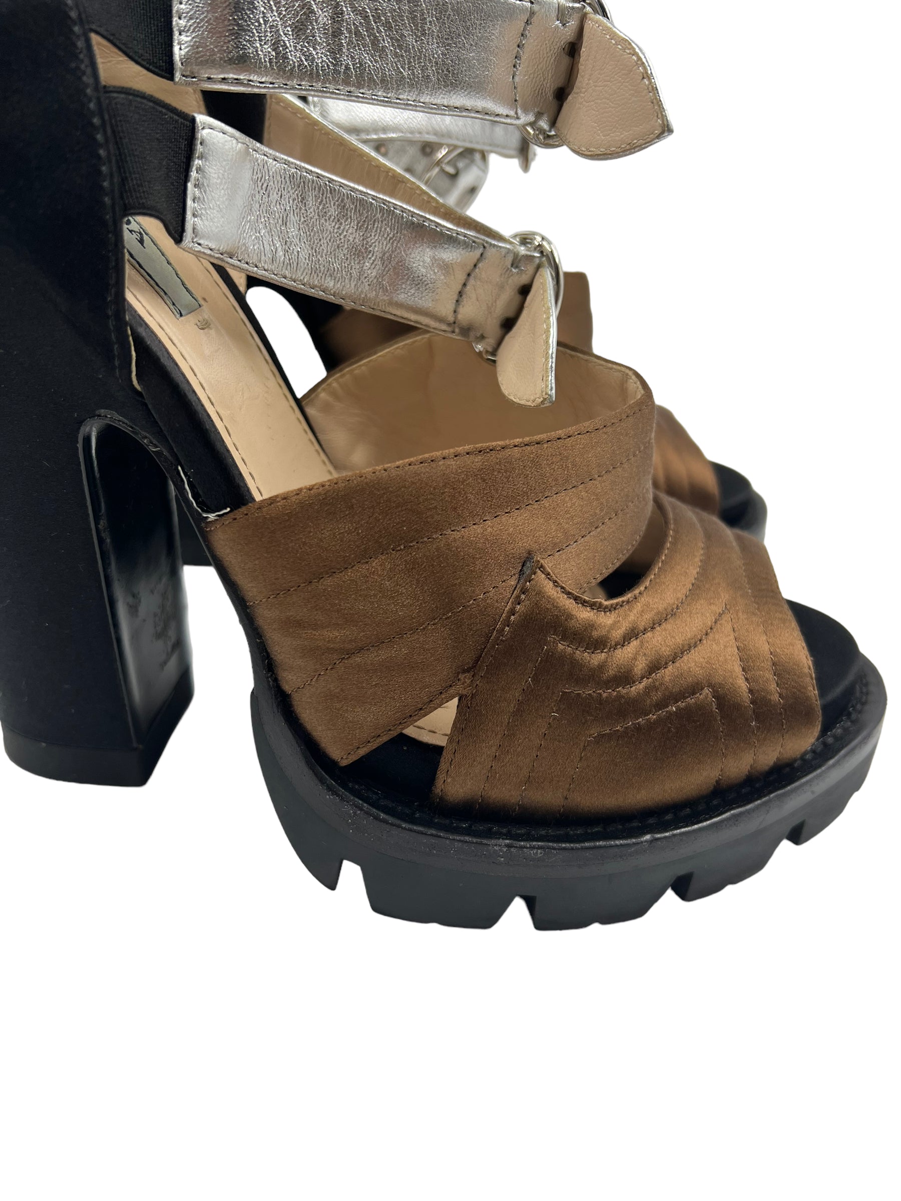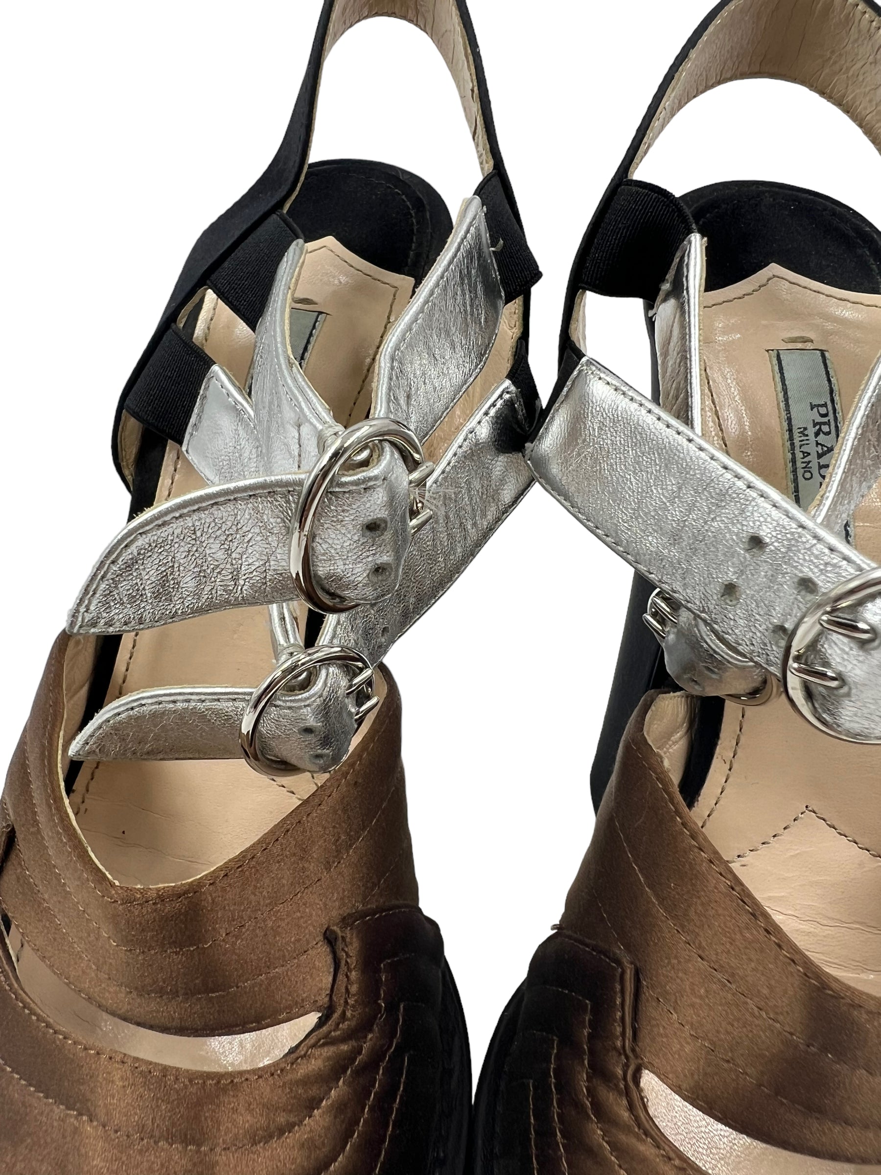 Black and brown satin stacked heels with silver leather buckle ankle straps. Comes with dust bag.