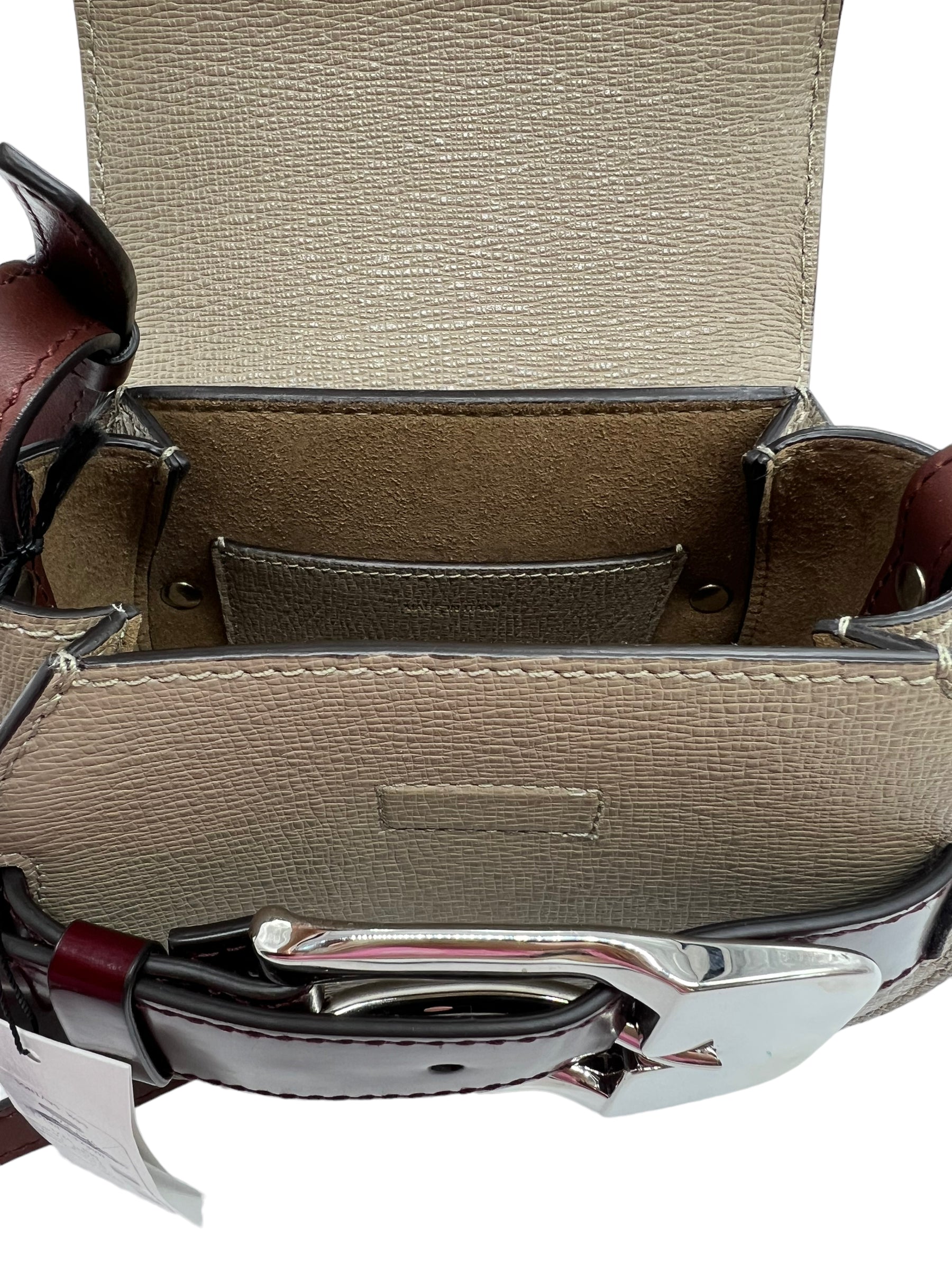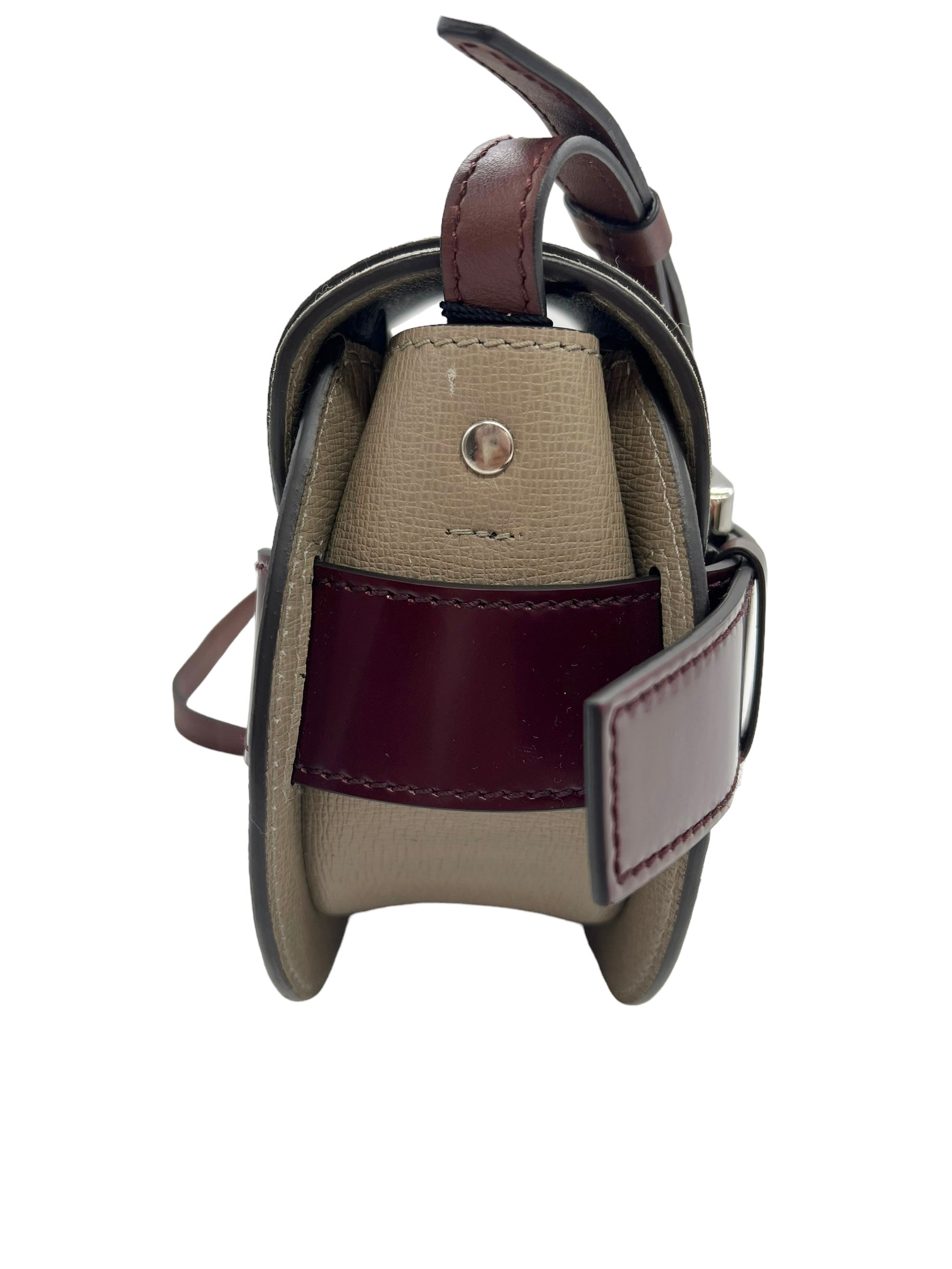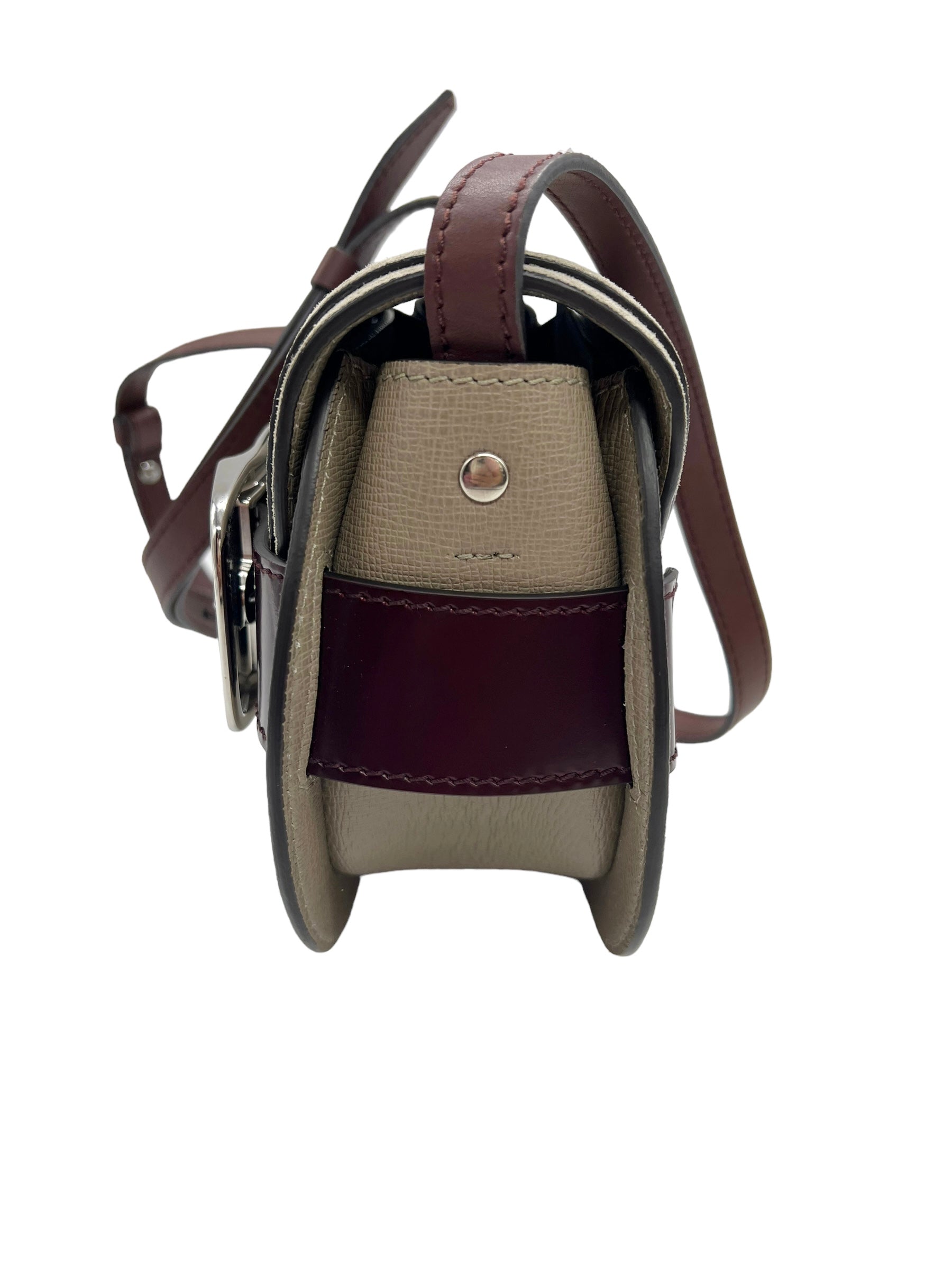 Taupe leather Buckle Mini crossbody bag with oxblood and brown leather details, silver hardware and adjustable strap. Comes with original tags and dust bag.