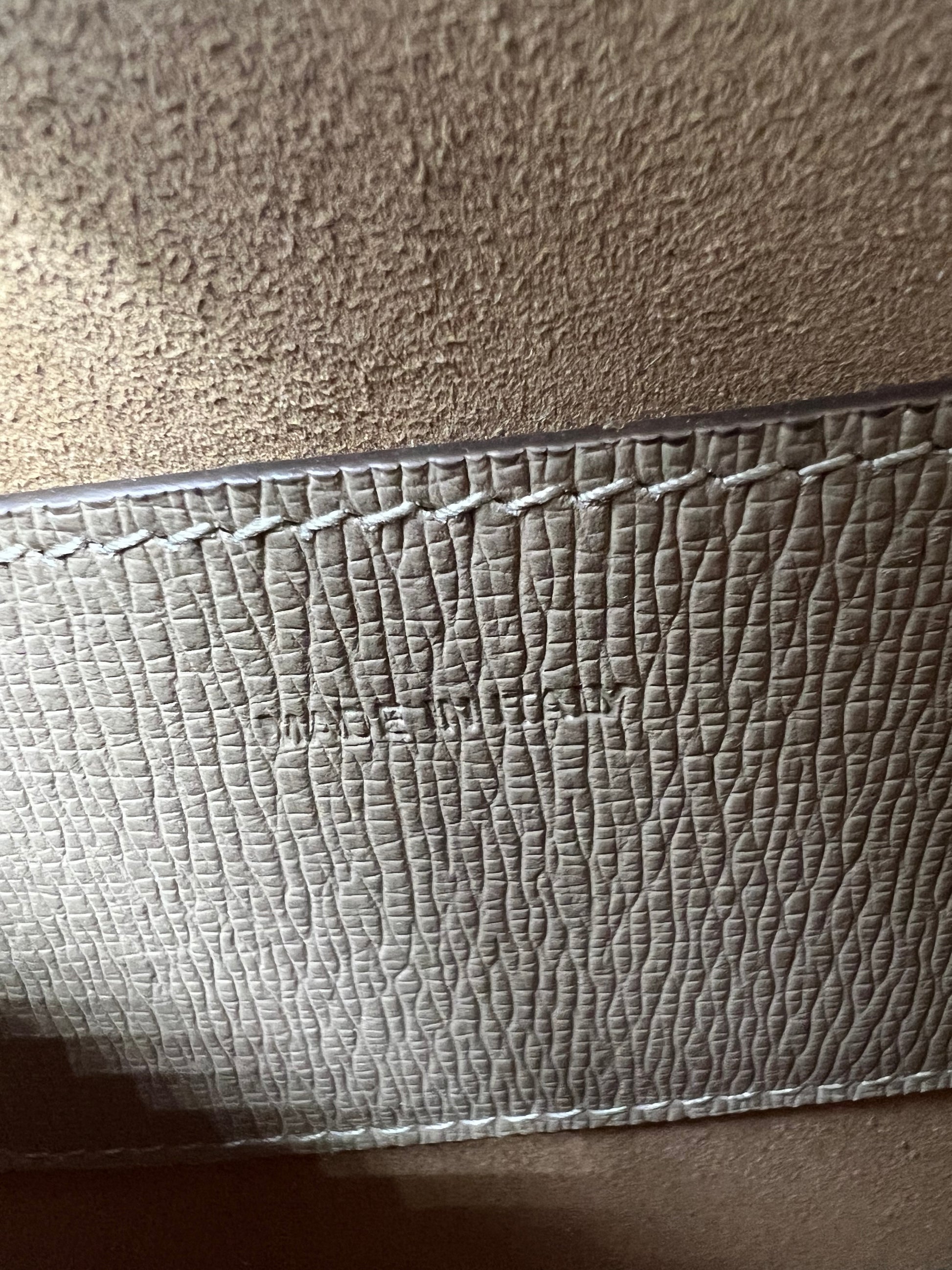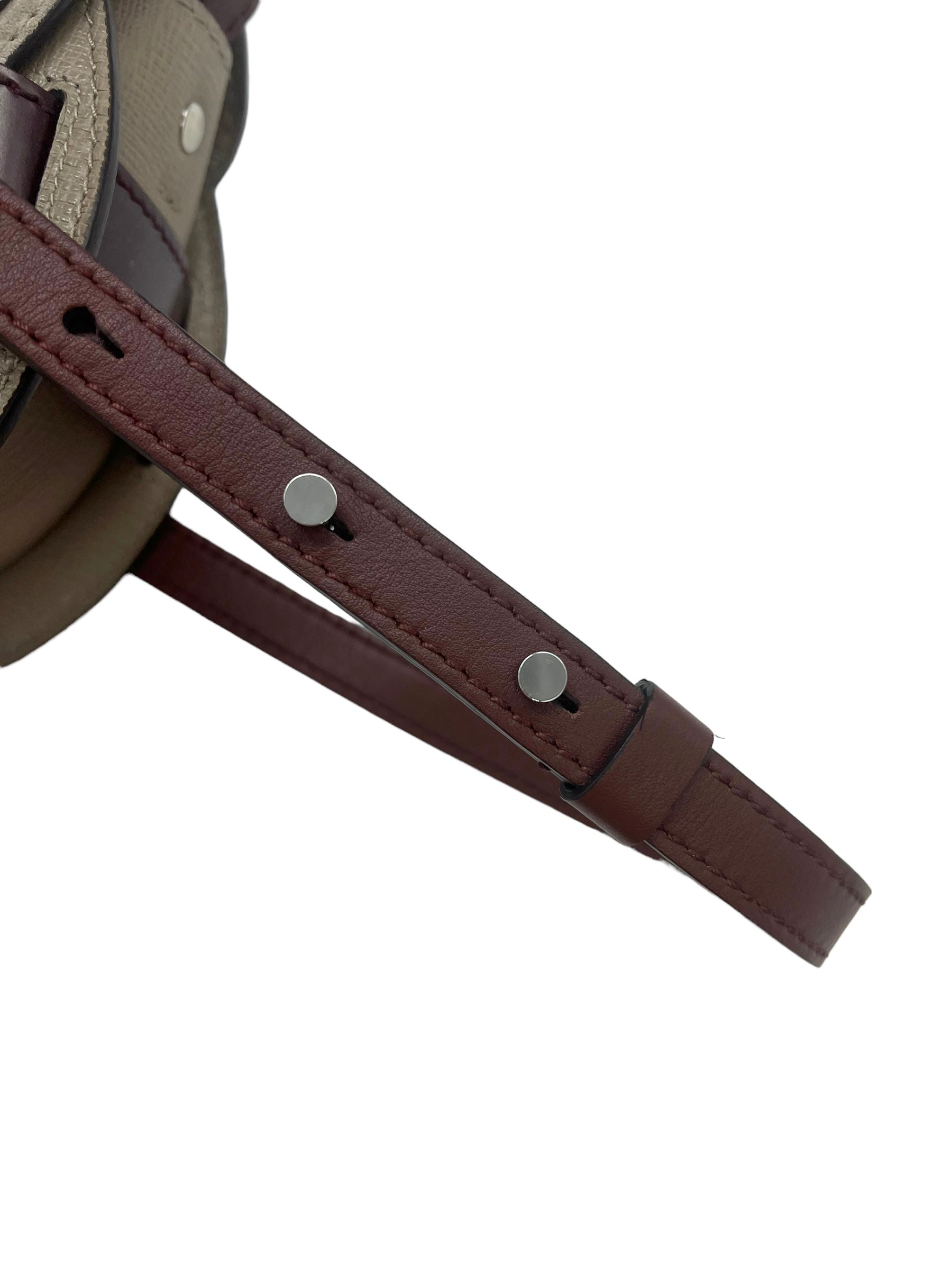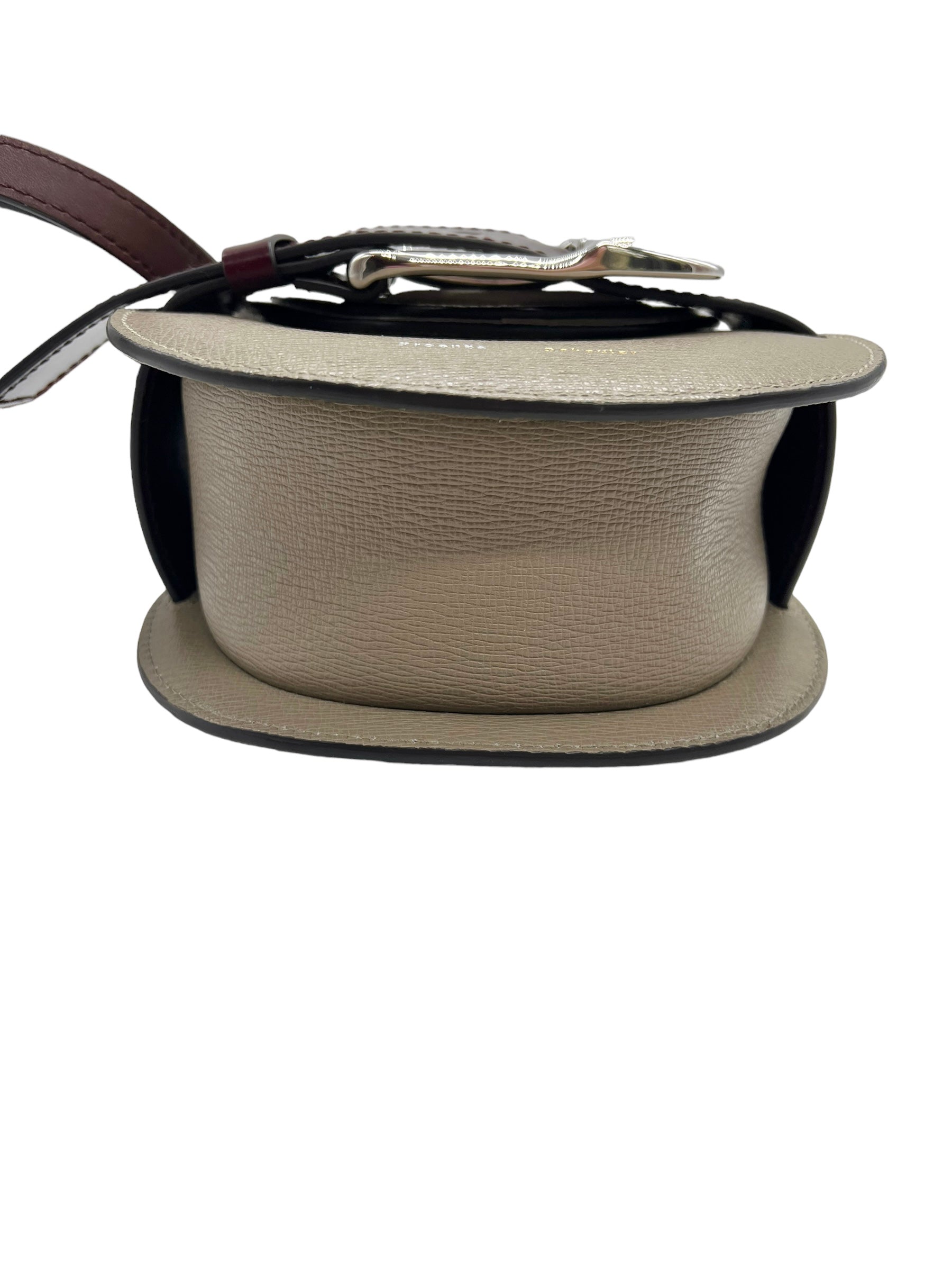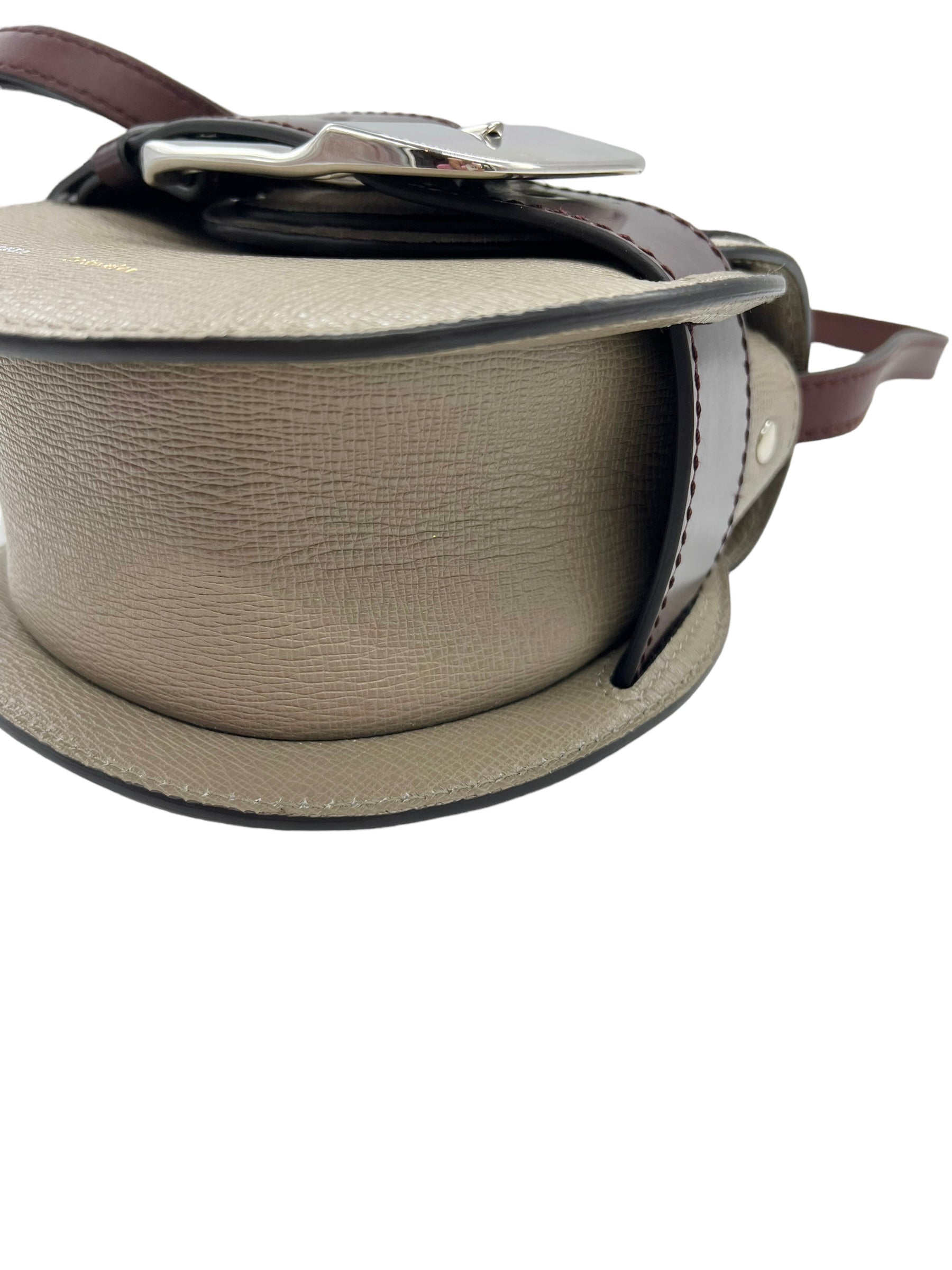 Taupe leather Buckle Mini crossbody bag with oxblood and brown leather details, silver hardware and adjustable strap. Comes with original tags and dust bag.