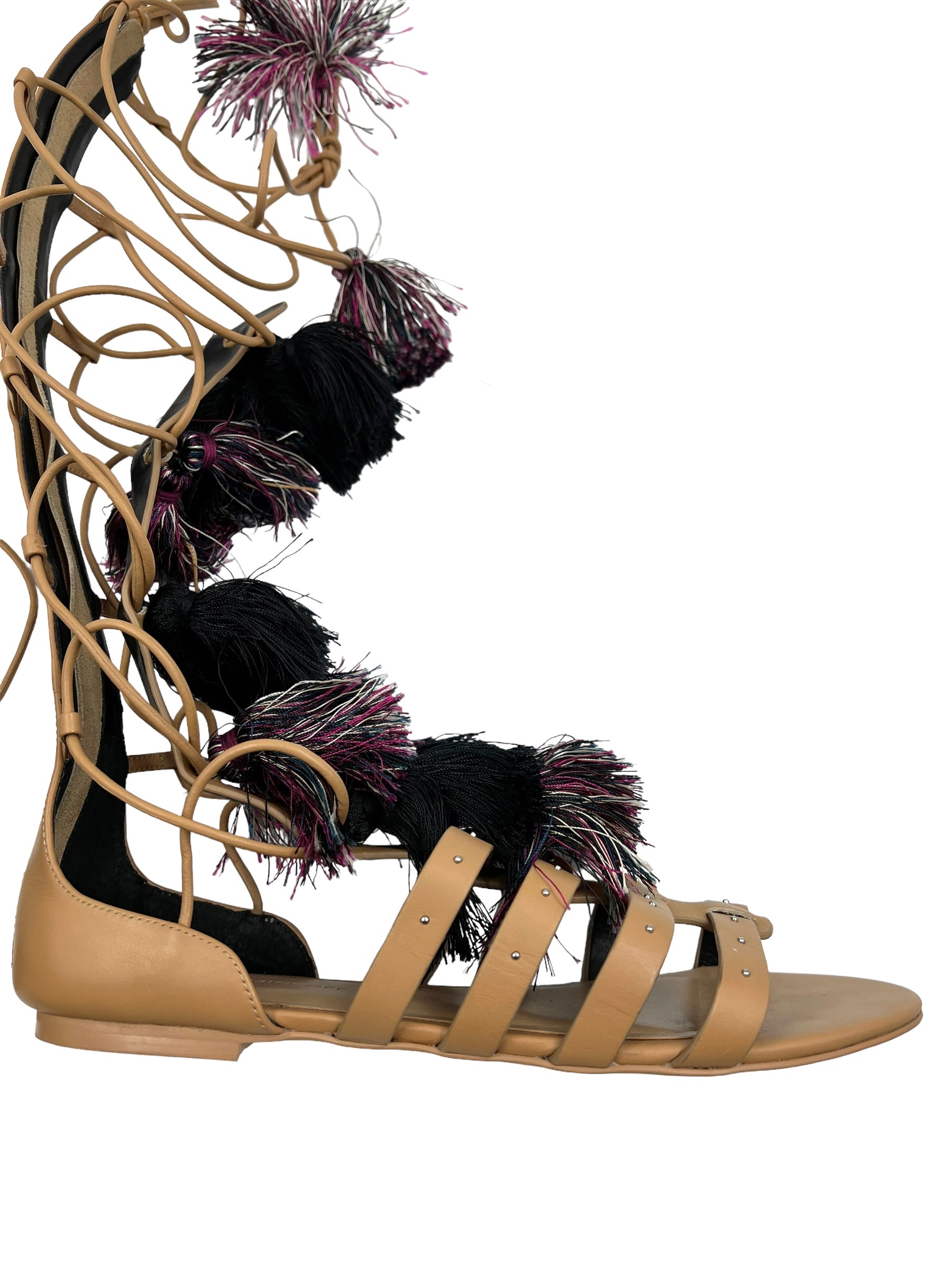 Tan leather tall lace up gladiator heels with colorful tassel pom pom detail. Comes with box.