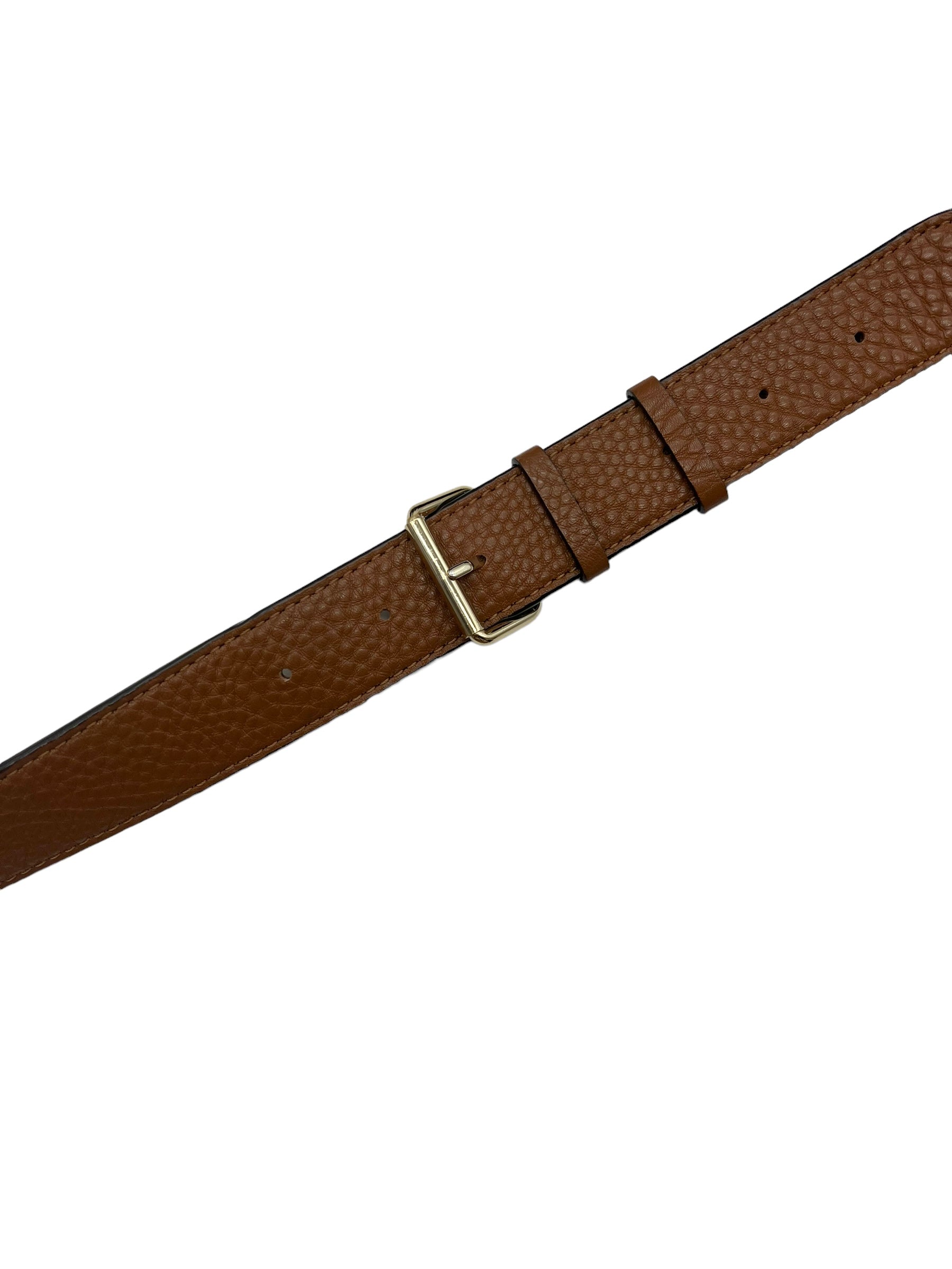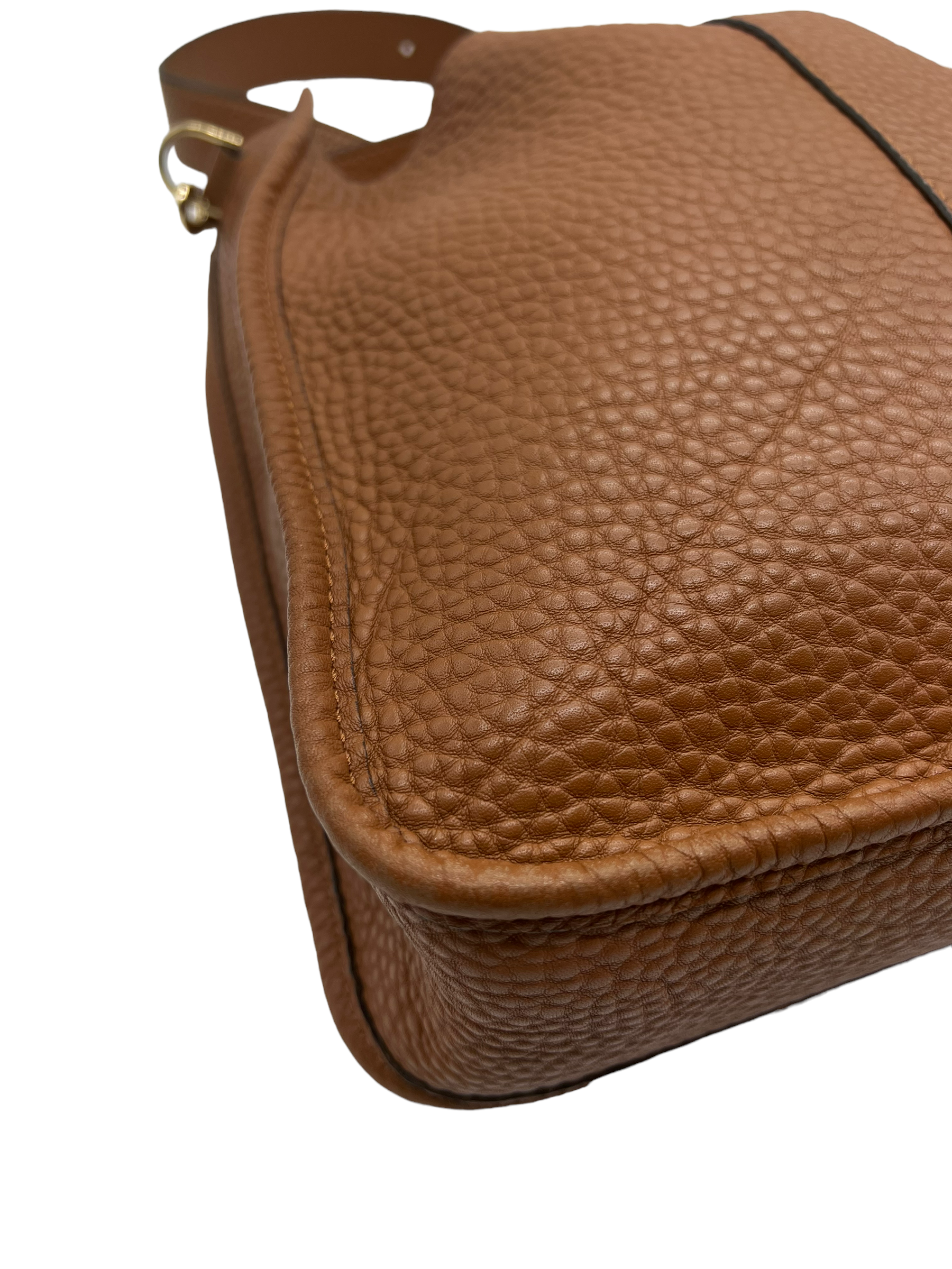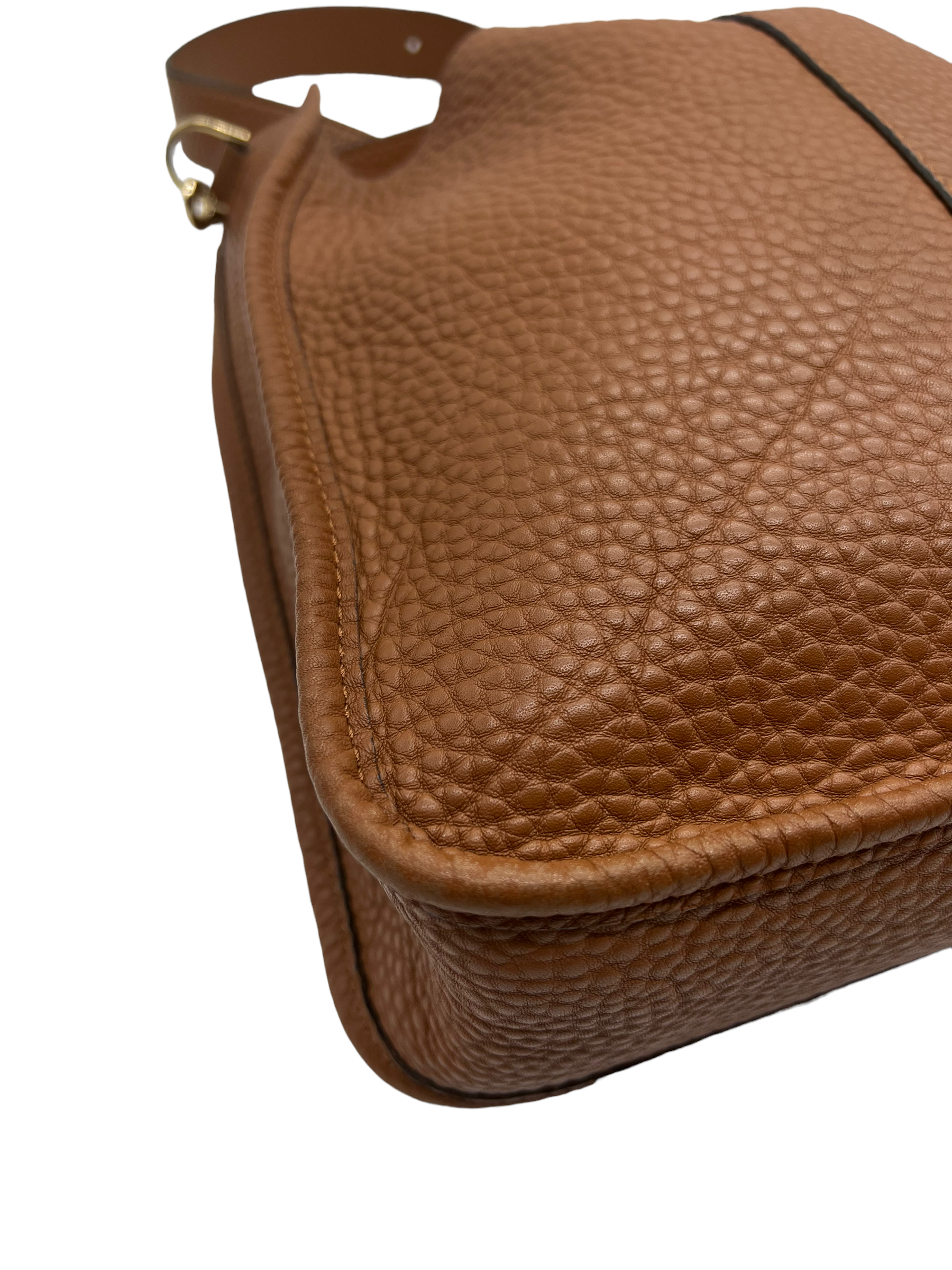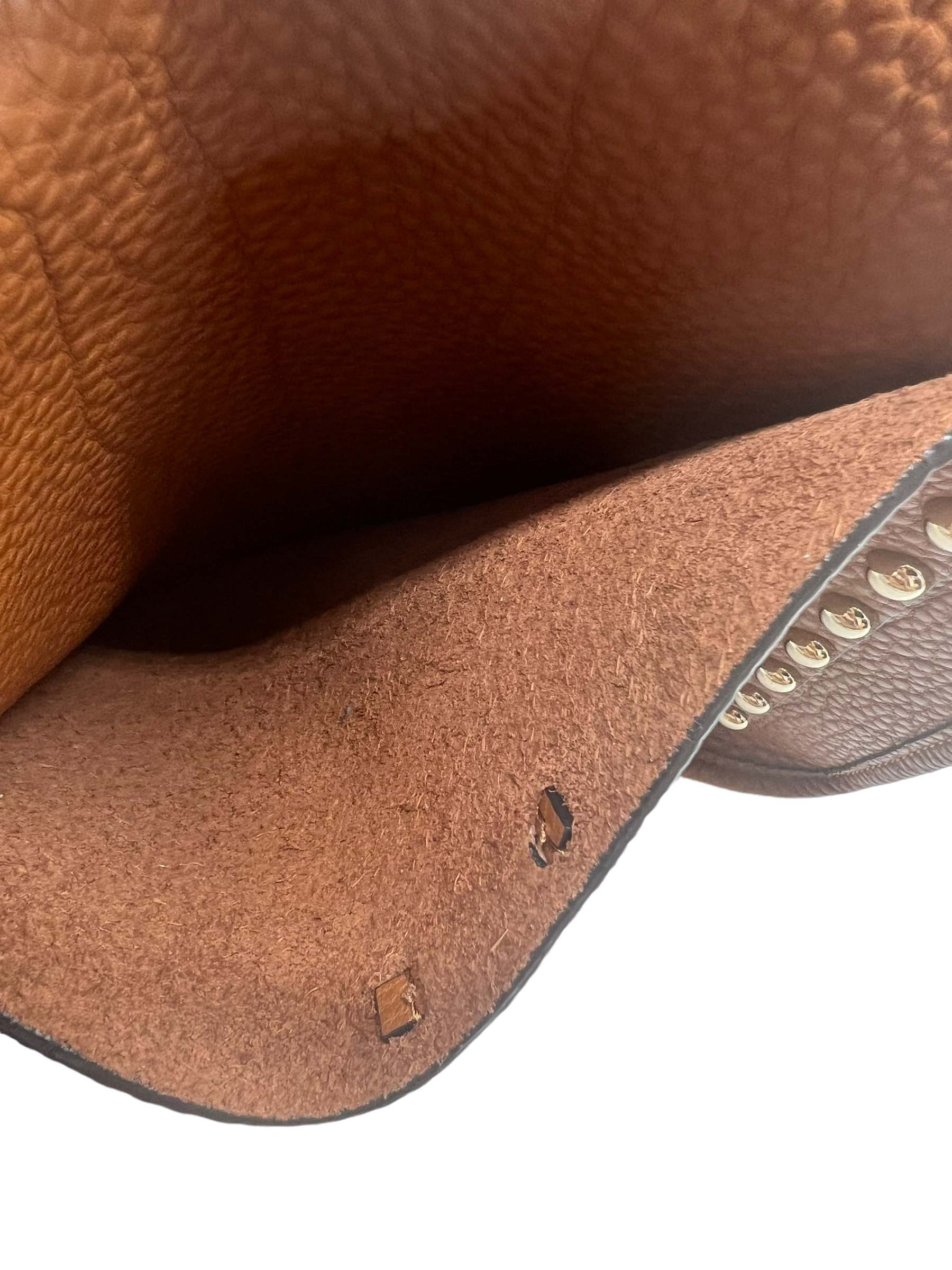 Tan leather unlined feed bag style crossbody with gold stud detail. Does not come with dust bag.
