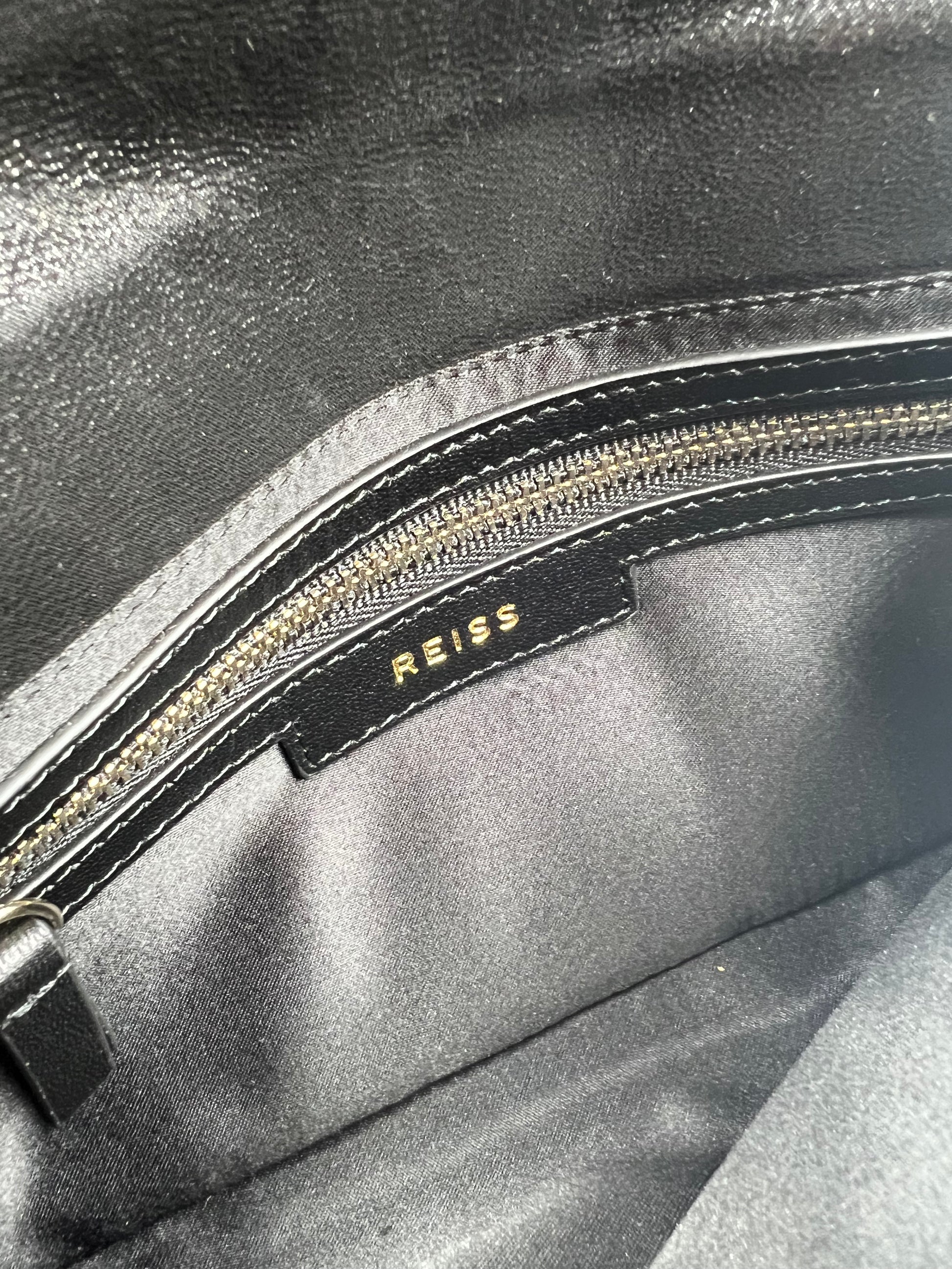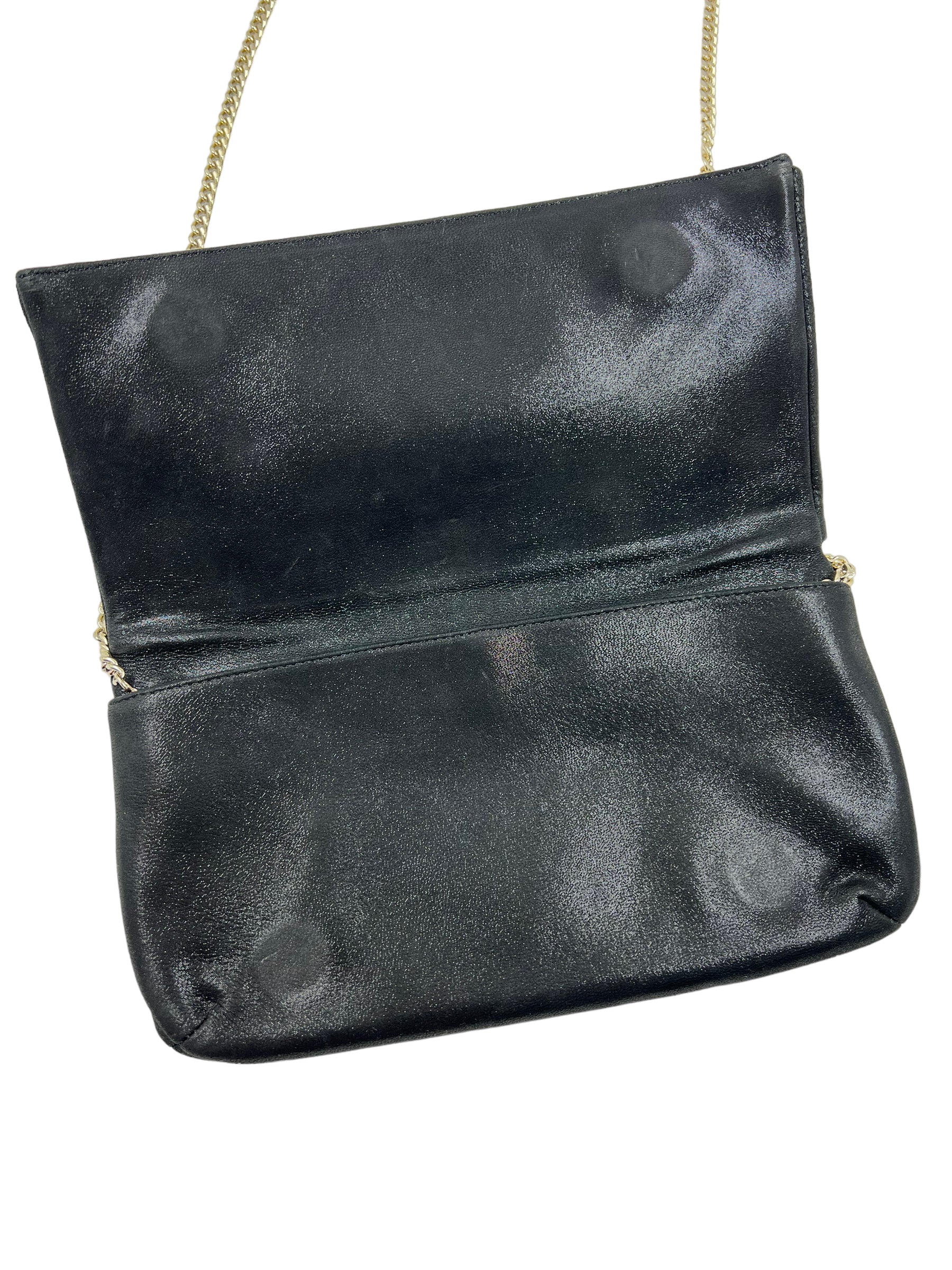 Black iridescent suede Beau clutch with pleated detail and removable gold chain strap. Comes with dust bag.