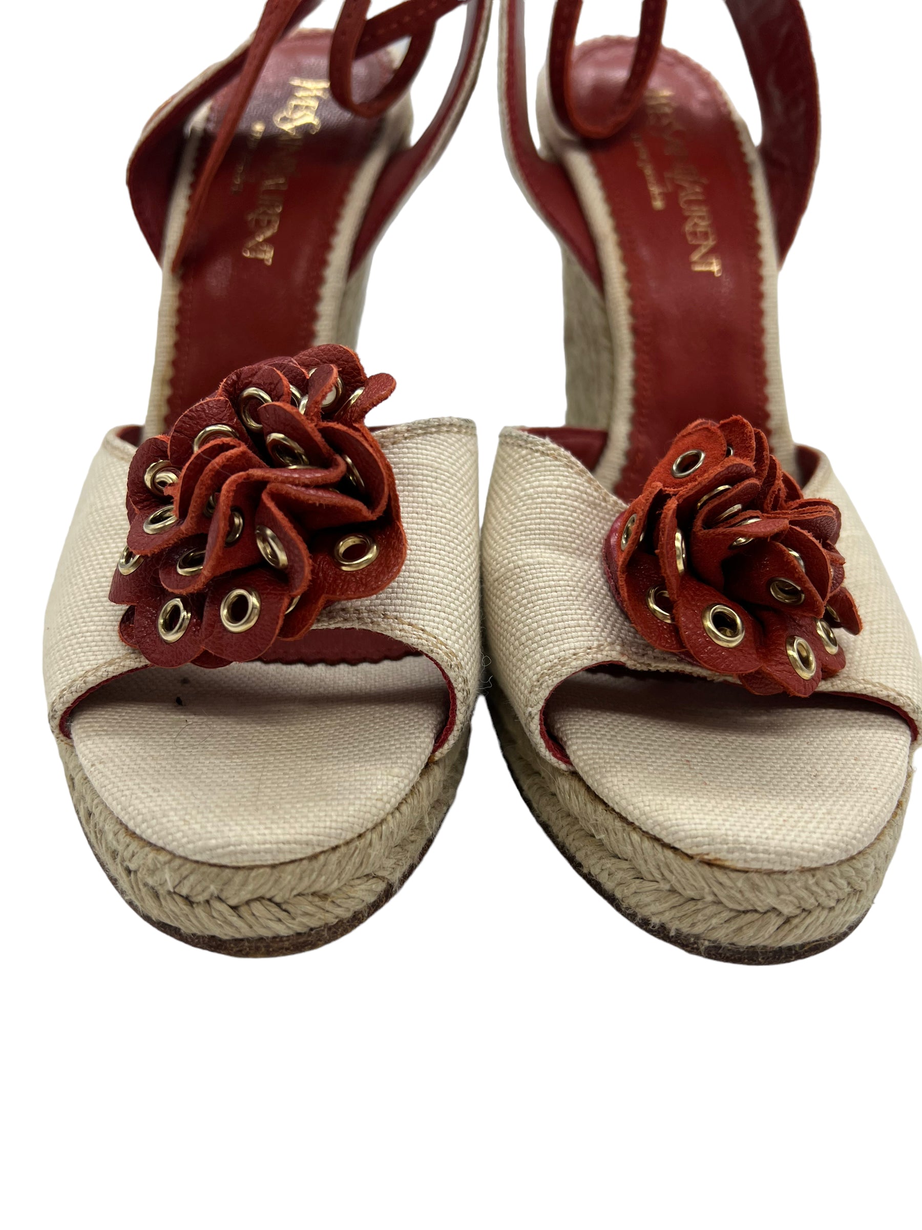 Beige canvas wedges with red leather flower detail, trim and ankle tie. Features gold grommet detail and hemp wedge. Does not come with dust bag or box.