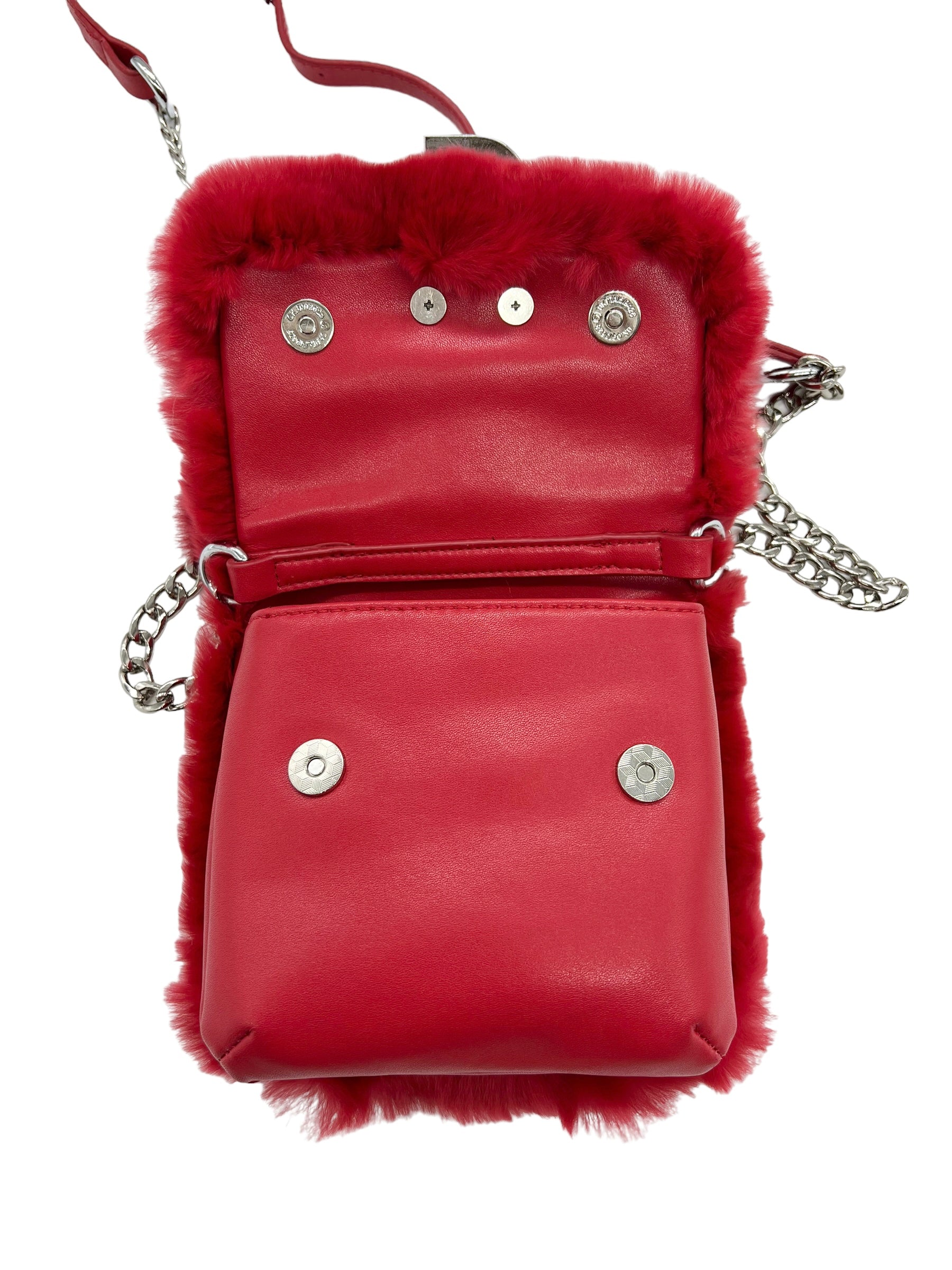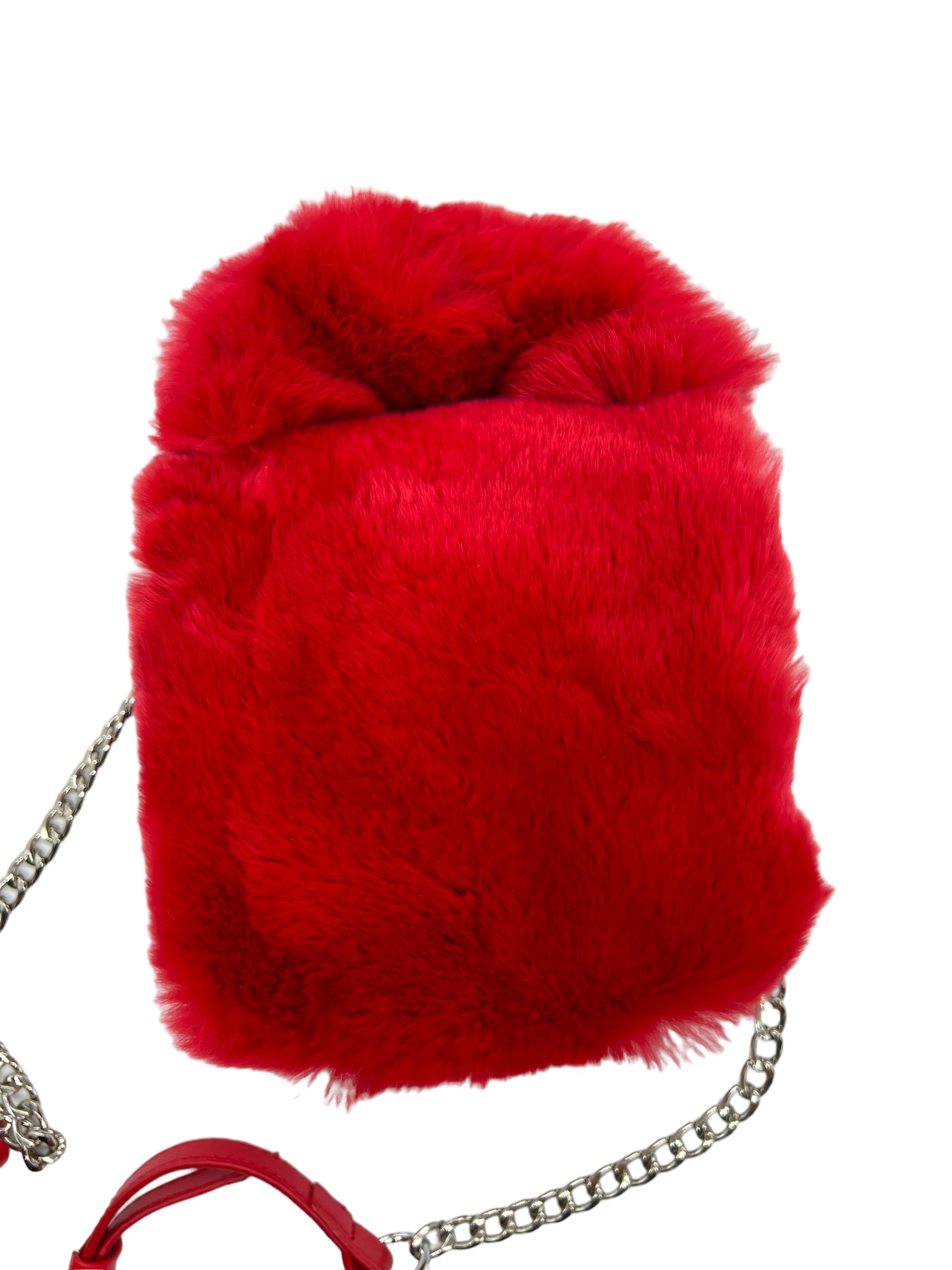 Red faux fur bag with top handle, adjustable chain strap and silver hardware. Features faux leather trim. Comes with dust bag.