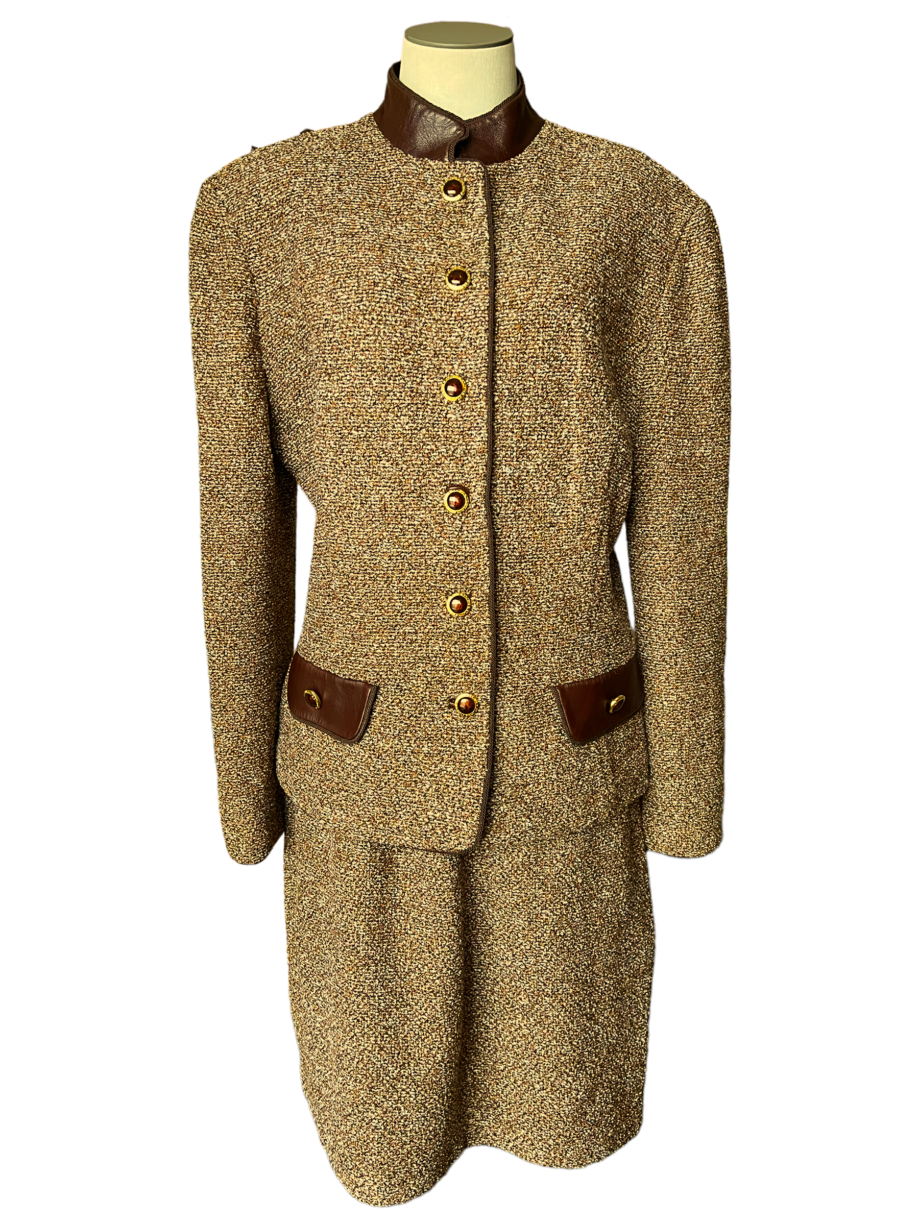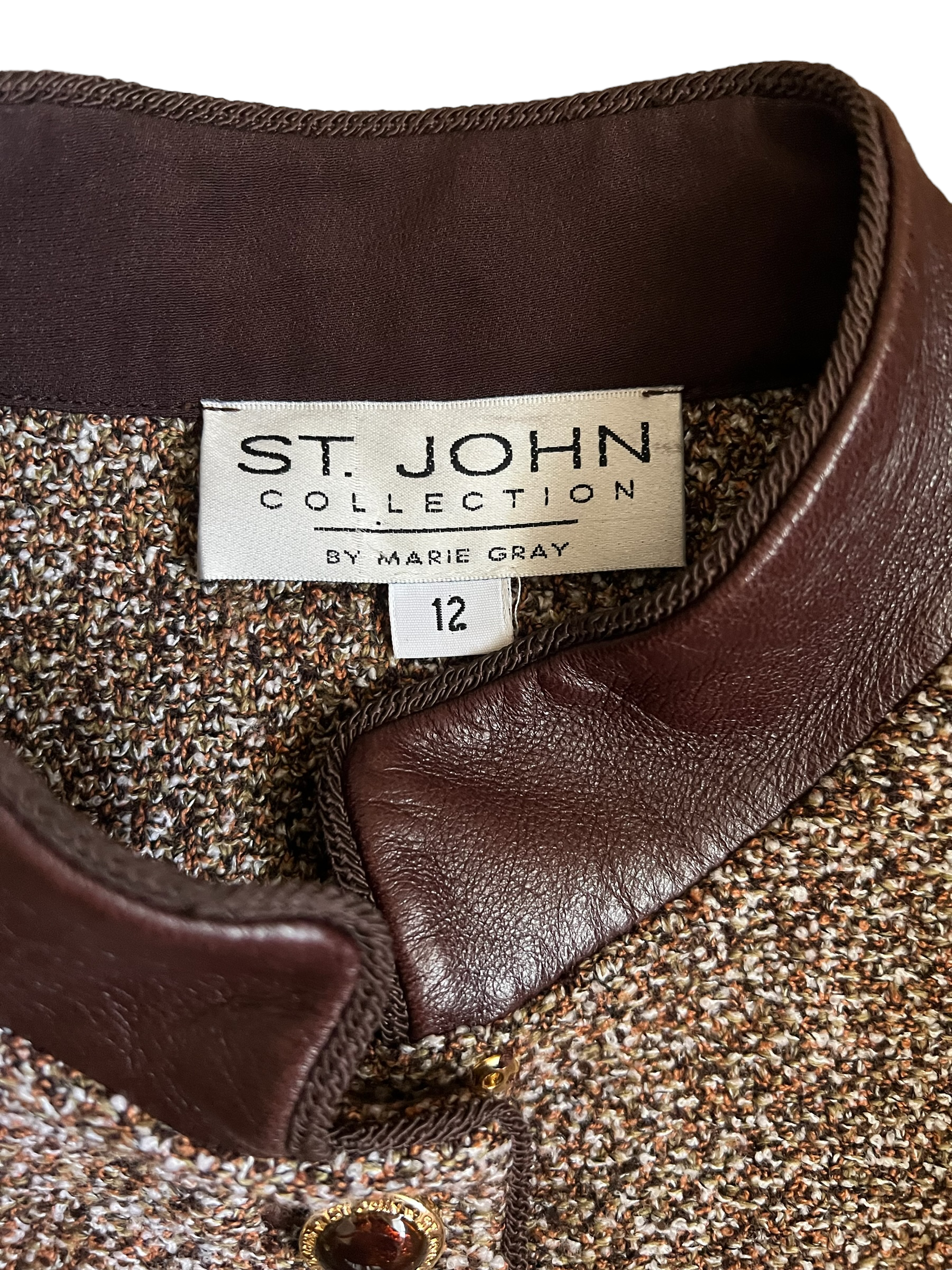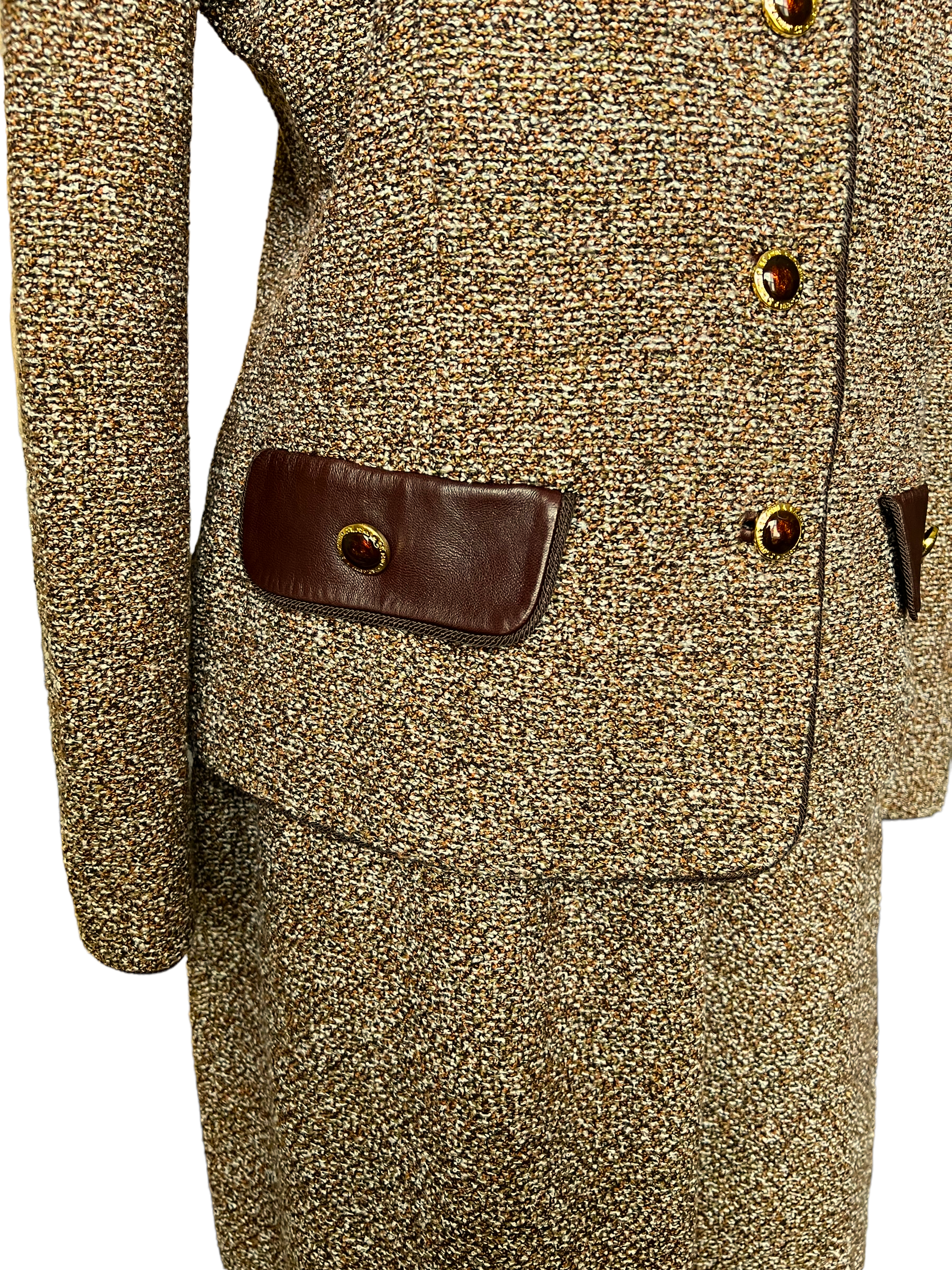 St. John brown classic knit with brown leather trim/detail and brown marble buttons with gold trim. Comes with matching skirt