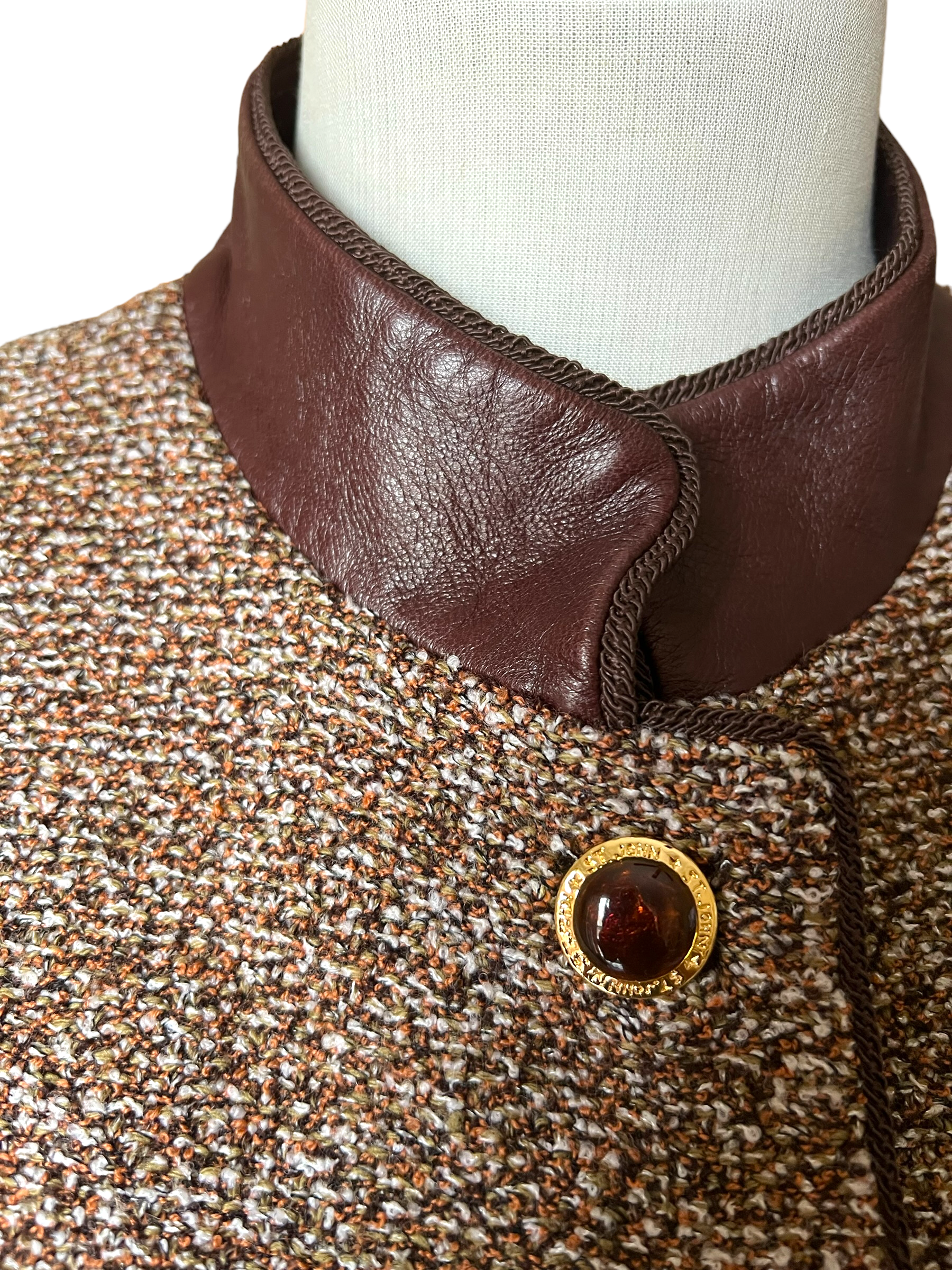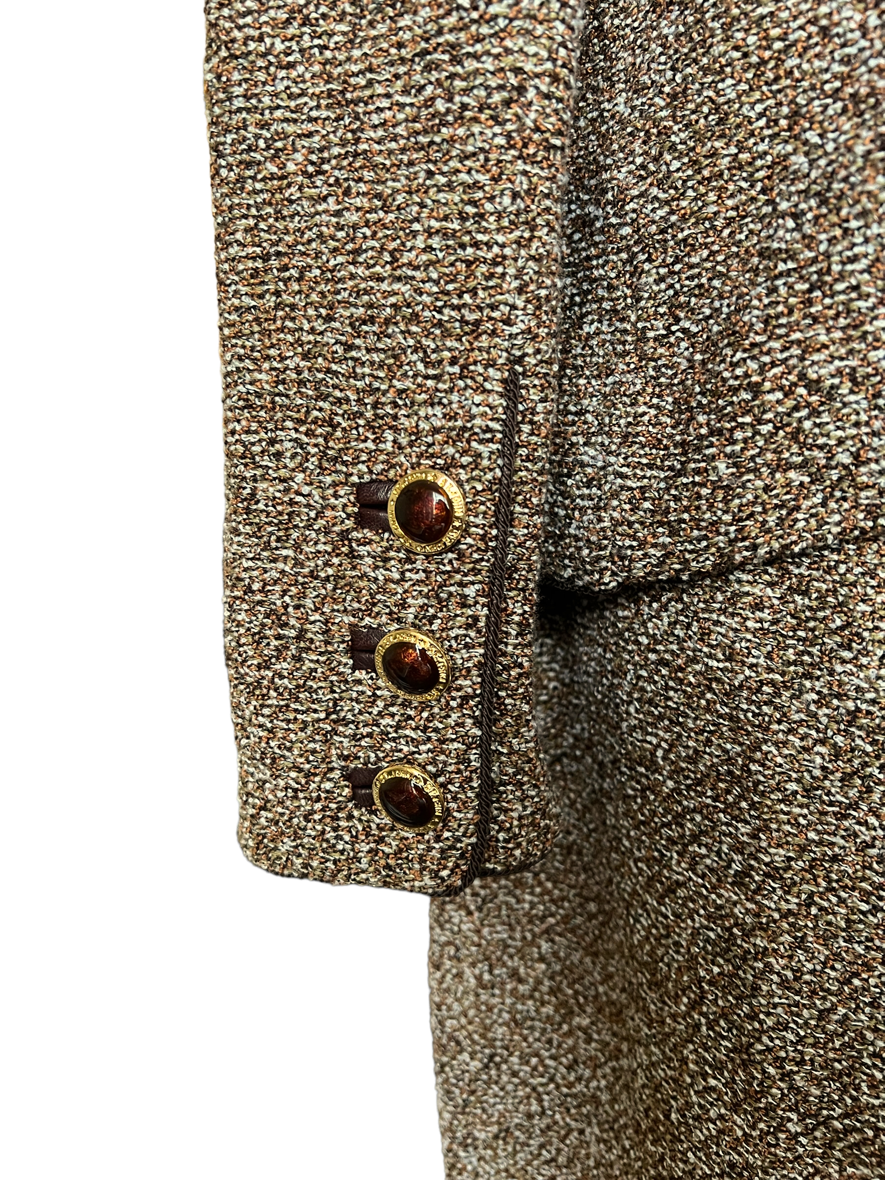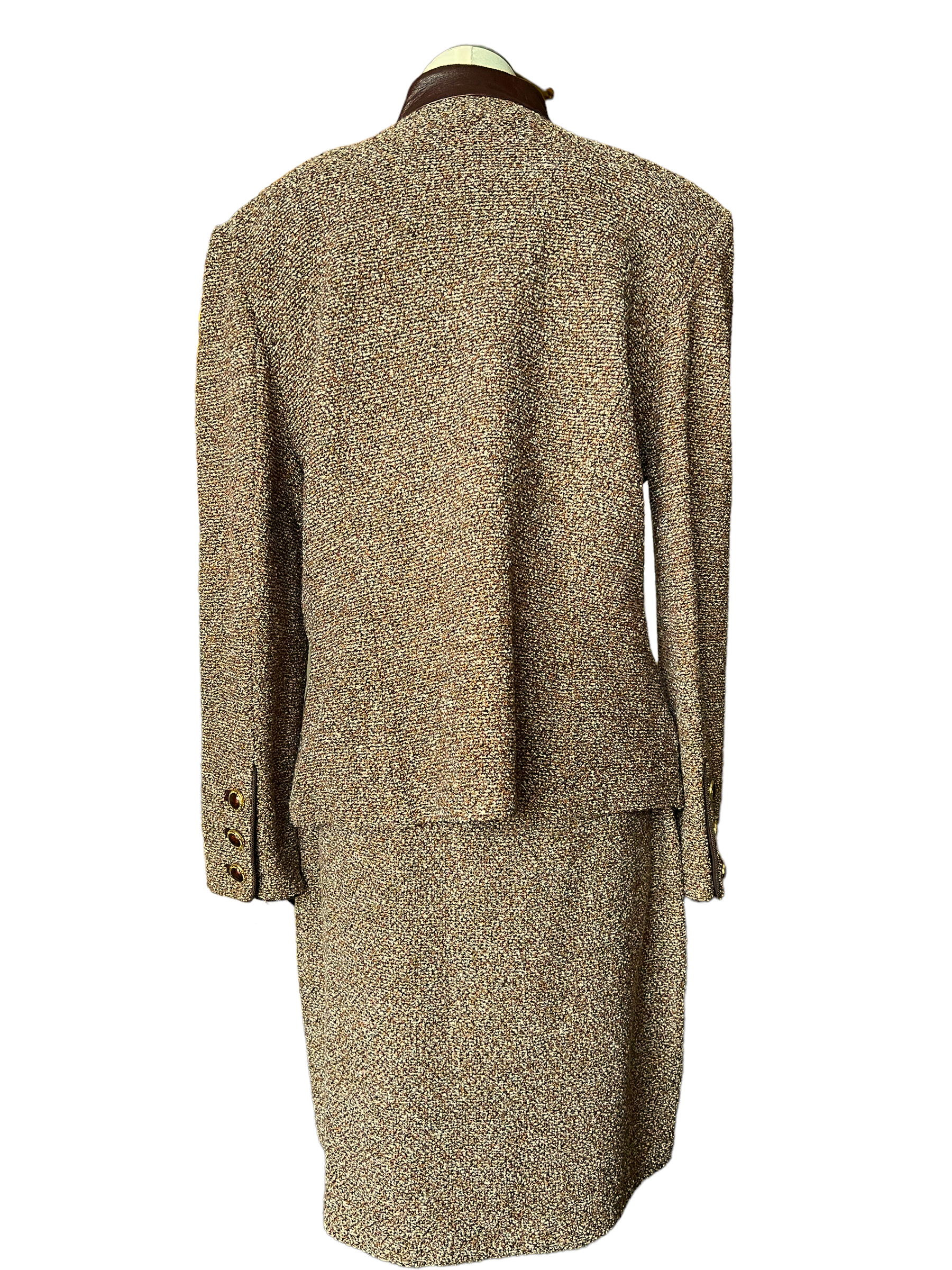 St. John brown classic knit with brown leather trim/detail and brown marble buttons with gold trim. Comes with matching skirt