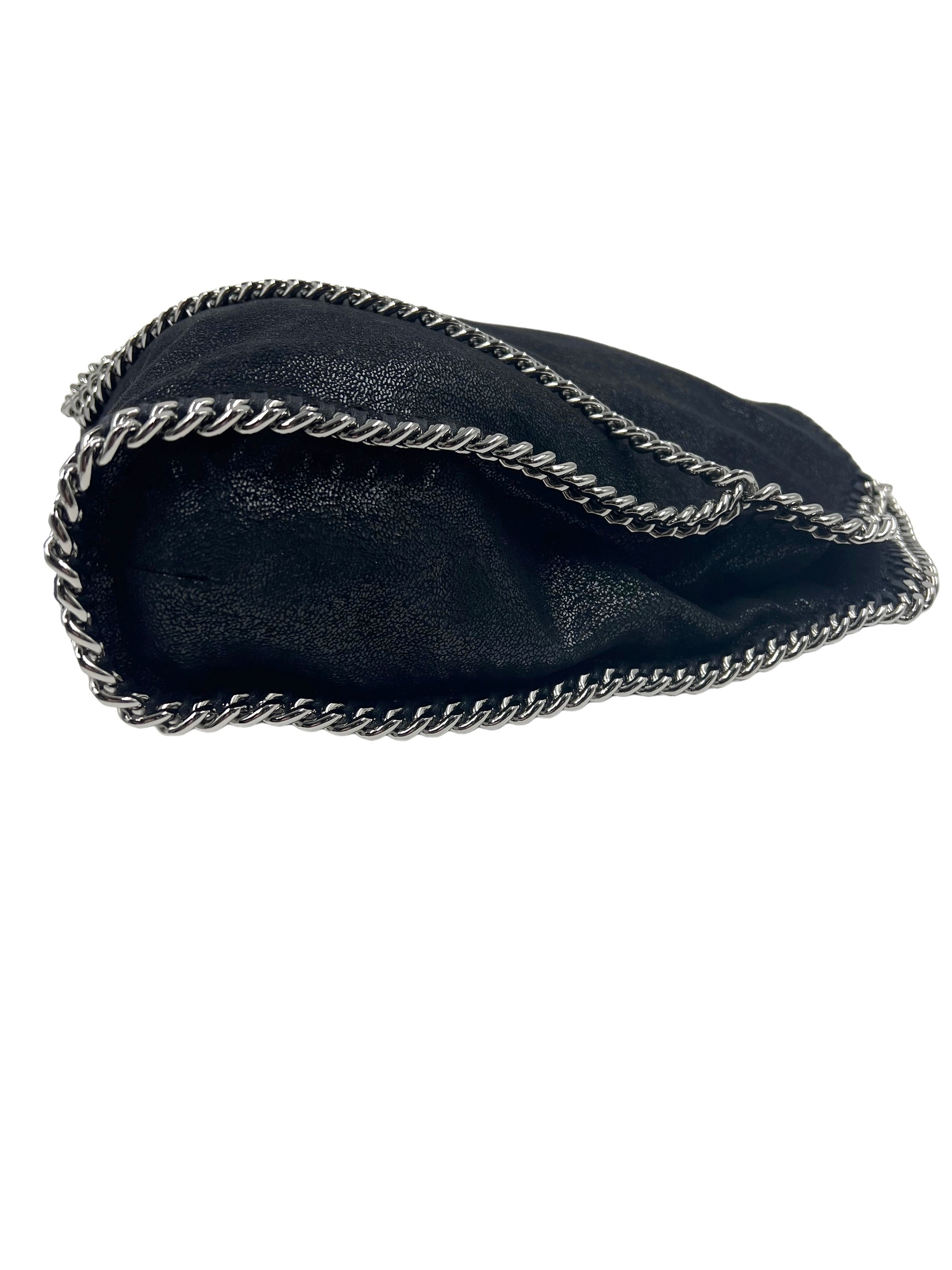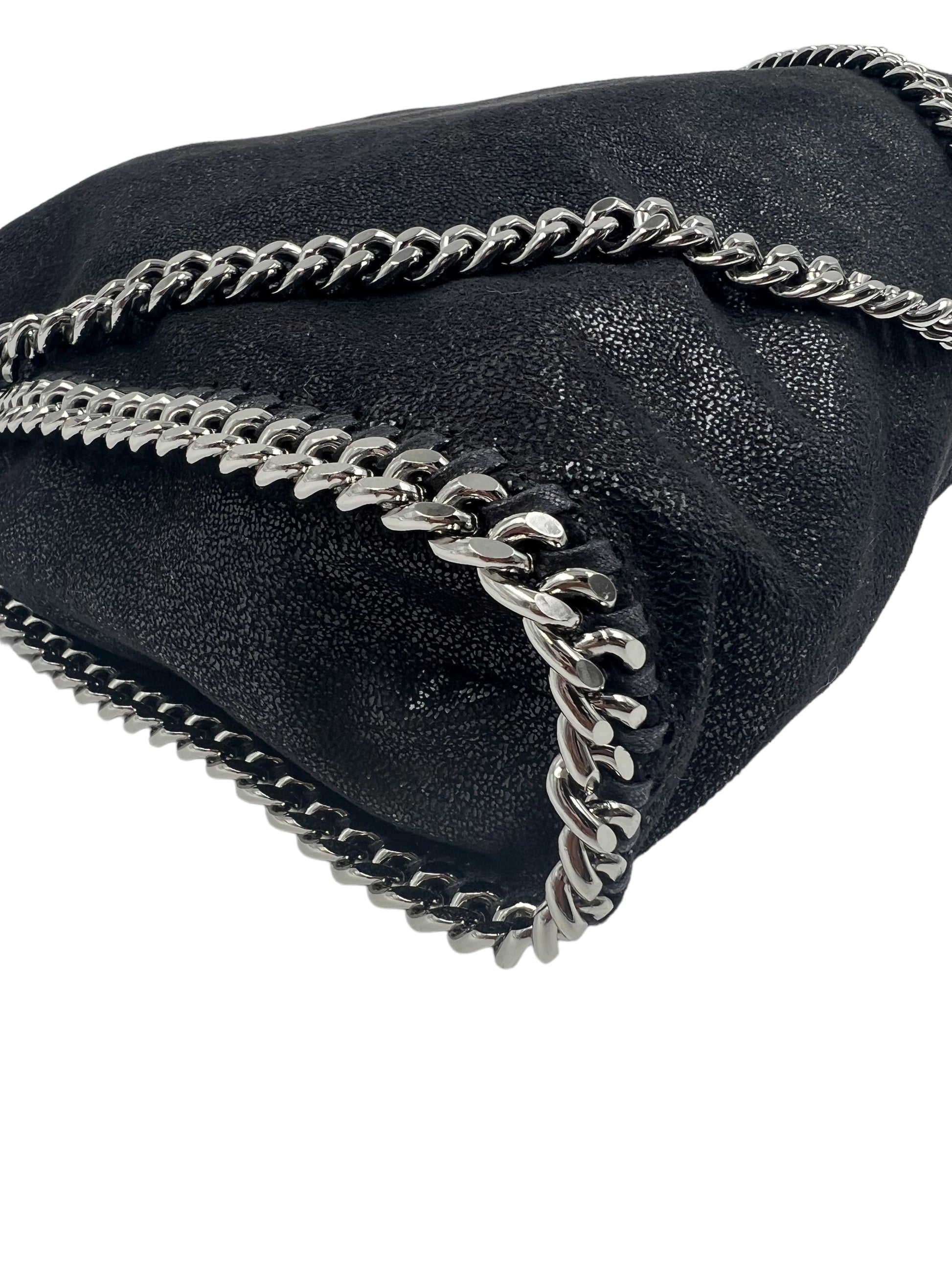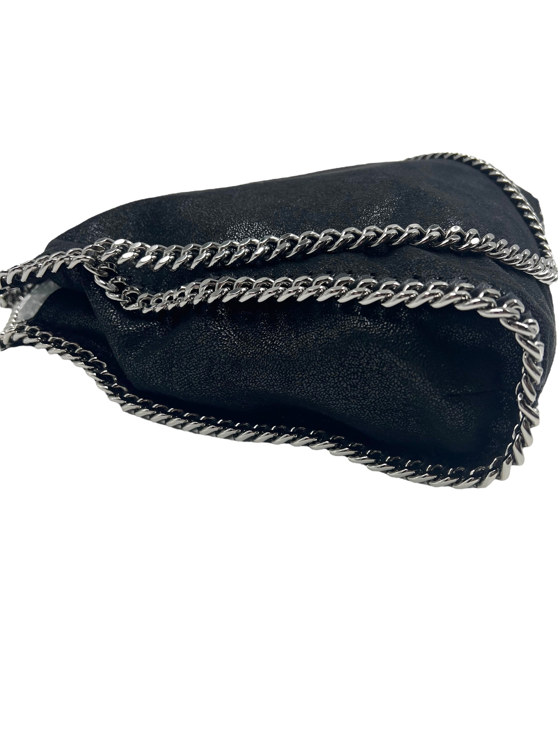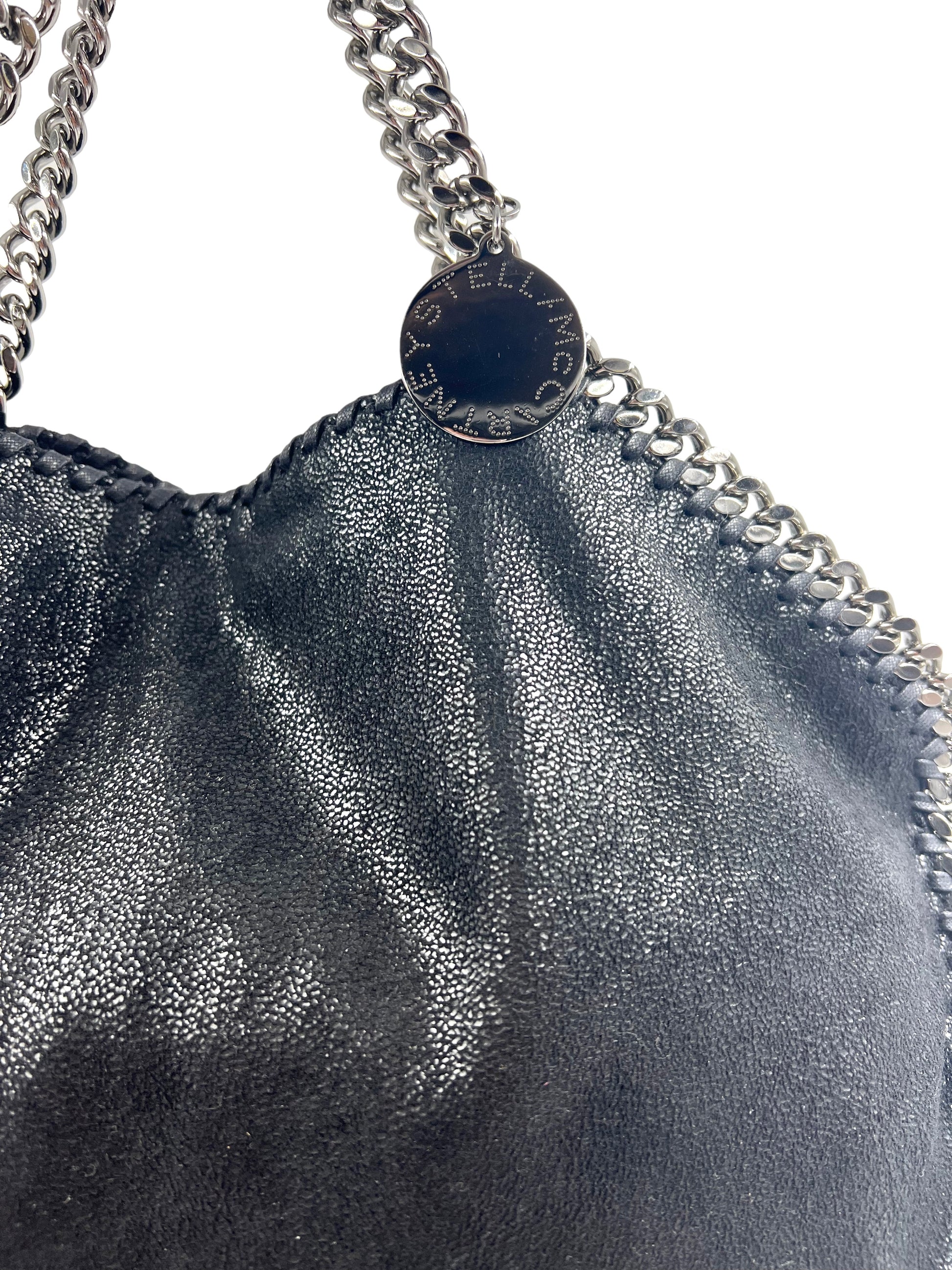 Black shimmery vegan suede Three Chain Falabella shoulder bag with silver hardware and chain trim. Features snap top closure and interior zip pocket. Comes with dust bag.