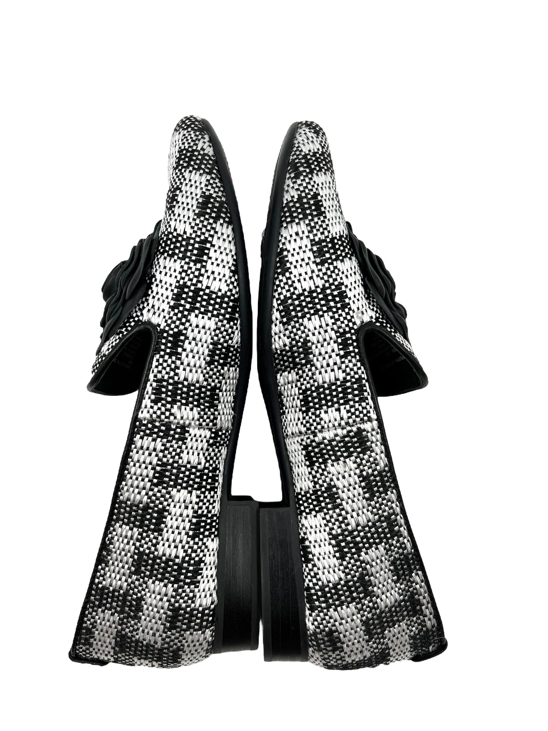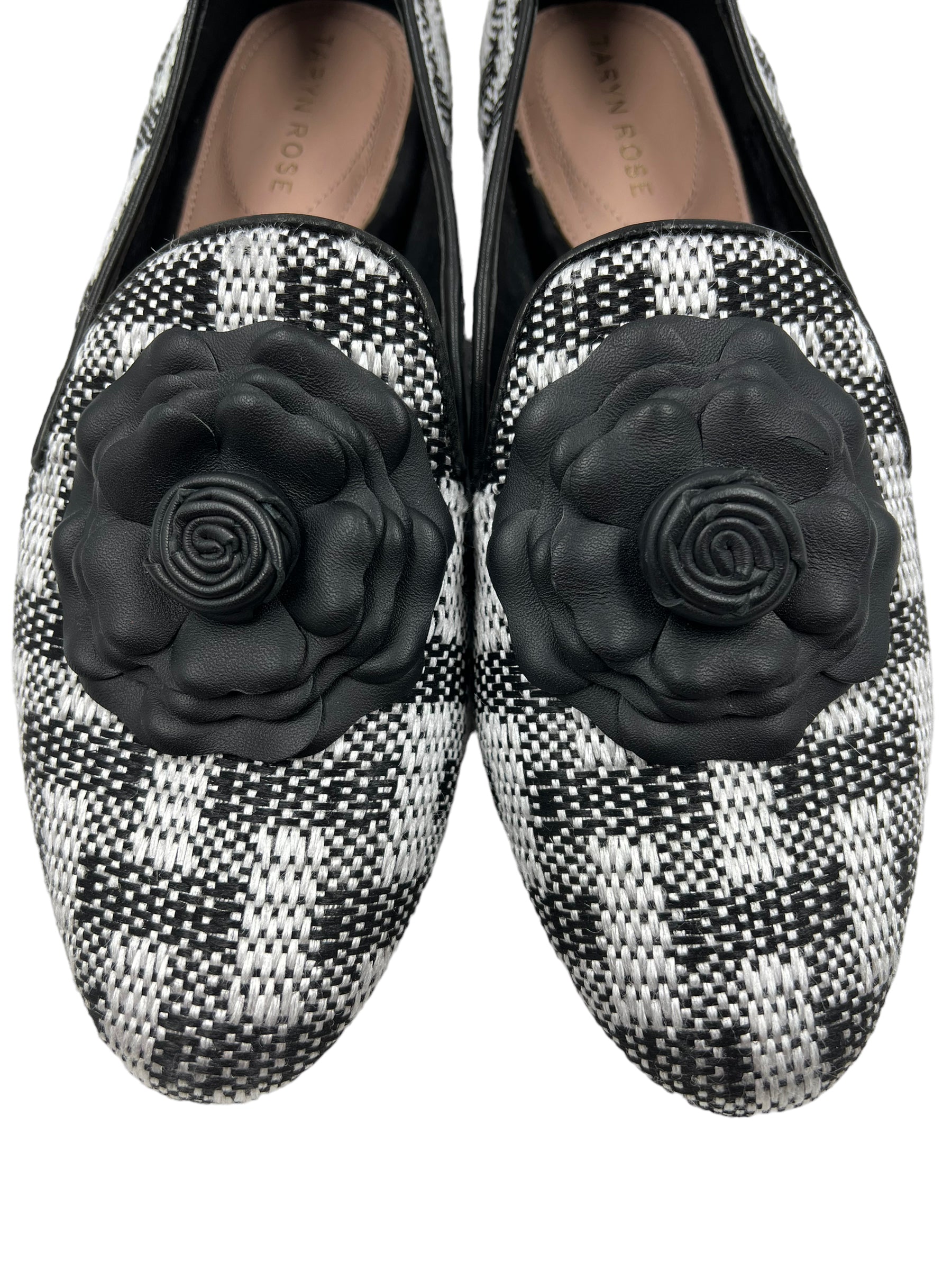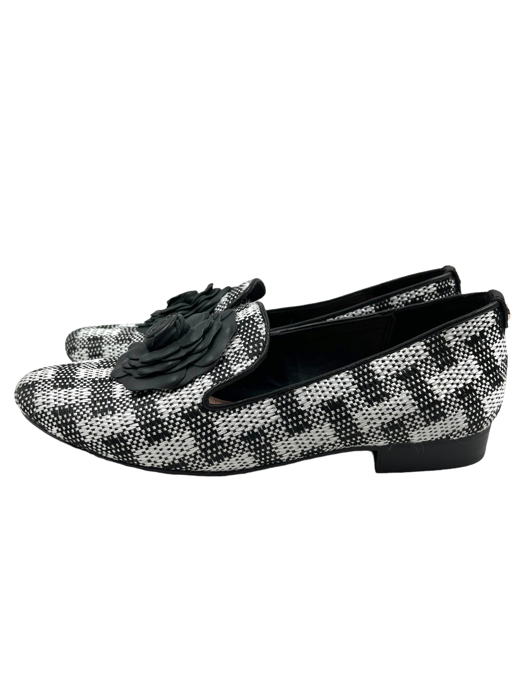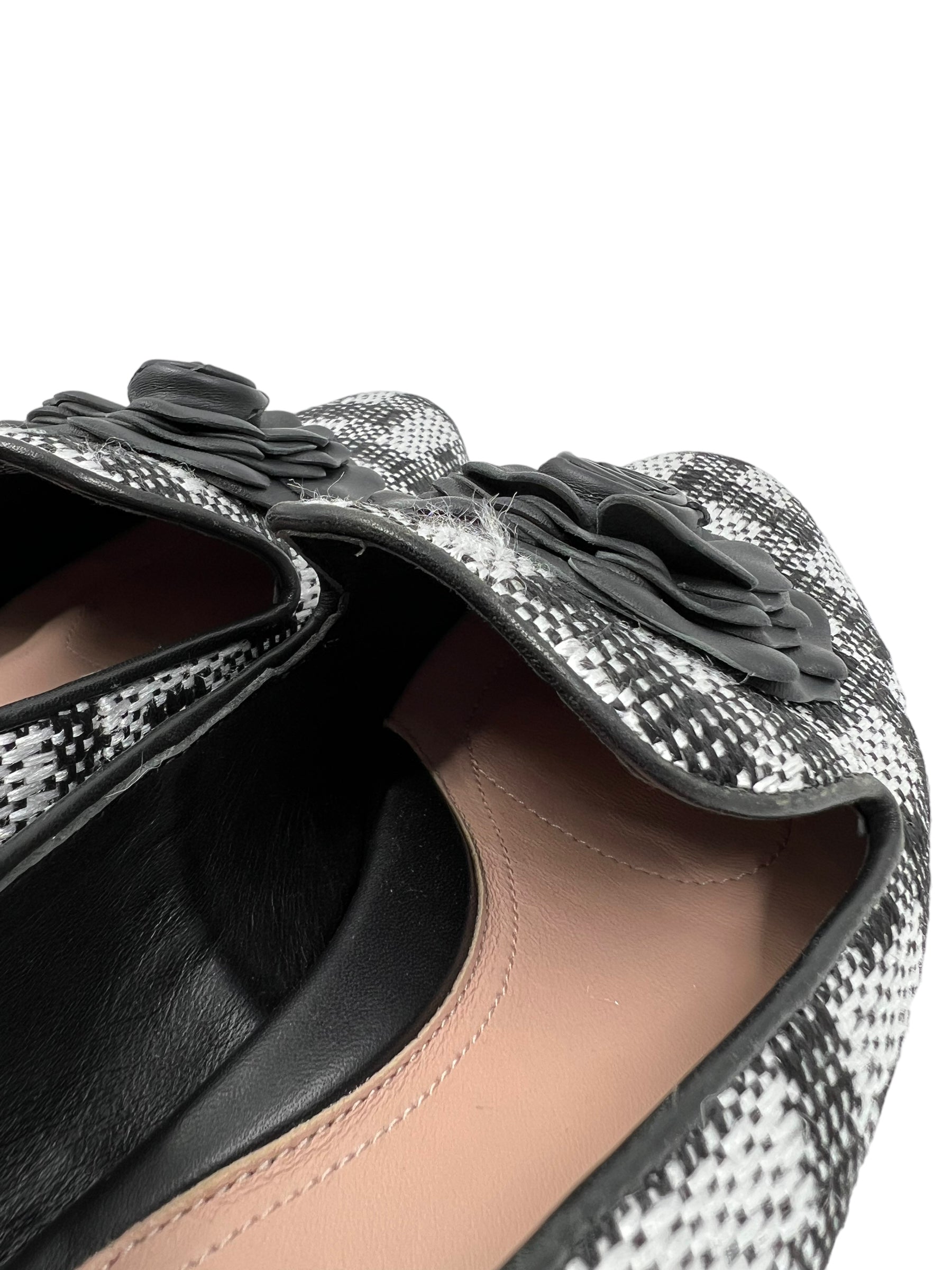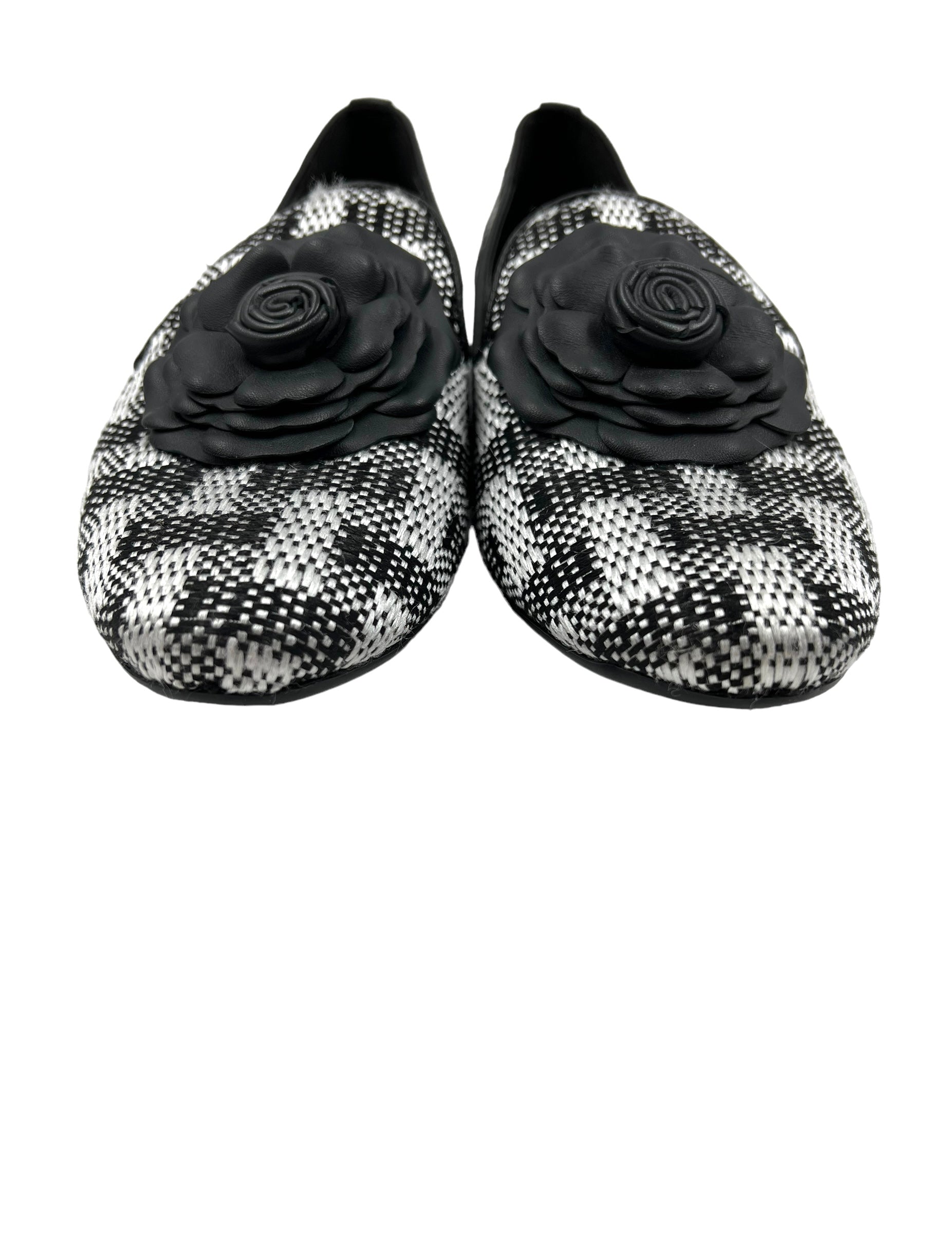 Black and white woven plaid Brigitta flats with leather rose detail on toe beds. Shoes do not come with dust bag or box.