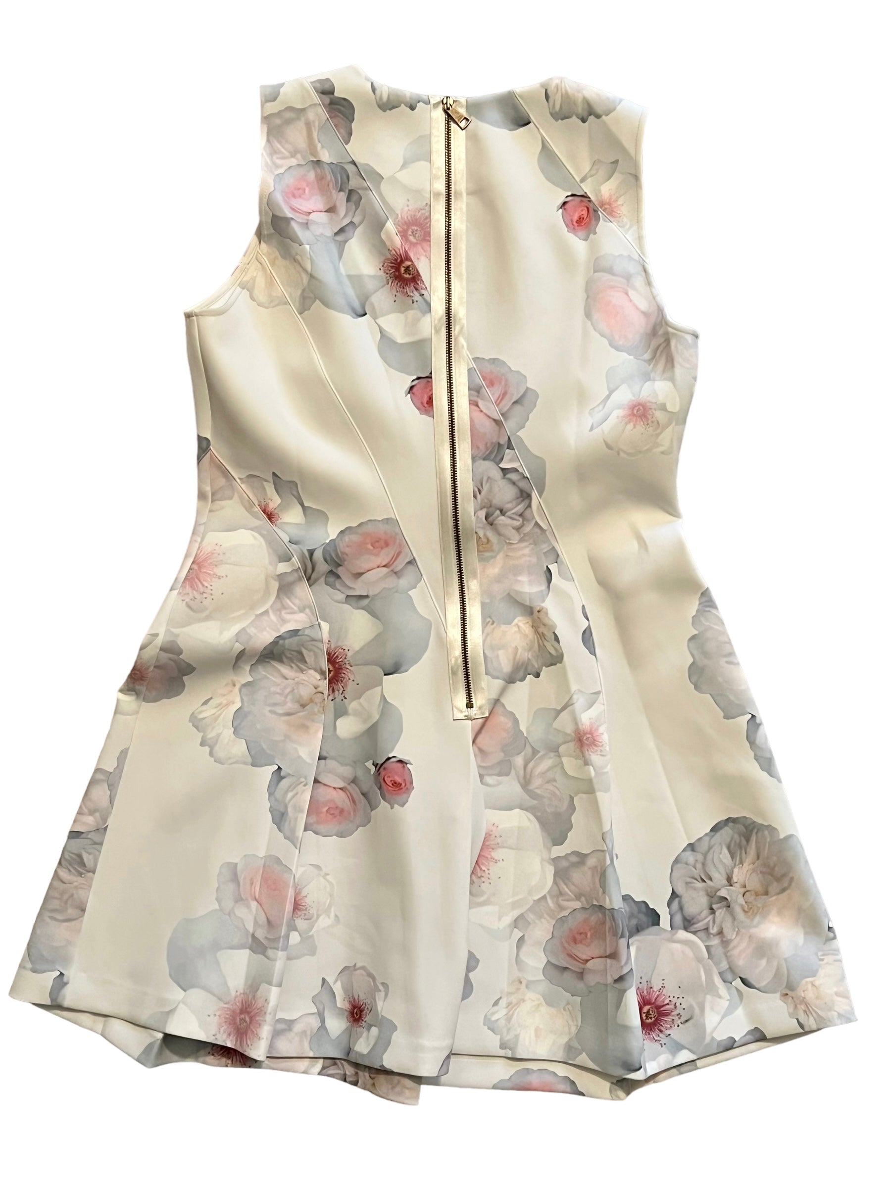 Cream multicolor floral print neoprene skater dress with exposed back zipper and pleated skirt details. Comes with tags.