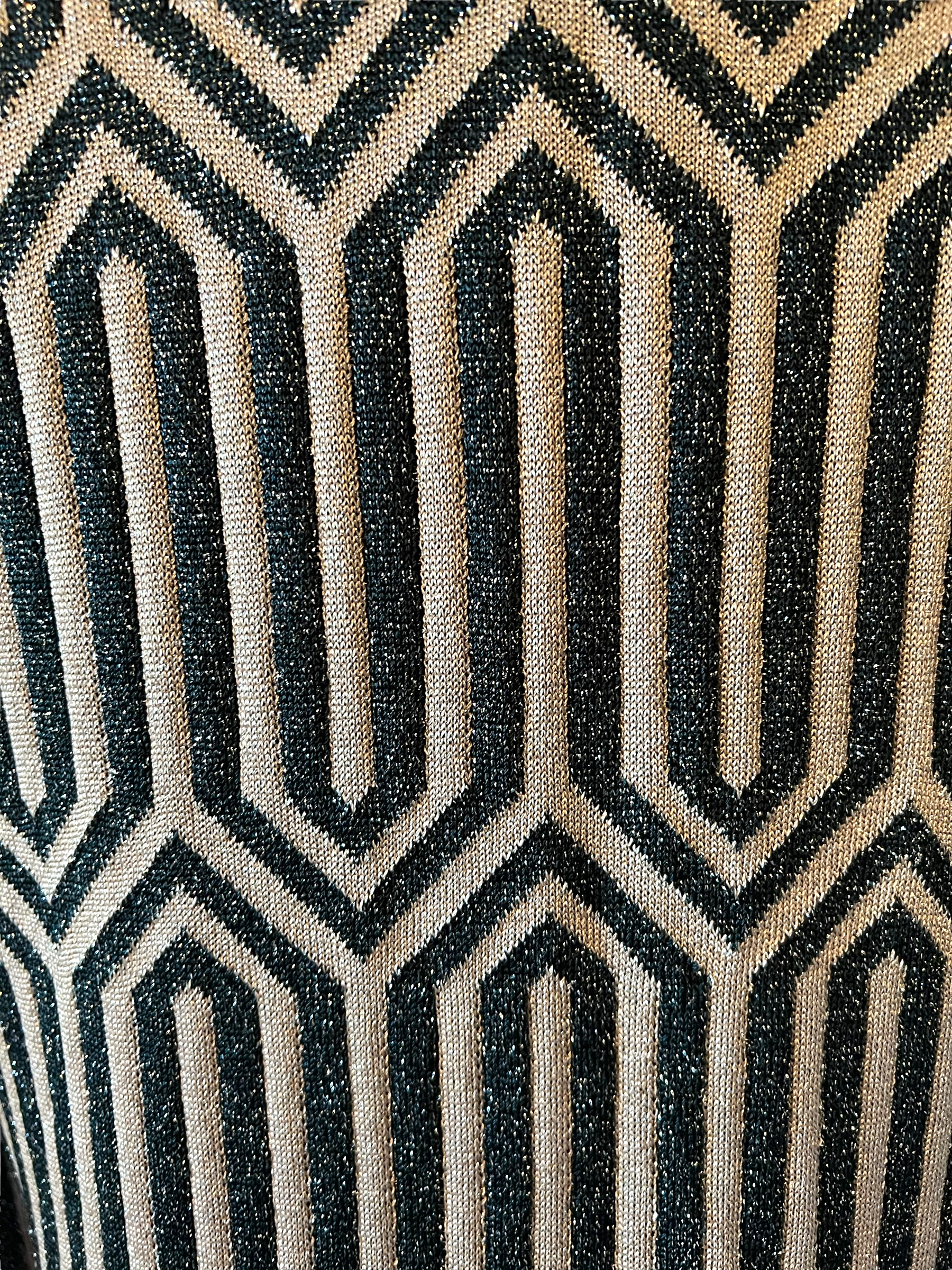 Beige and navy metallic lurex knit long sleeve dress with original tags