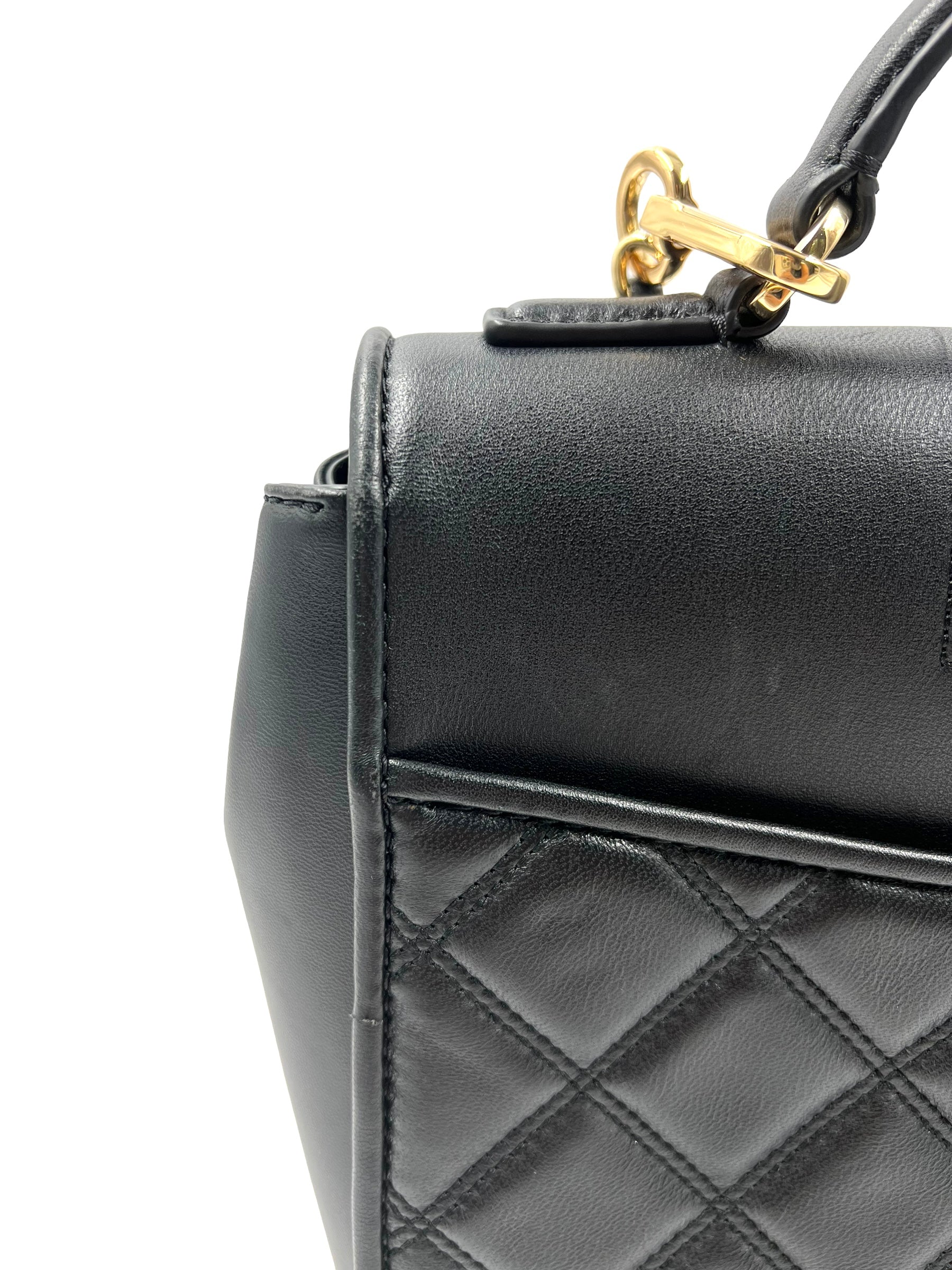 Black quilted leather top handle logo flap bag with removable/adjustable chain strap and gold hardware. Does not come with dust bag.
