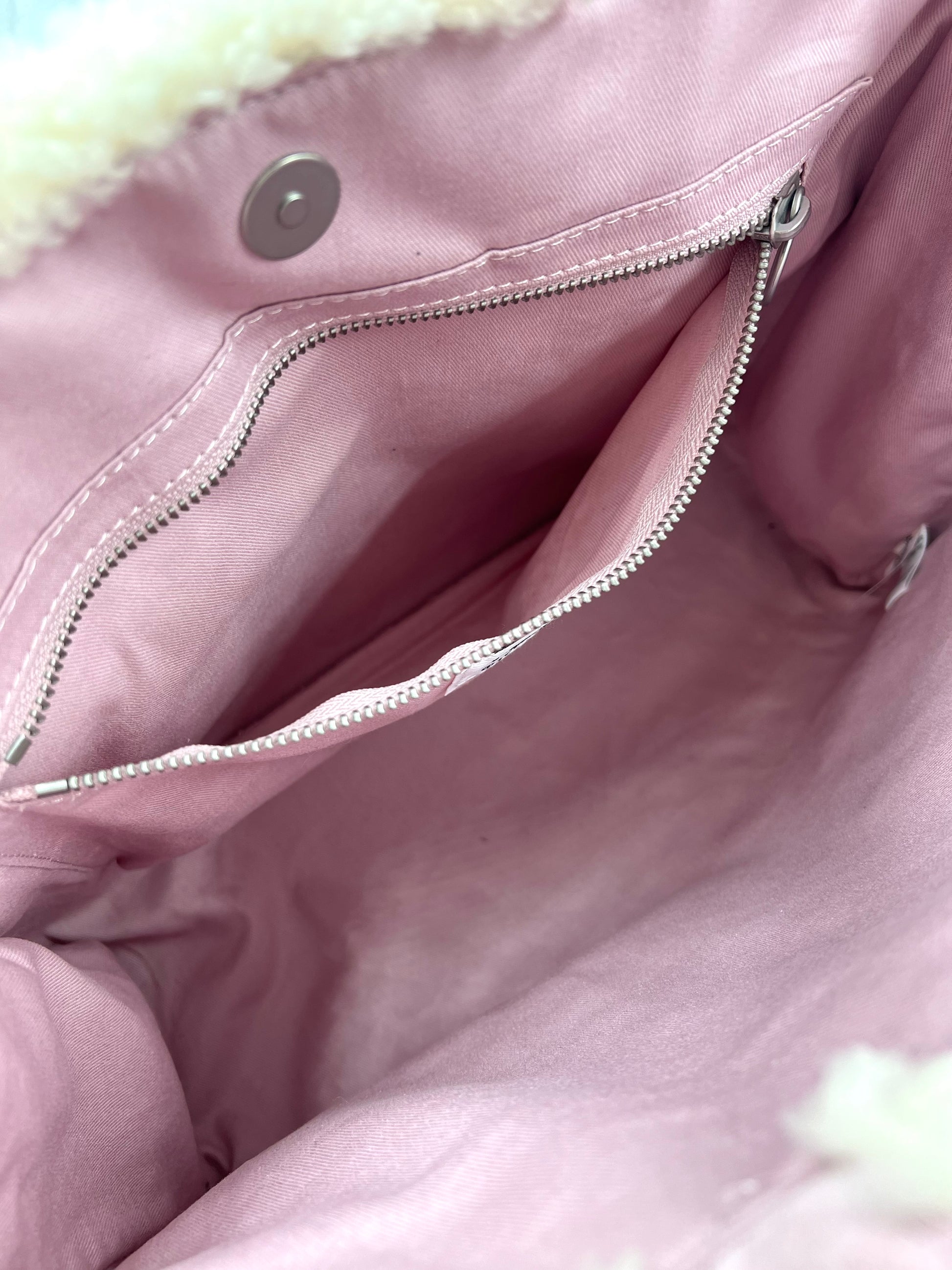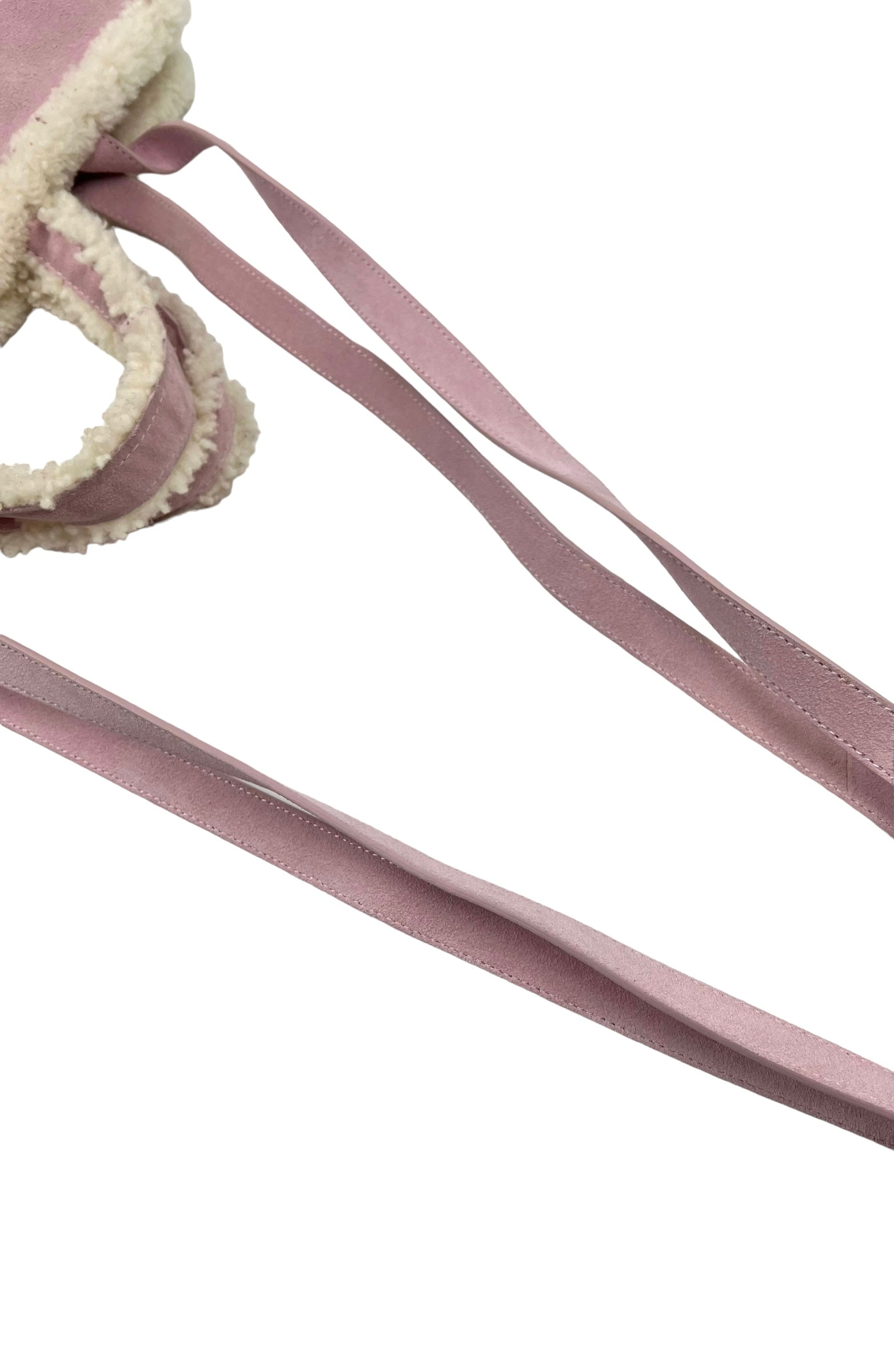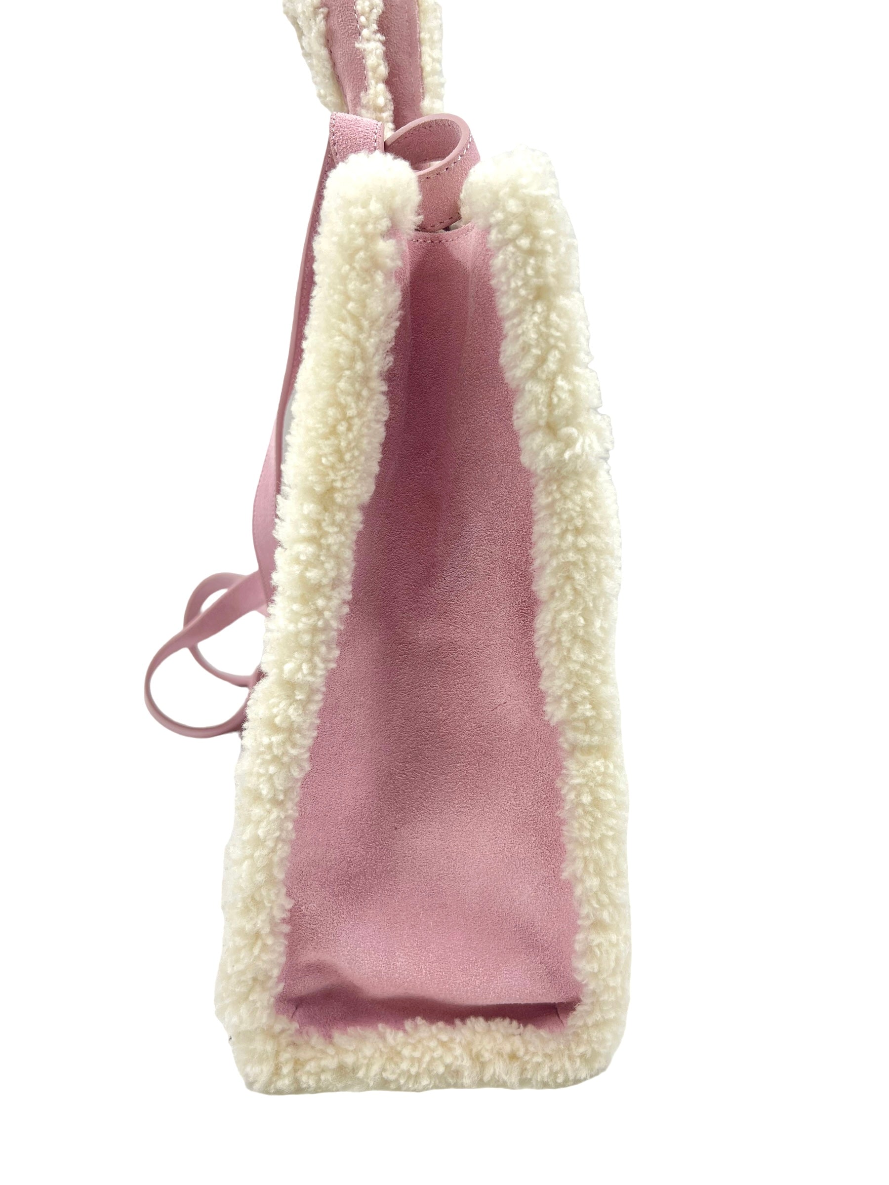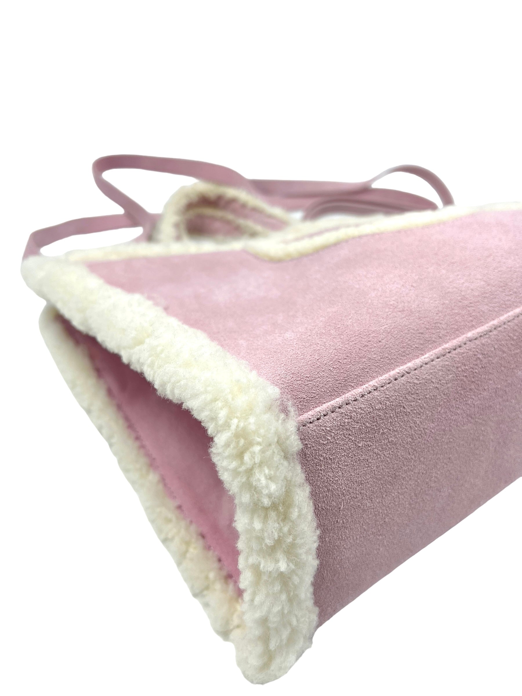 Pink suede medium shopper tote bag with shearling trim. Features top handles and long double straps with interior zip pocket. Comes with dust bag, original plastic cover bag and original tags.