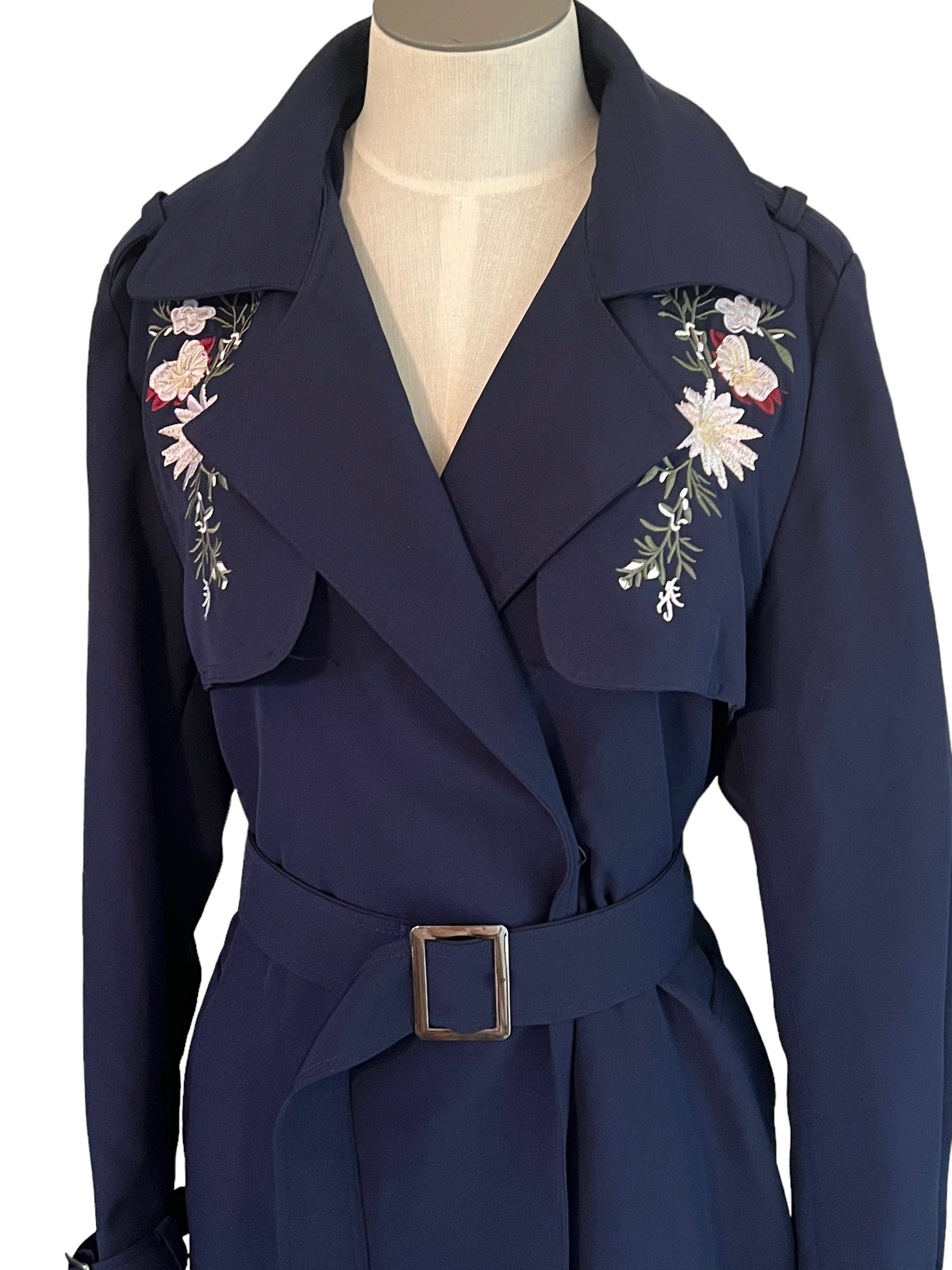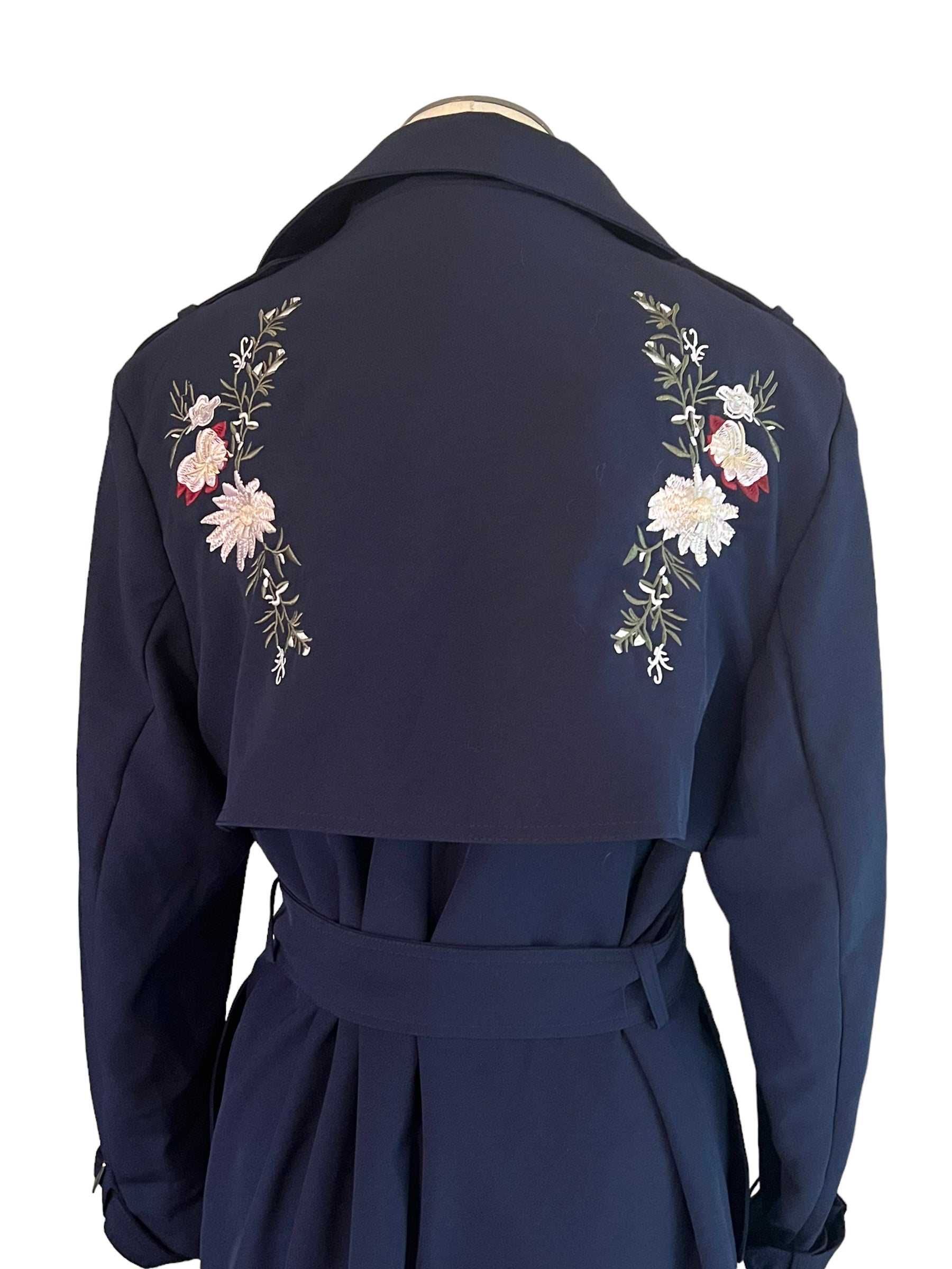 Navy lined Candy trench coat with multi color embroidered floral detail. Features double snap buttons at waist, side pockets and removable waist belt.
