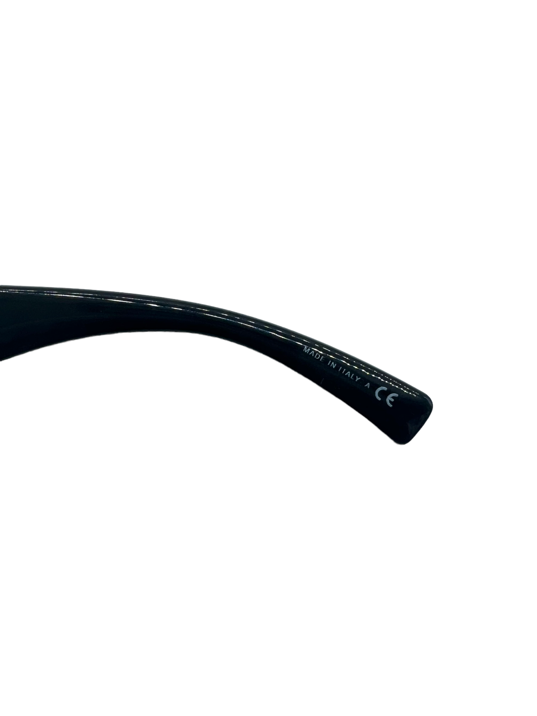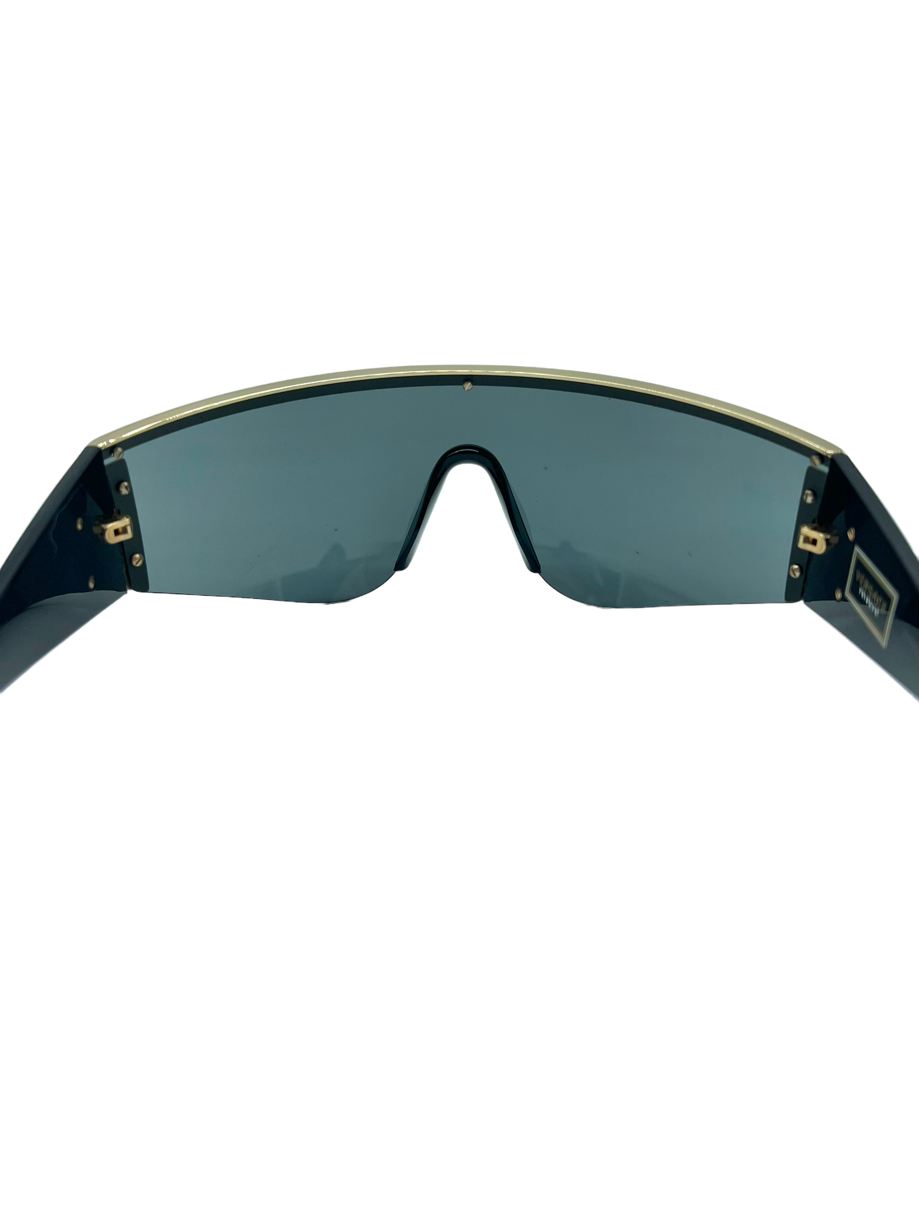 Black Tribute Shield sunglasses with gold trim and Medusa logo on arms. Comes with case and box.