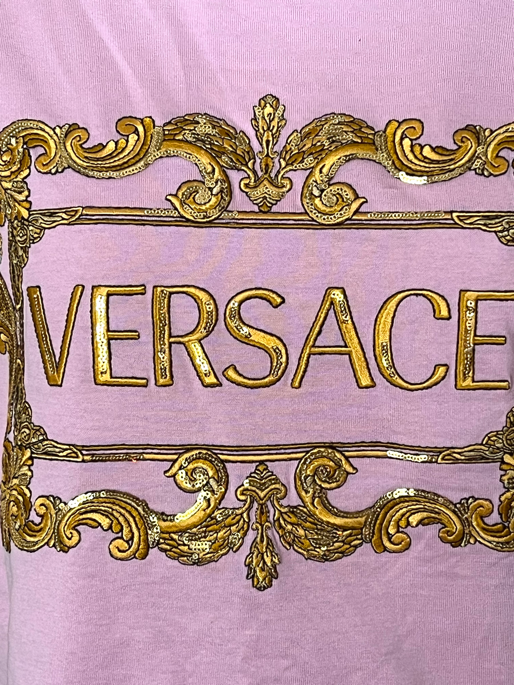Pink and gold Baroque logo t-shirt with sequin detail. Comes with original tags