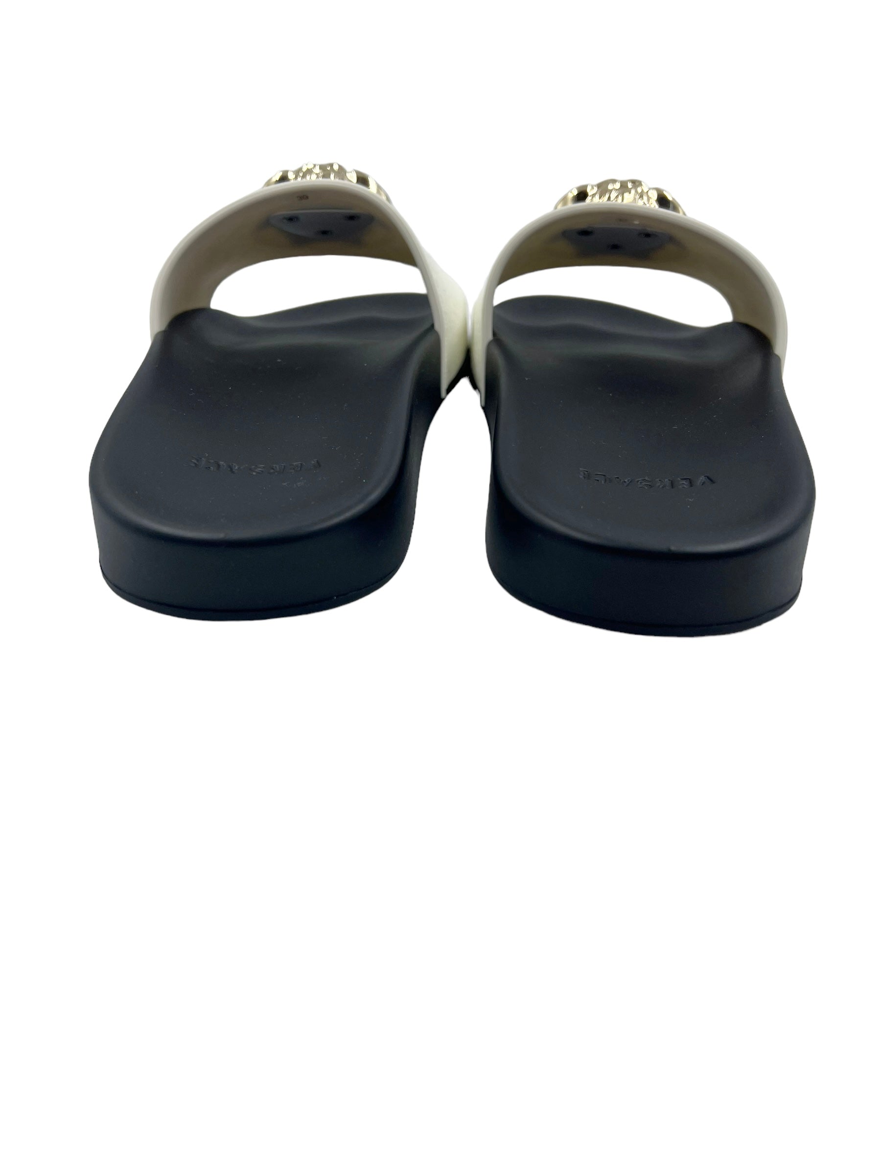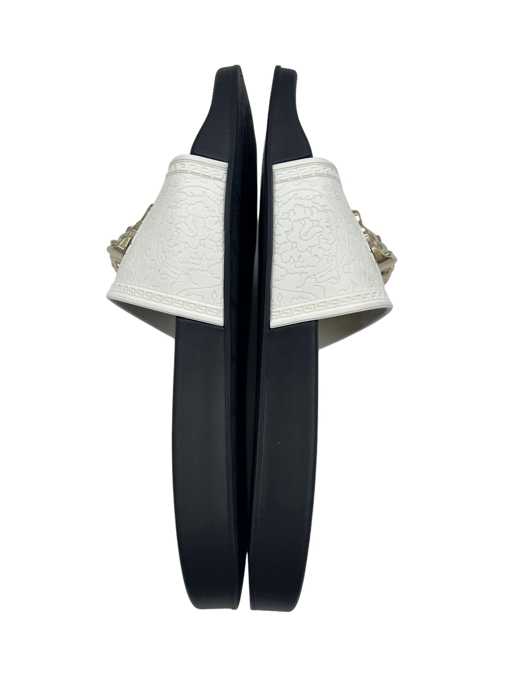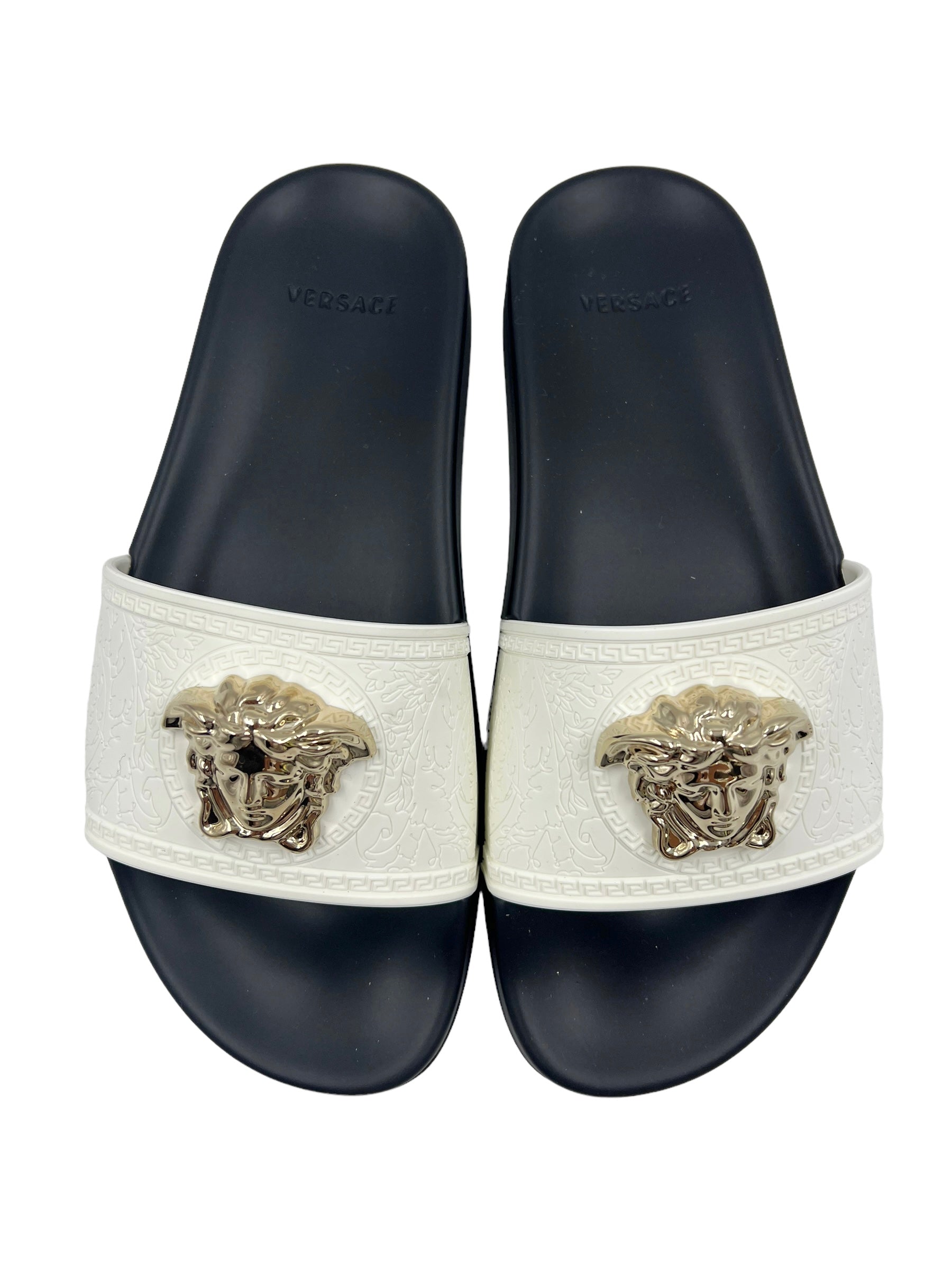 White etched Palazzo pool slides with gold Medusa head hardware. Comes with dust bag and box.