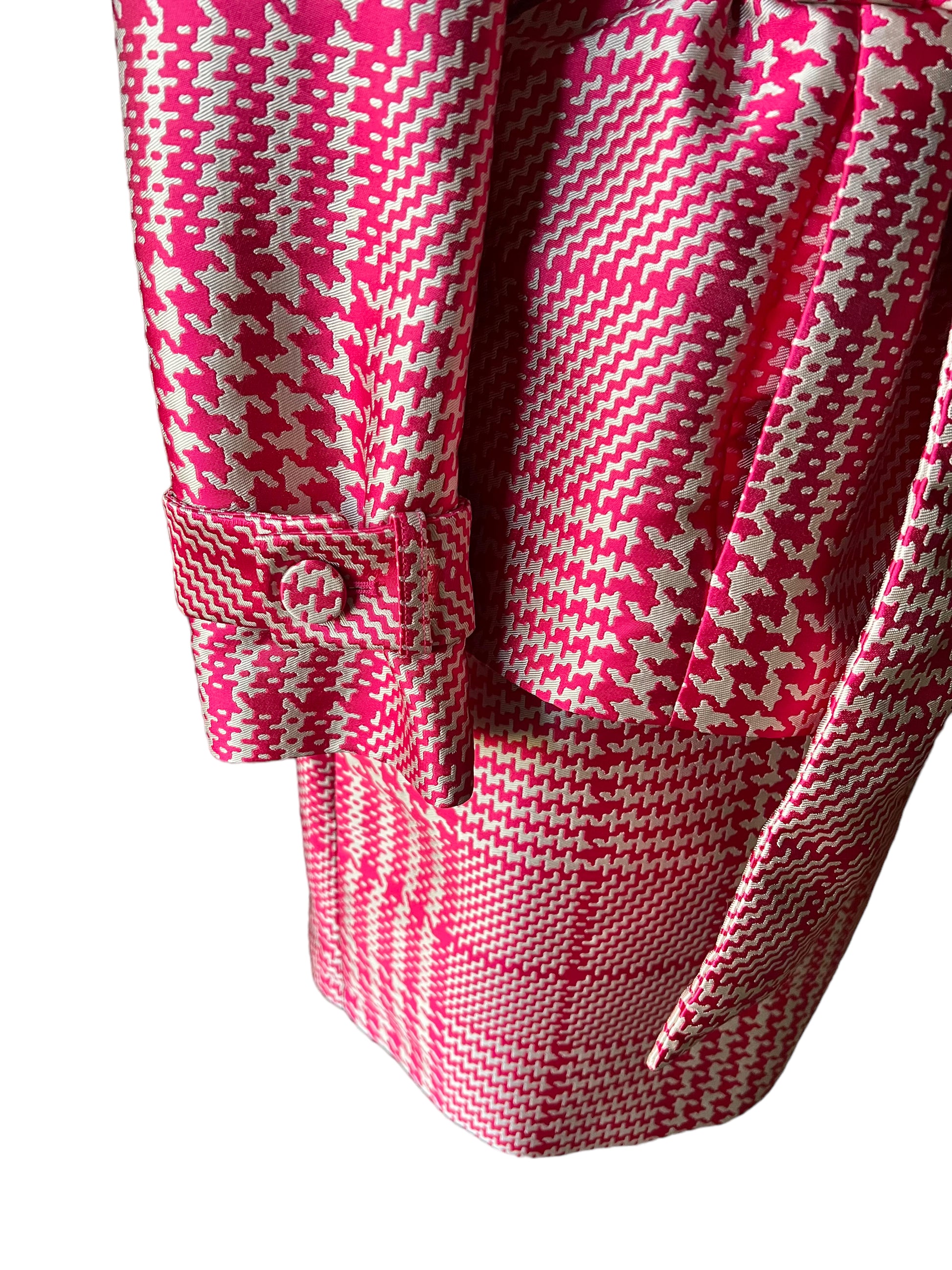 Pink and gray shiny houndstooth print trench coat with matching pencil skirt. Features tie waist, notched lapels, side pockets on jacket and back zip closure on skirt.