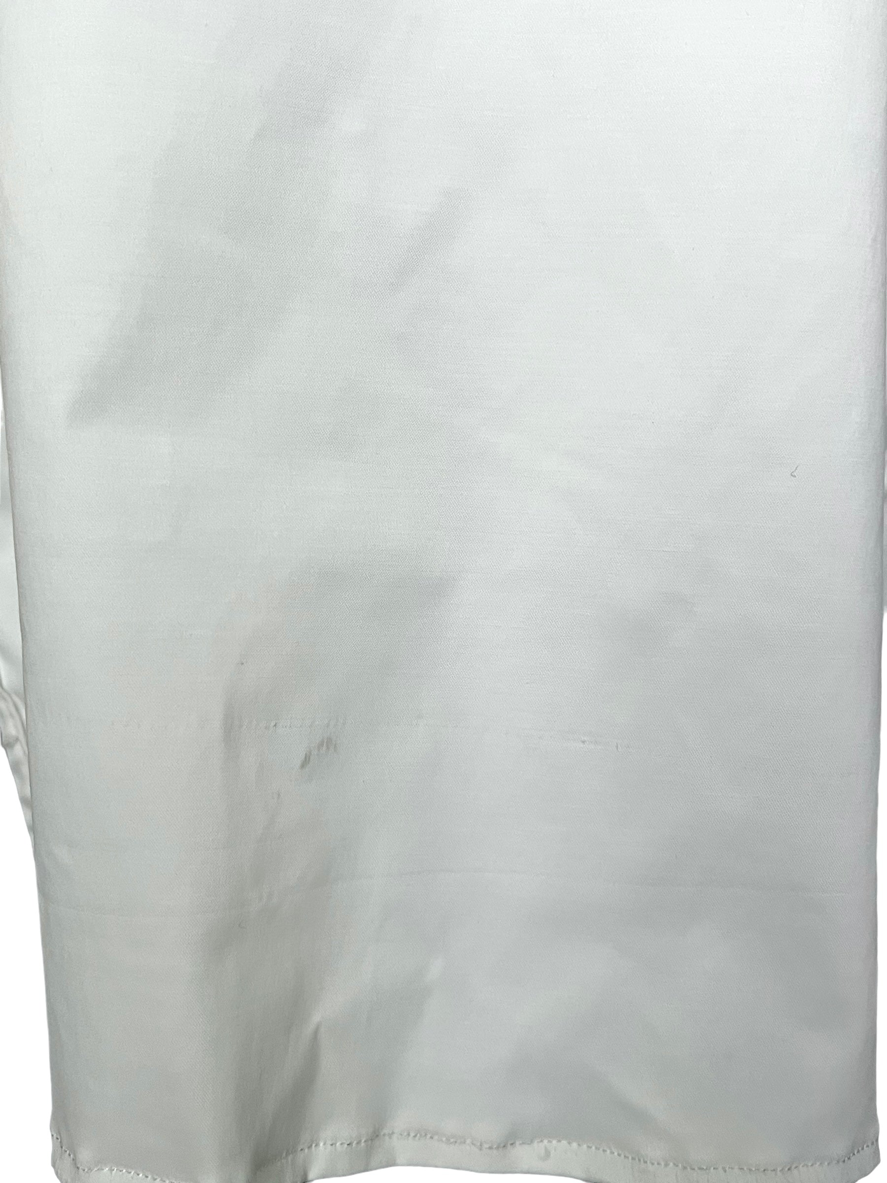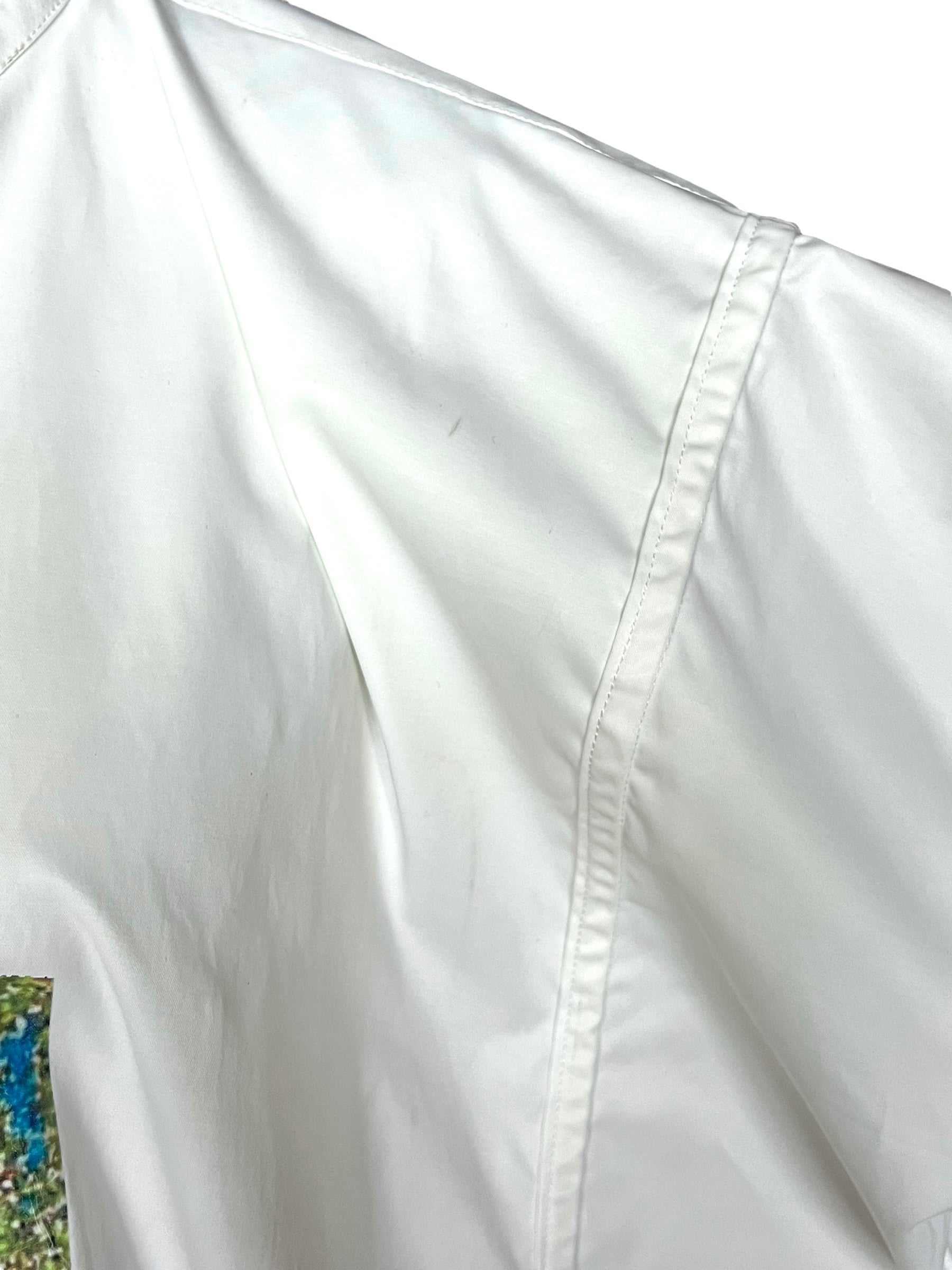 Boutique white nylon/vinyl-like oversized tunic/dress with painted/printed graphic front. Features canvas fabric fringe pockets and snap buttons at neck.
